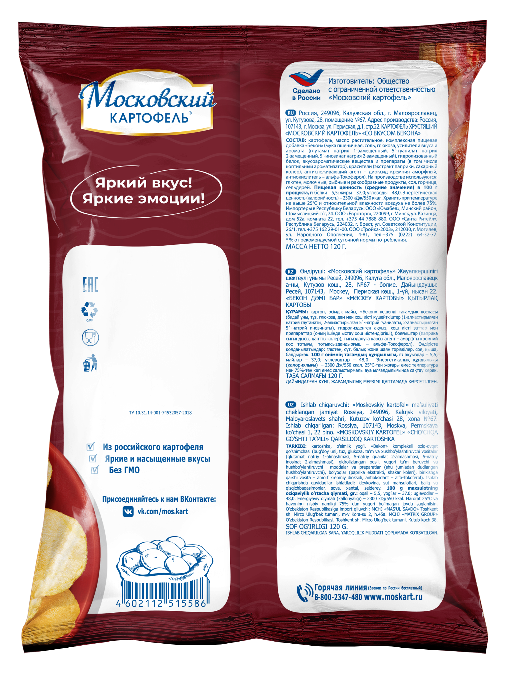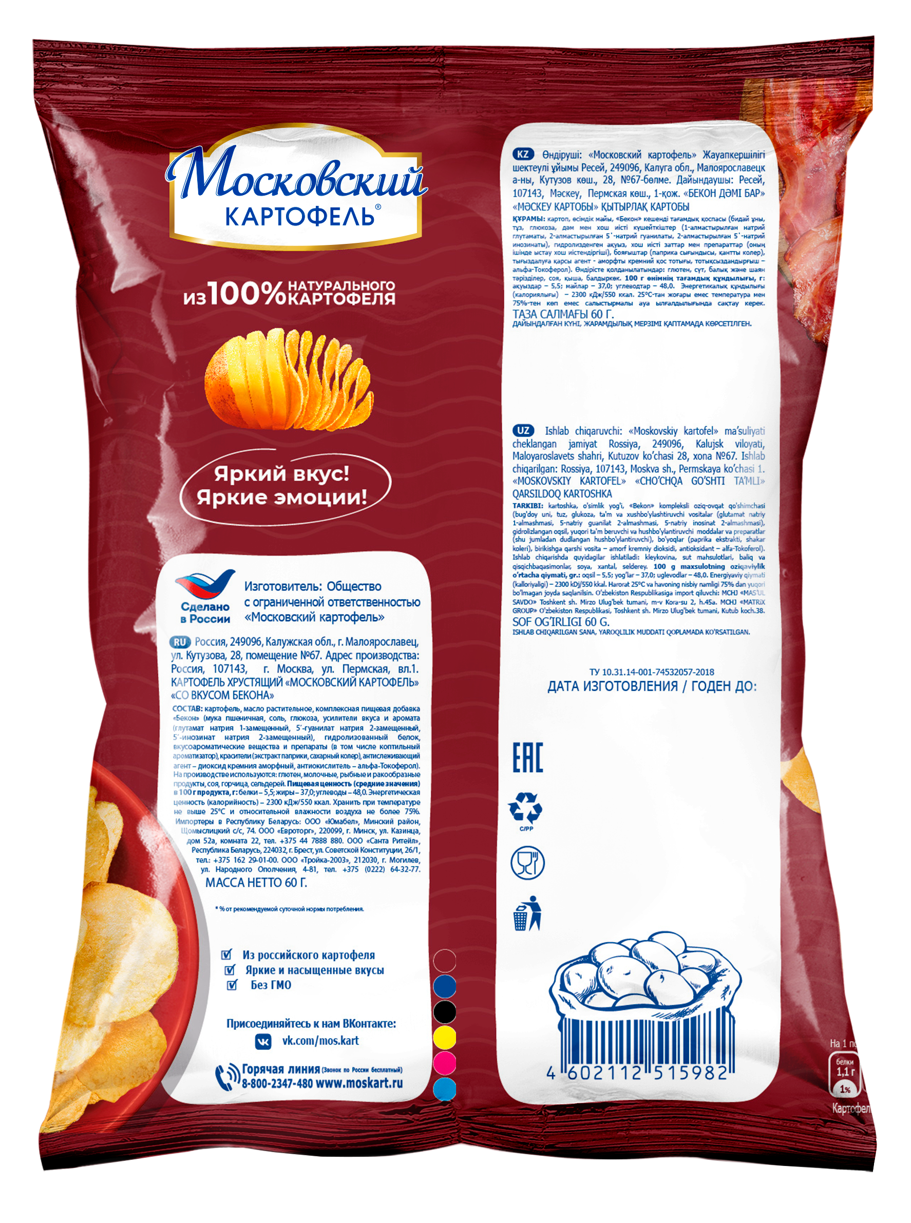 | Московский Картофель | Снеки | Московский картофель: Средняя фасовка | Картофель Московский хруст. cо вкусом бекона 60г/12 уп в кор... | 2601950 | Пакет-подушка |  4602112515982 | 60 | 0,00264 | 163 | 60 | 270 |  |  | 20 | Поджаренный ароматный бекон и золотистый хрустящий картофель... | Готовый продукт.  | картофель, масло растительное, комплексная пищевая добавка "... | 3D Лицевая Оборотная | 550.0 | 5.5 | 37 | 48 | 9 |  | Хранить при температуре не выше 25°С и относительной влажнос... | 12 | гофрокороб |  4602112515999 | 0,72 | 0,98 | 0,02328 | 295 | 385 | 205 | 1 паллета | 96 | 8 | 768 | 64 | 8 | 8 г/к х 8 слоев | 1790 | ООО Москарт | 107143, Россия, Москва г, ул. Пермская вл. 1 | ЕАЭС N RU Д-RU.РА04.В.23845/25 | 12.05.2025 - 01.12.2027 | соответствует требованиям ТУ 10.31.14-001-74532057-2018 | Скачать | 2005202000 | 10.31.14.000 |