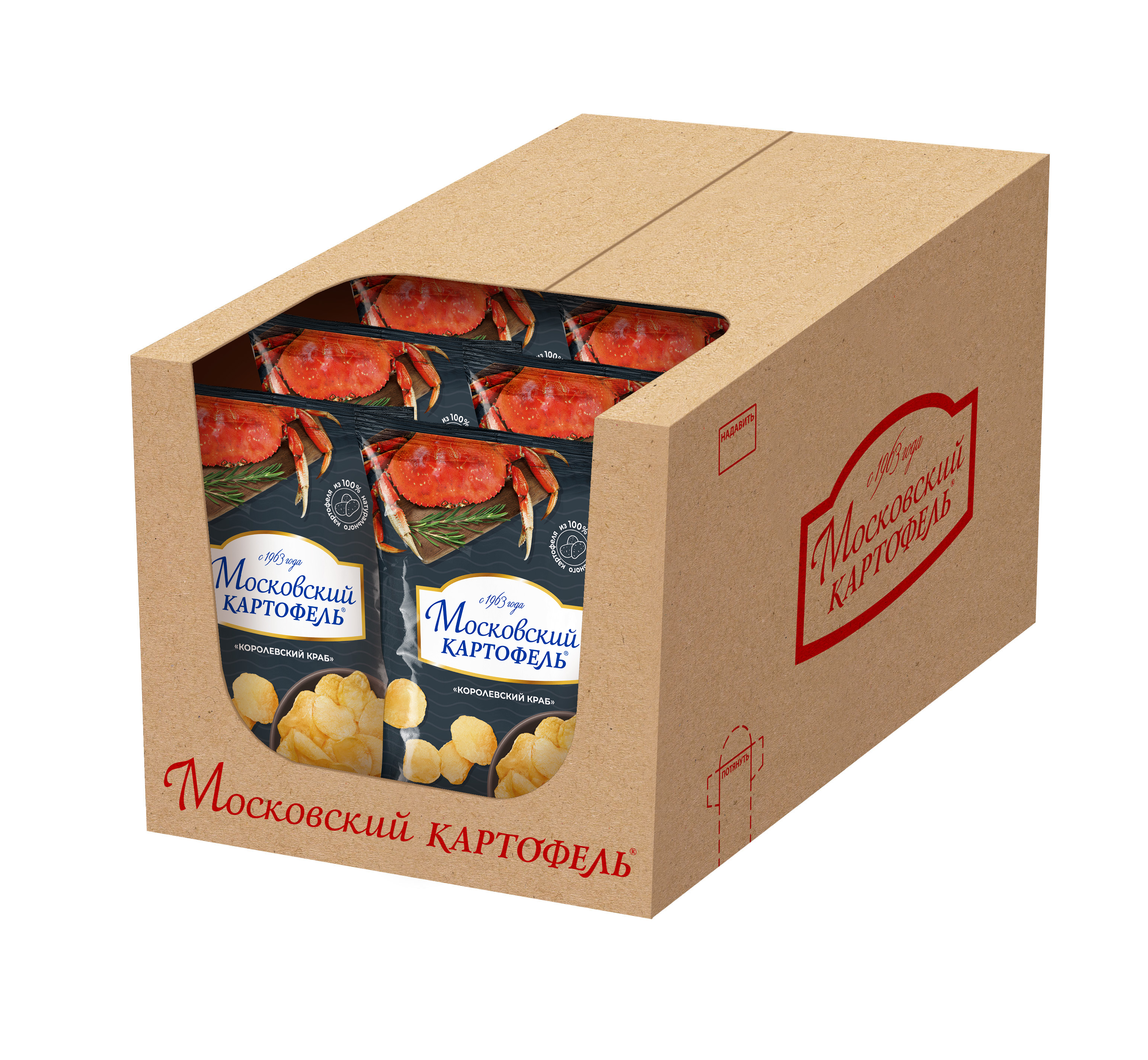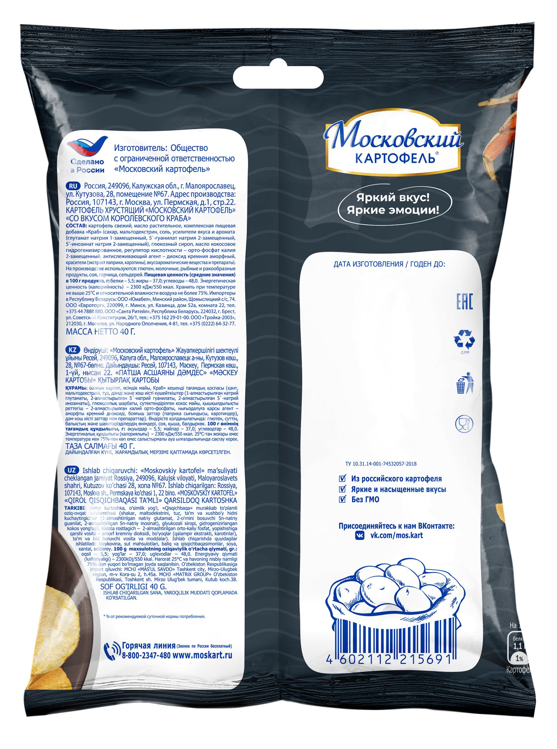 | Московский Картофель | Снеки | Московский картофель: Мелкая фасовка | Картофель Московский хруст. со вкусом королевского краба 40 ... | 2601987 | Пакет-подушка |  4602112215691 | 40 | 0,00235 | 163 | 60 | 240 |  |  | 20 | Отличное сочетание вкуса краба и натуральной хрустящей карто... | Готовый продукт.  | картофель, масло растительное, комплексная пищевая добавка "... | 3D Лицевая Оборотная | 550.0 | 5.5 | 37 | 48 | 9 |  | Хранить при температуре не выше 25°С и относительной влажнос... | 28 | гофрокороб |  4602112215707 | 1,12 | 1,55 | 0,04054 | 585 | 385 | 180 | 1 паллета | 112 | 4 | 1008 | 36 | 9 | 4 г/к х 9 слоев | 1770 | ООО Москарт | 107143, Россия, Москва г, ул. Пермская вл. 1 | ЕАЭС N RU Д-RU.РА04.В.23845/25 | 12.05.2025 - 01.12.2027 | соответствует требованиям ТУ 10.31.14-001-74532057-2018 | Скачать | 2005202000 | 10.31.14.000 |