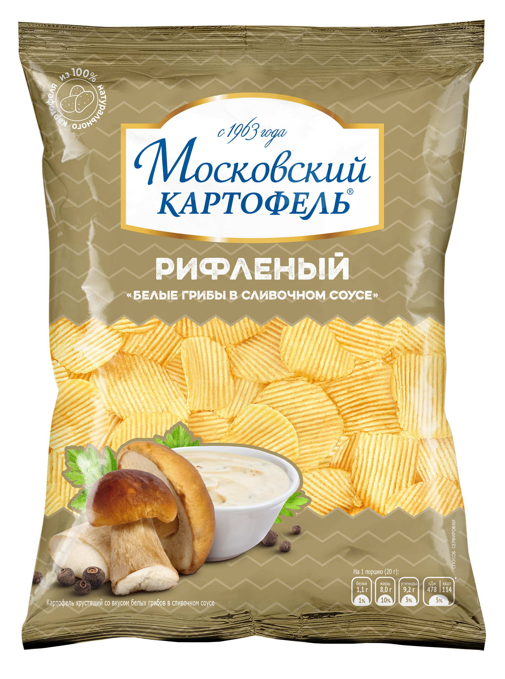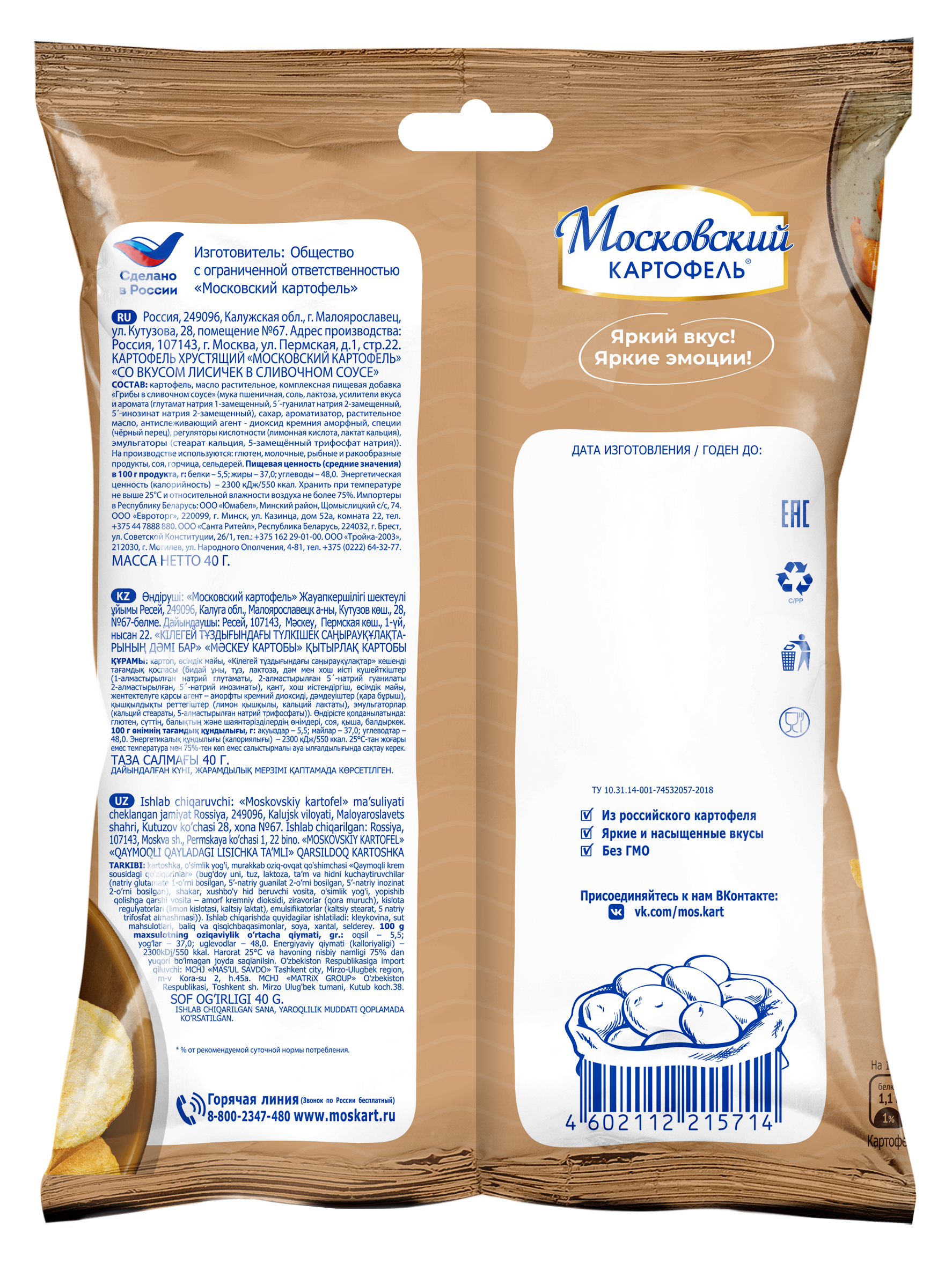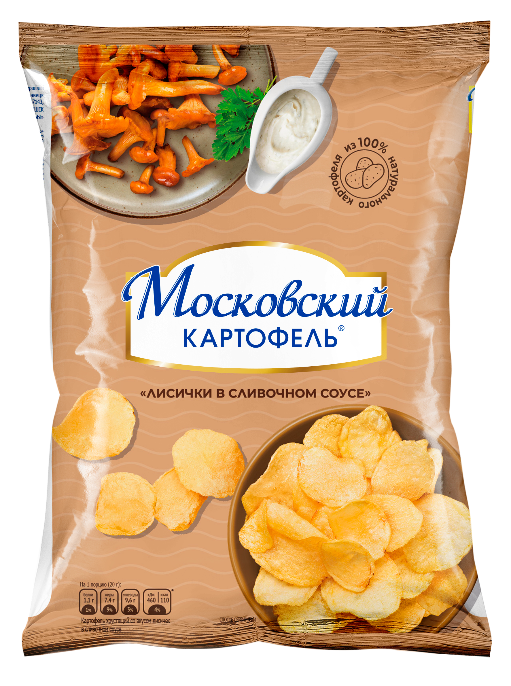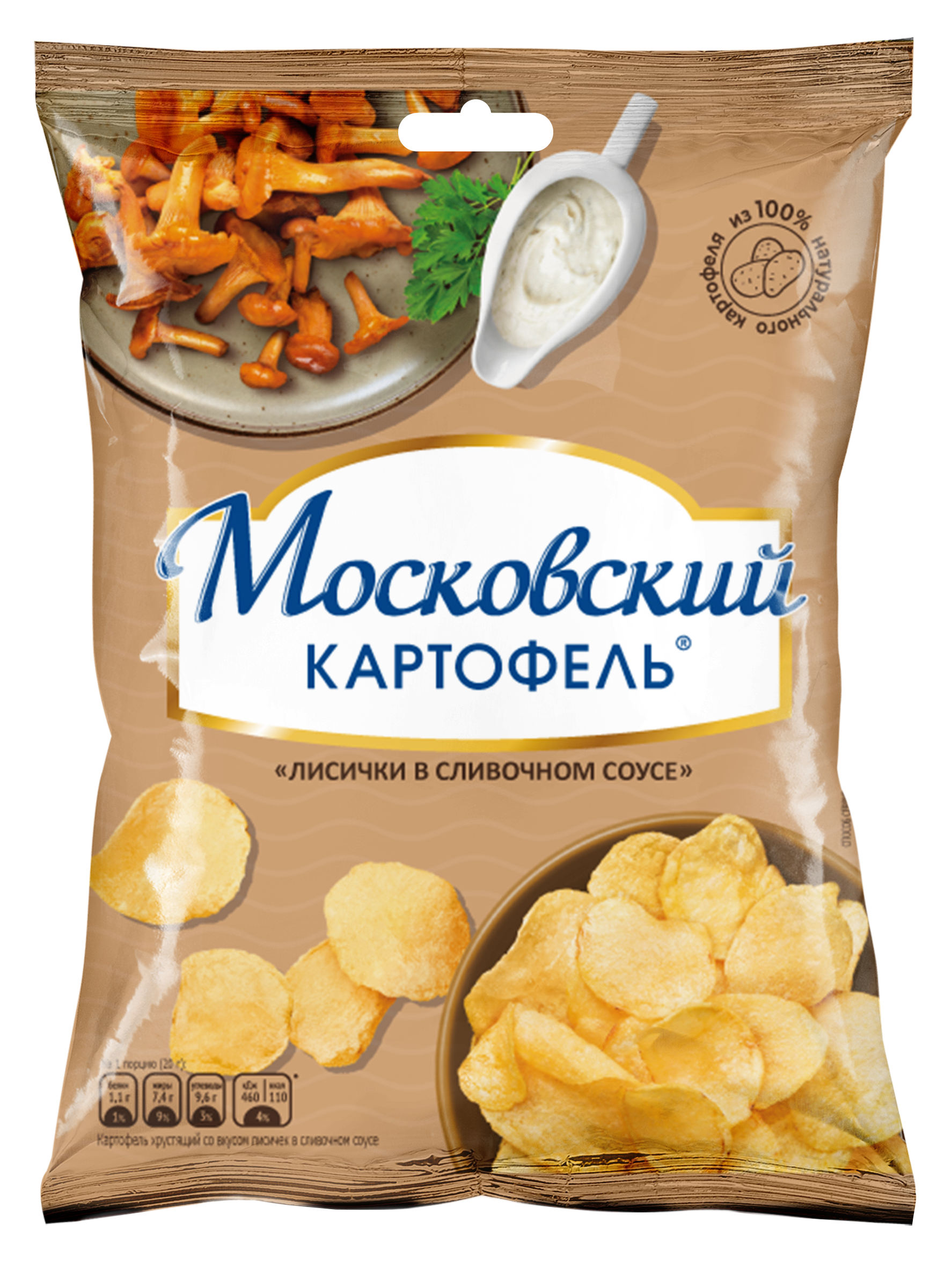 | Московский Картофель | Снеки | Московский картофель: Мелкая фасовка | Картофель Московский хруст. со вкусом лисичек в сливочном со... | 2601991 | Пакет-подушка |  4602112215714 | 40 | 0,00235 | 163 | 60 | 240 |  |  | 20 | Хрустящая золотистая картошка и ароматные грибы в сливочном ... | Готовый продукт.