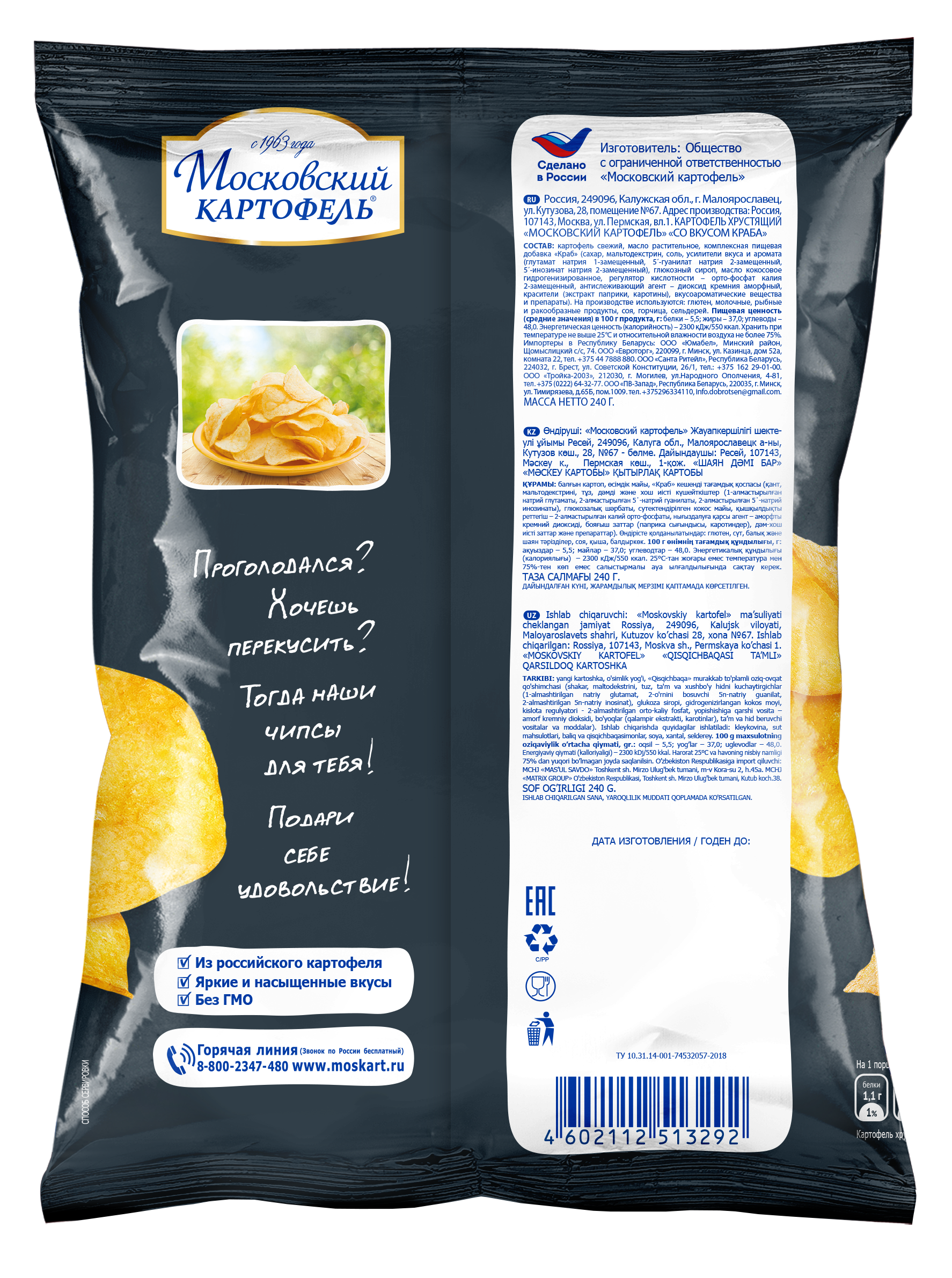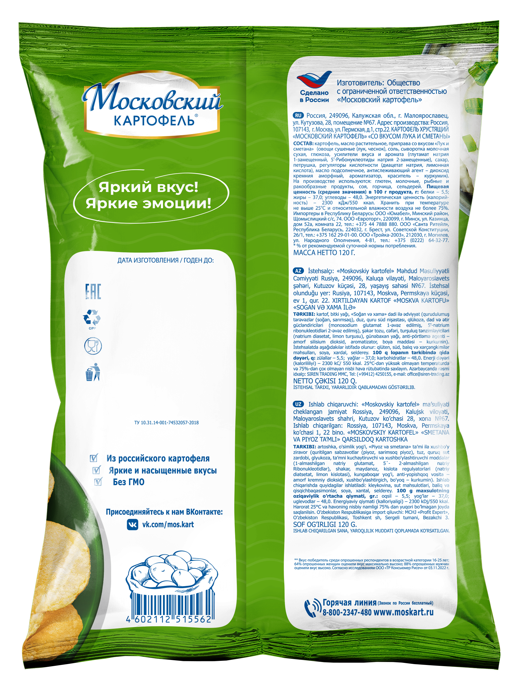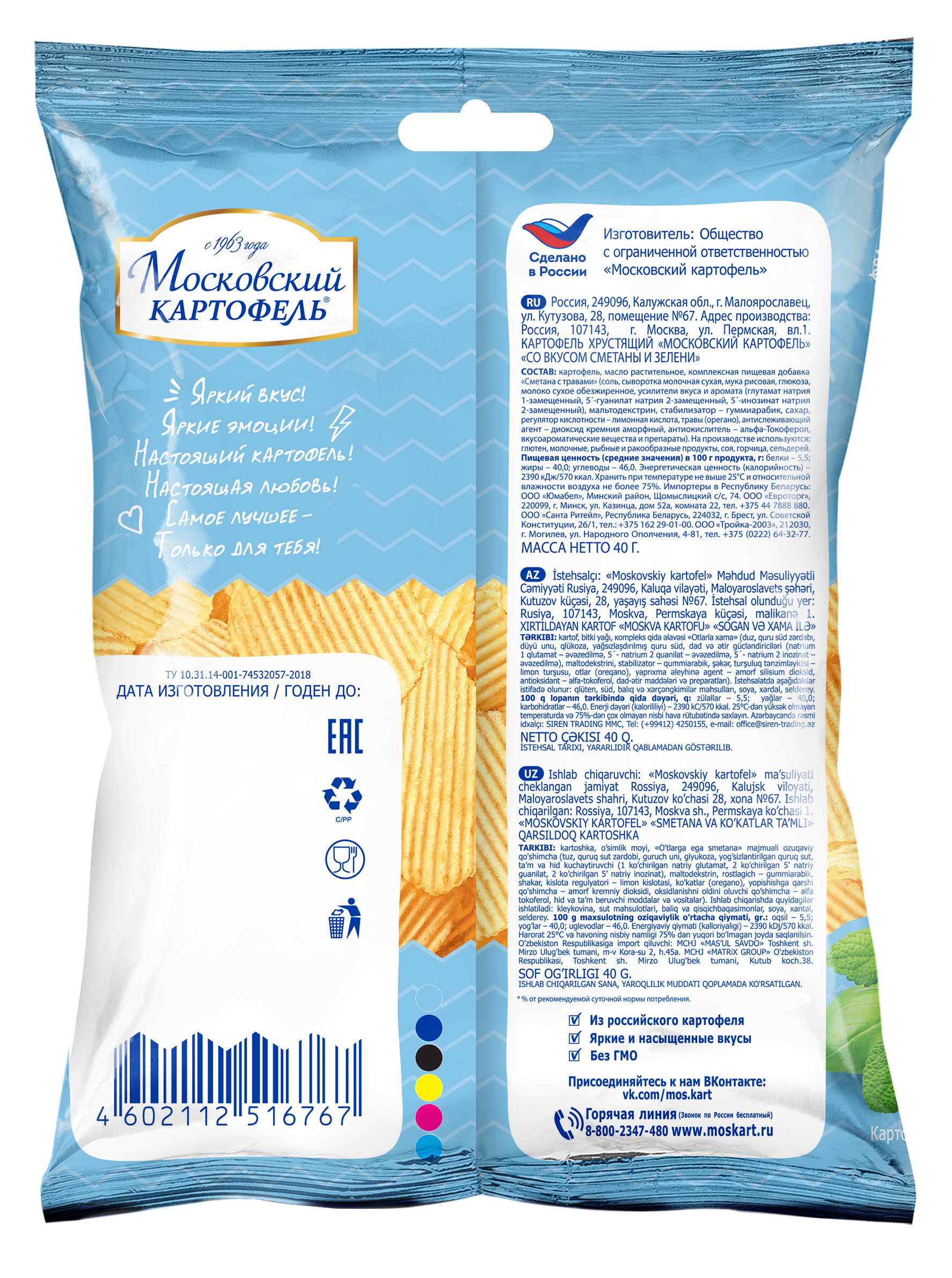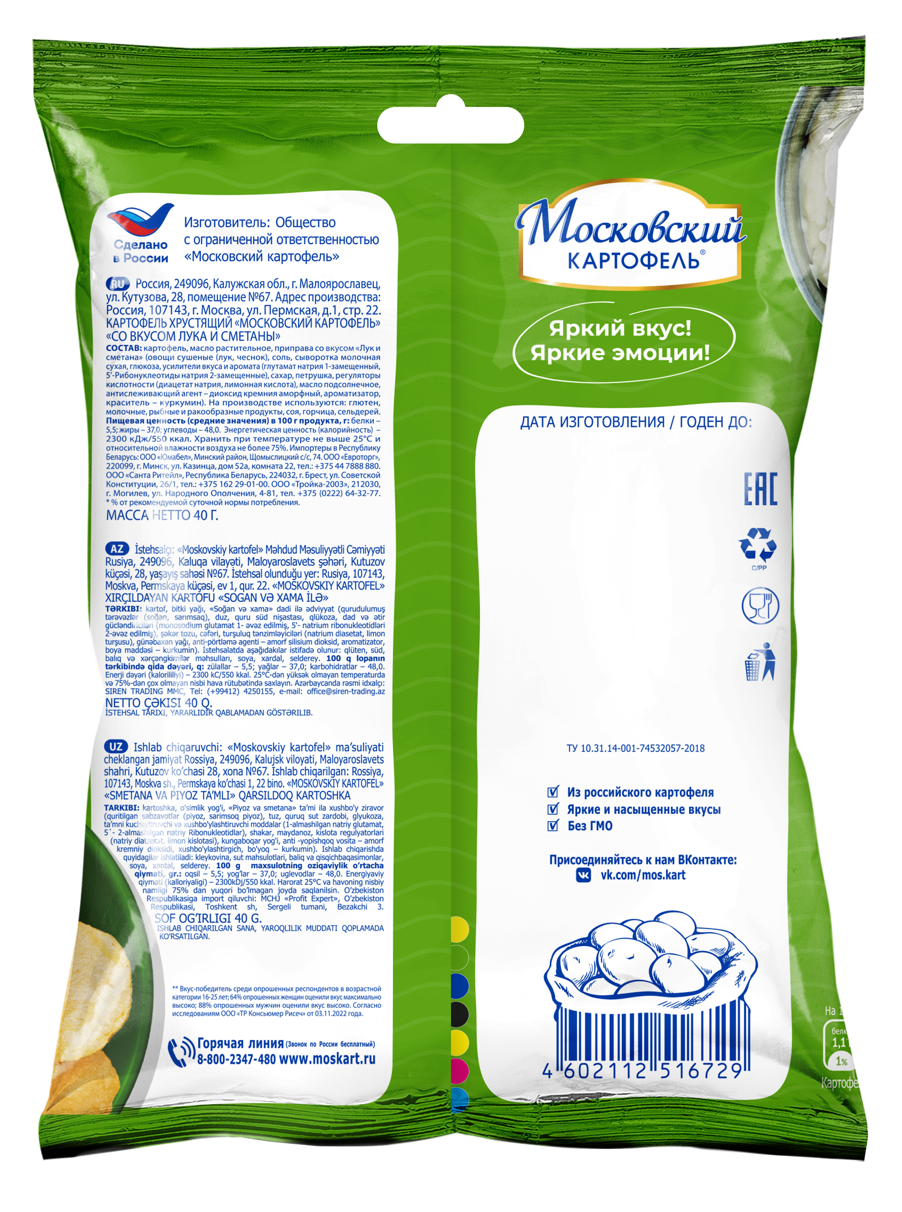 | Московский Картофель | Снеки | Московский картофель: Мелкая фасовка | Картофель Московский хруст. со вкусом лука и сметаны 40г/28 ... | 2601924 | Пакет-подушка |  4602112516729 | 40 | 0,00215 | 163 | 55 | 240 |  |  | 20 | Поджаренный хрустящий картофель, нежная сметана и ароматный ... | Готовый продукт | картофель, масло растительное, приправа со вкусом "Лук и сме... | 3D Лицевая Оборотная | 550.0 | 5.5 | 37 | 48 | 9 |  | Хранить при температуре не выше 25°С и относительной влажнос... | 28 | гофрокороб |  4602112516736 | 1,12 | 1,55 | 0,04054 | 585 | 385 | 180 | 1 паллета | 112 | 4 | 1008 | 36 | 9 | 4 г/к х 9 слоев | 1770 | ООО Москарт | 107143, Россия, Москва г, ул. Пермская вл. 1 | ЕАЭС N RU Д-RU.РА04.В.23845/25 | 12.05.2025 - 01.12.2027 | соответствует требованиям ТУ 10.31.14-001-74532057-2018 | Скачать | 2005202000 | 10.31.14.000 |