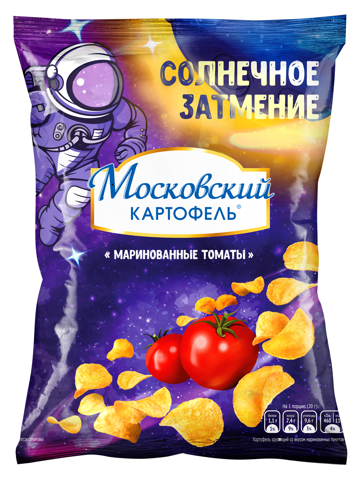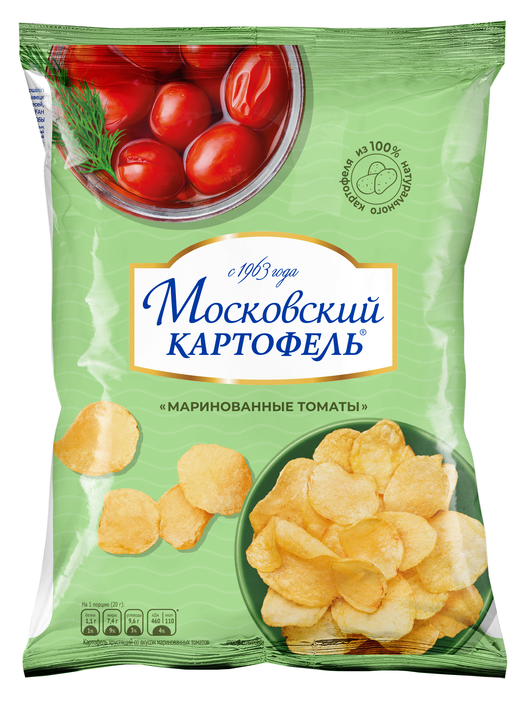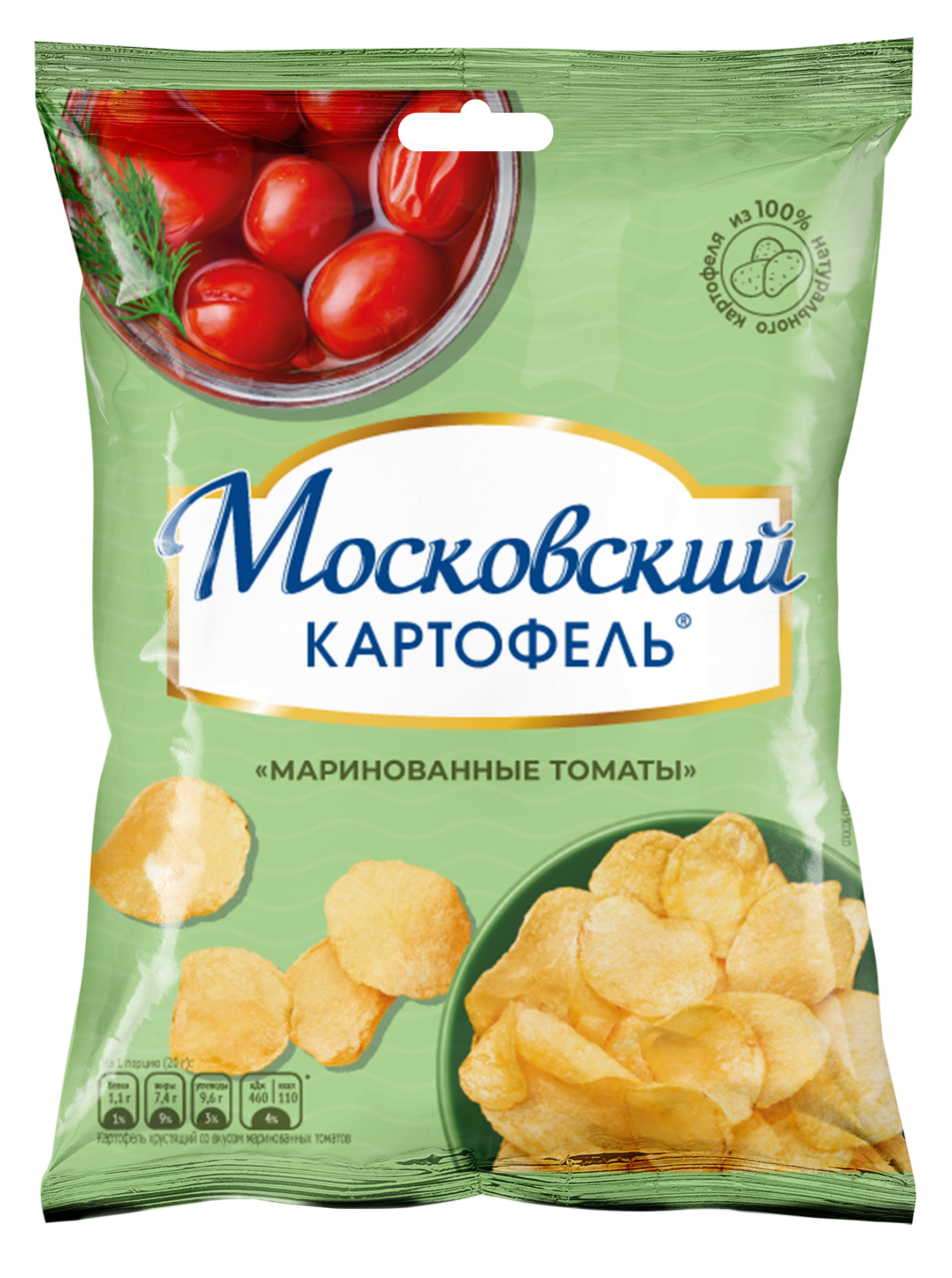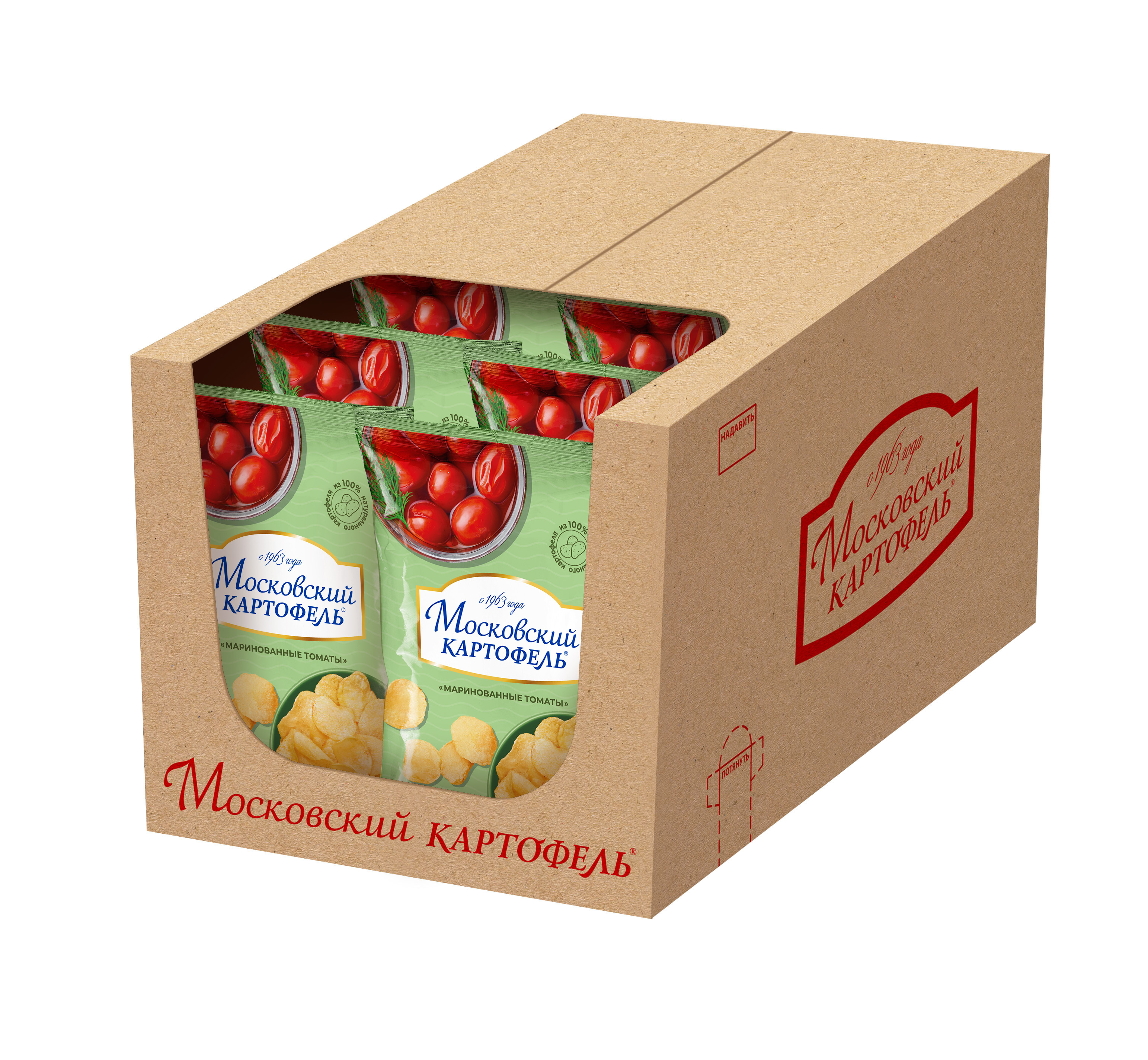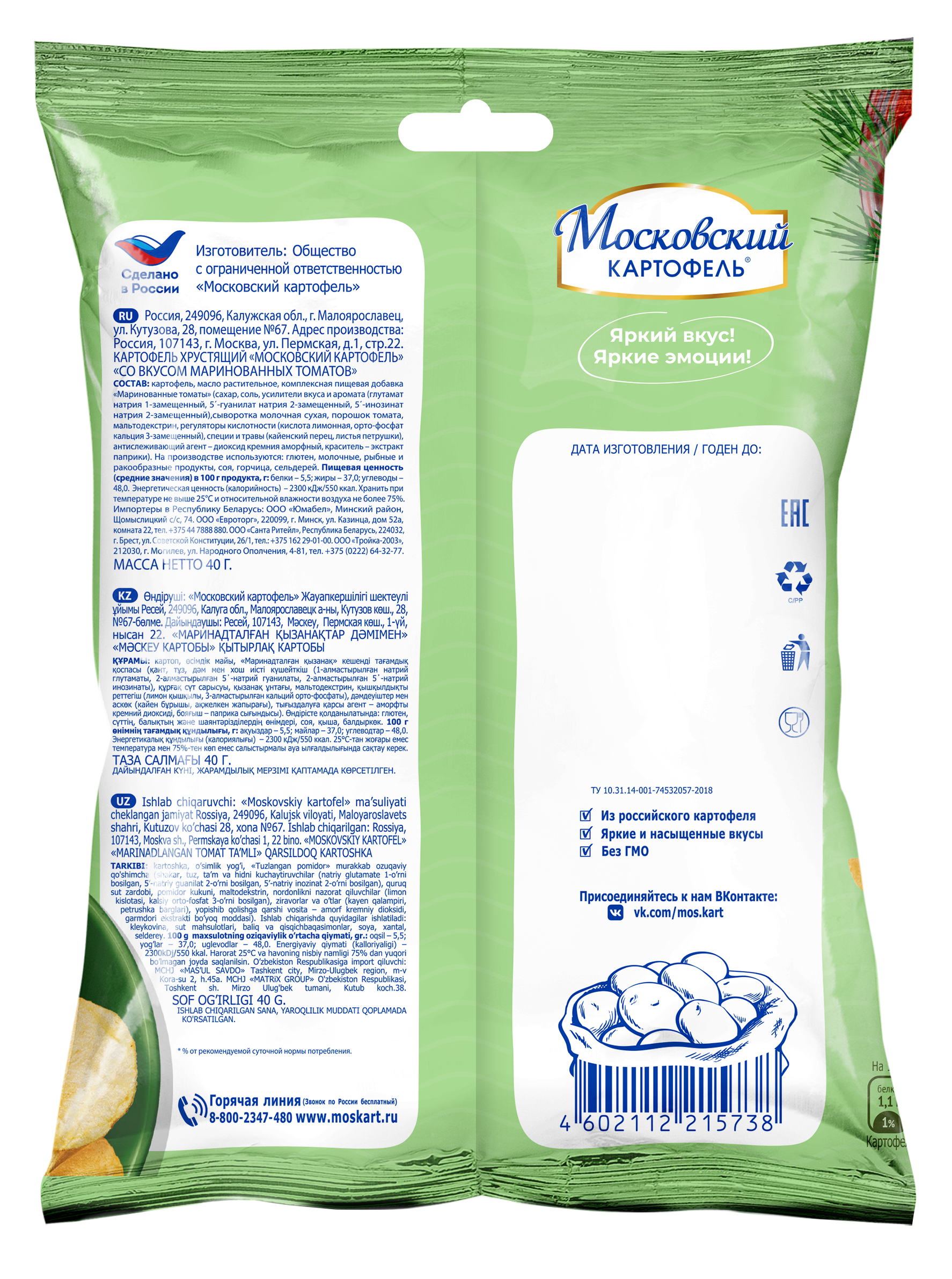 | Московский Картофель | Снеки | Московский картофель: Мелкая фасовка | Картофель Московский хруст. со вкусом маринованных томатов 4... | 2601996 | Пакет-подушка |  4602112215738 | 40 | 0,00235 | 163 | 60 | 240 |  |  | 20 | Жареная картошка с маринованными томатами - аппетитное блюдо... |  Готовый продукт.  | картофель, масло растительное, комплексная пищевая добавка "... | 3D Лицевая Оборотная | 550.0 | 5.5 | 37 | 48 | 9 |  | Хранить при температуре не выше 25°С и относительной влажнос... | 28 | гофрокороб |  4602112215745 | 1,12 | 1,55 | 0,04054 | 585 | 385 | 180 | 1 паллета | 112 | 4 | 1008 | 36 | 9 | 4 г/к х 9 слоев | 1770 | ООО Москарт | 107143, Россия, Москва г, ул. Пермская вл. 1 | ЕАЭС N RU Д-RU.РА04.В.23845/25 | 12.05.2025 - 01.12.2027 | соответствует требованиям ТУ 10.31.14-001-74532057-2018 | Скачать | 2005202000 | 10.31.14.000 |