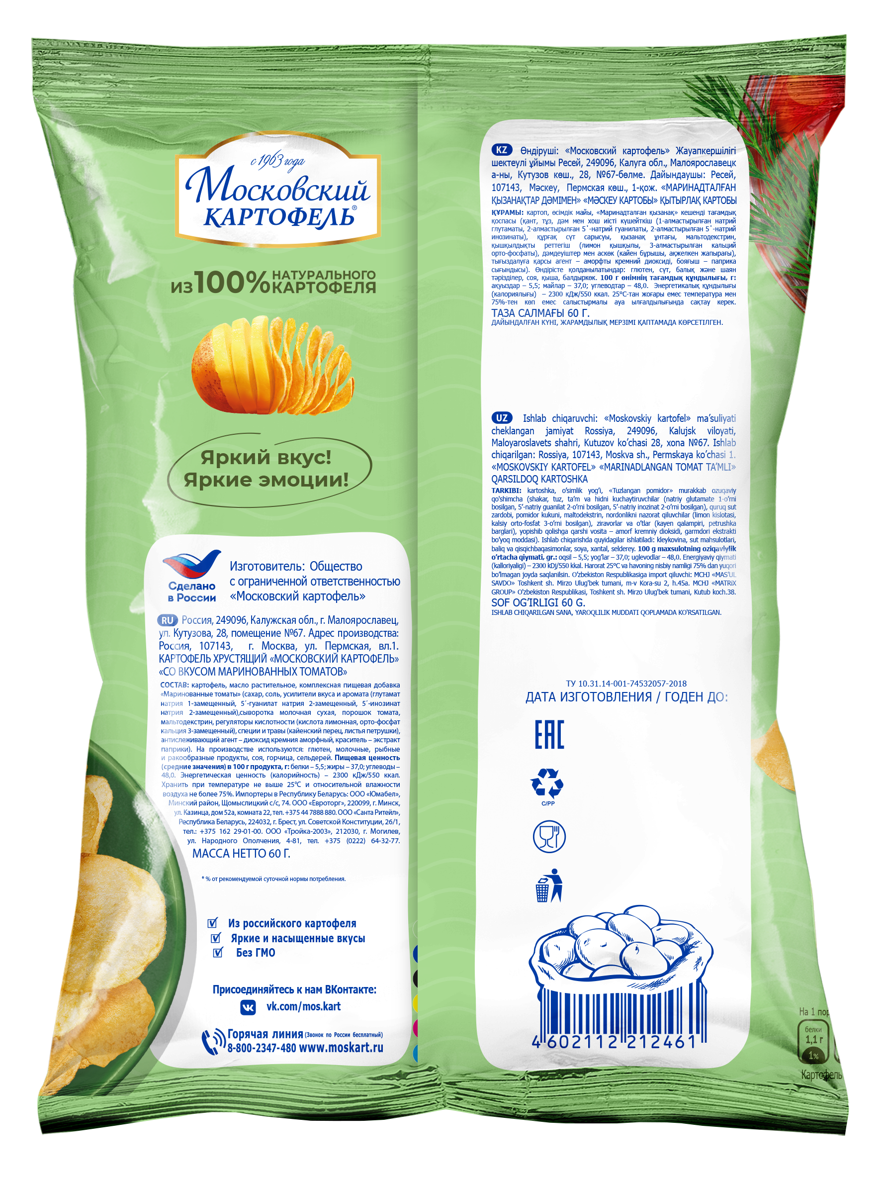 | Московский Картофель | Снеки | Московский картофель: Средняя фасовка | Картофель Московский хруст. со вкусом маринованных томатов 6... | 2601997 | Пакет-подушка |  4602112212461 | 60 | 0,00264 | 163 | 60 | 270 |  |  | 20 | Жареная картошка с маринованными томатами - аппетитное блюдо... | Готовый продукт. | картофель, масло растительное, комплексная пищевая добавка "... | 3D Лицевая Оборотная Групповая уп | 550.0 | 5.5 | 37 | 48 | 9 |  | Хранить при температуре не выше 25°С и относительной влажнос... | 12 | гофрокороб |  4602112213239 | 0,72 | 0,98 | 0,02328 | 295 | 385 | 205 | 1 паллета | 96 | 8 | 768 | 64 | 8 | 8 г/к х 8 слоев | 1790 | ООО Москарт | 107143, Россия, Москва г, ул. Пермская вл. 1 | ЕАЭС N RU Д-RU.РА04.В.23845/25 | 12.05.2025 - 01.12.2027 | соответствует требованиям ТУ 10.31.14-001-74532057-2018 | Скачать | 2005202000 | 10.31.14.000 |