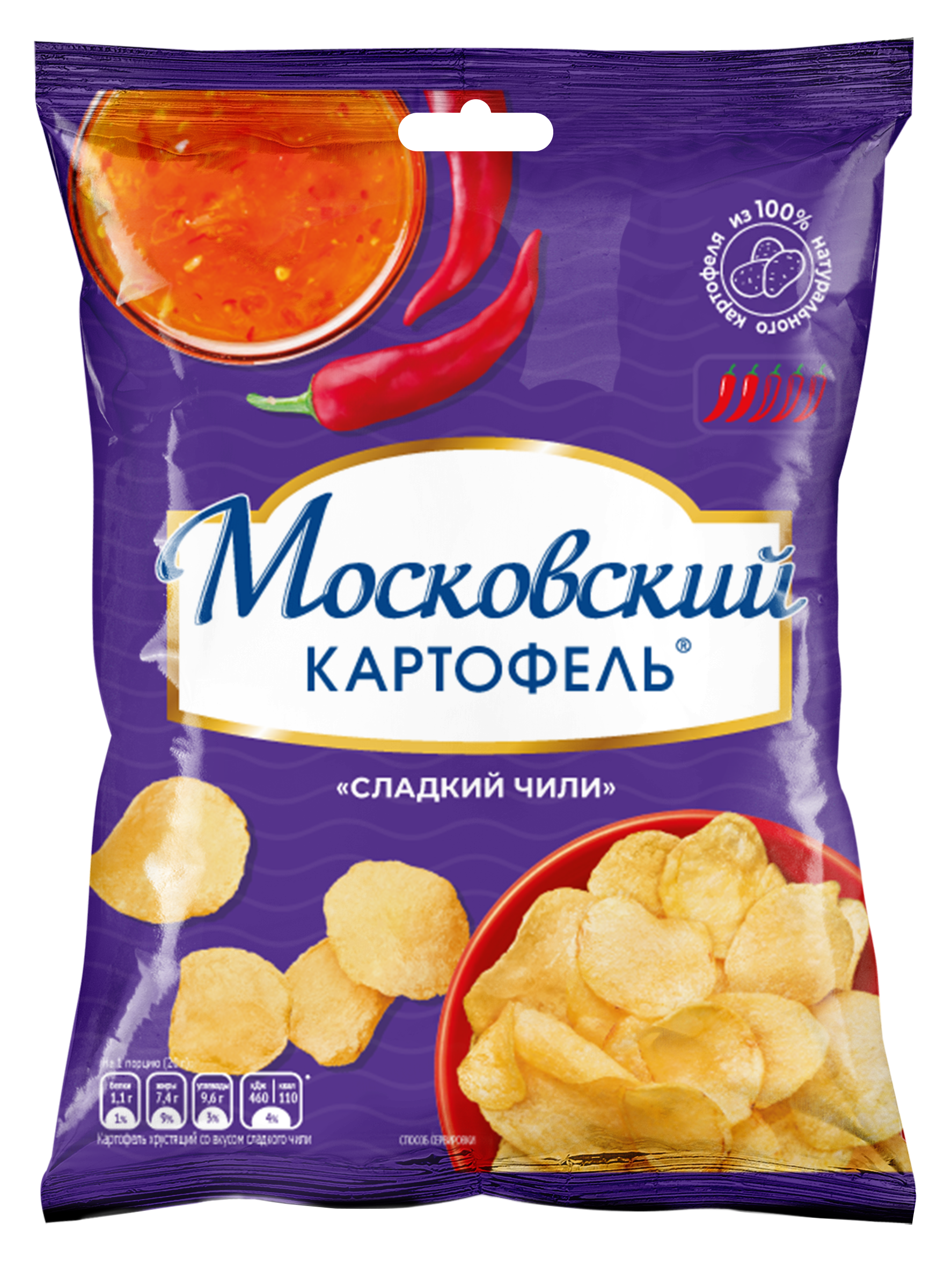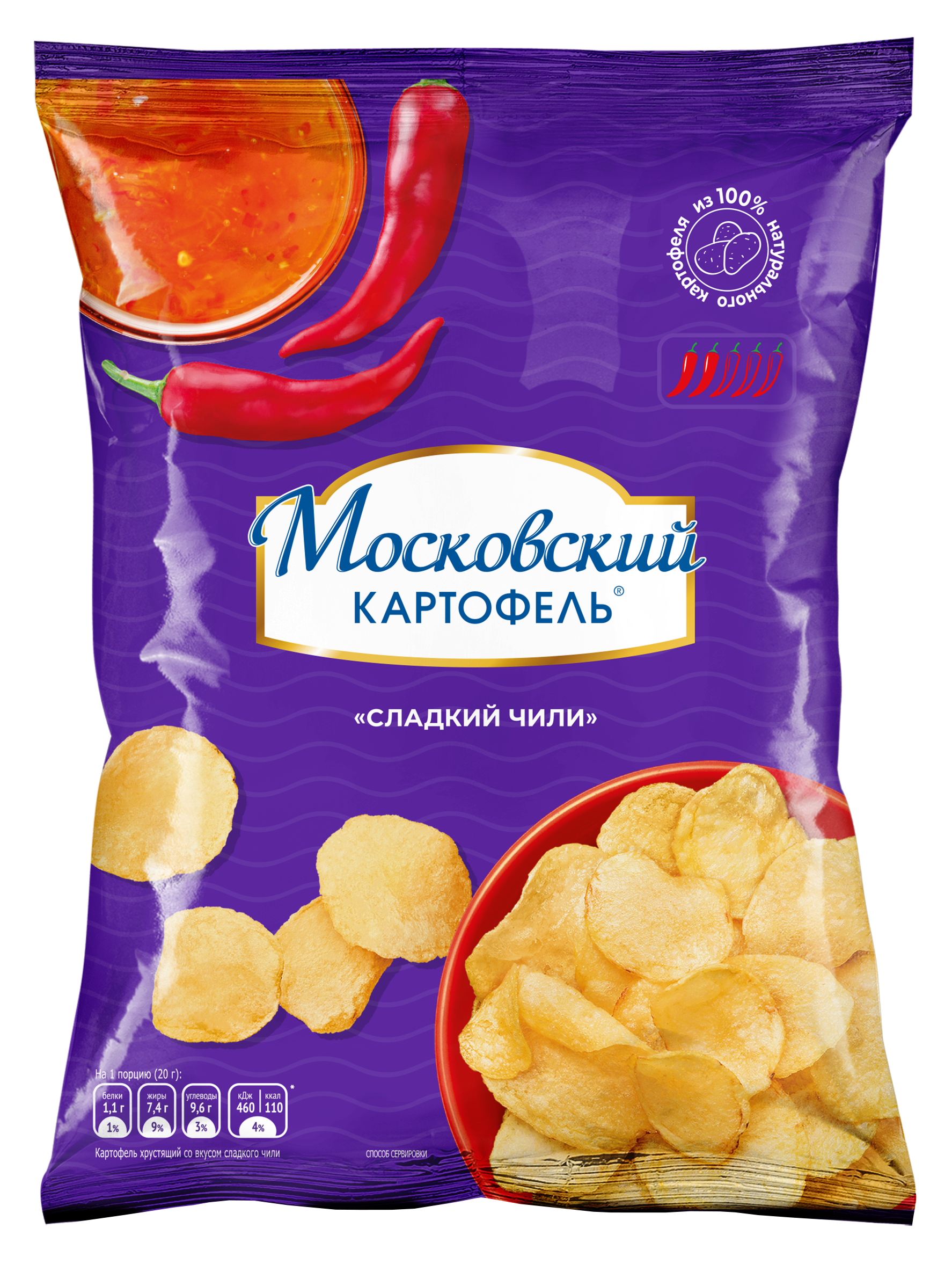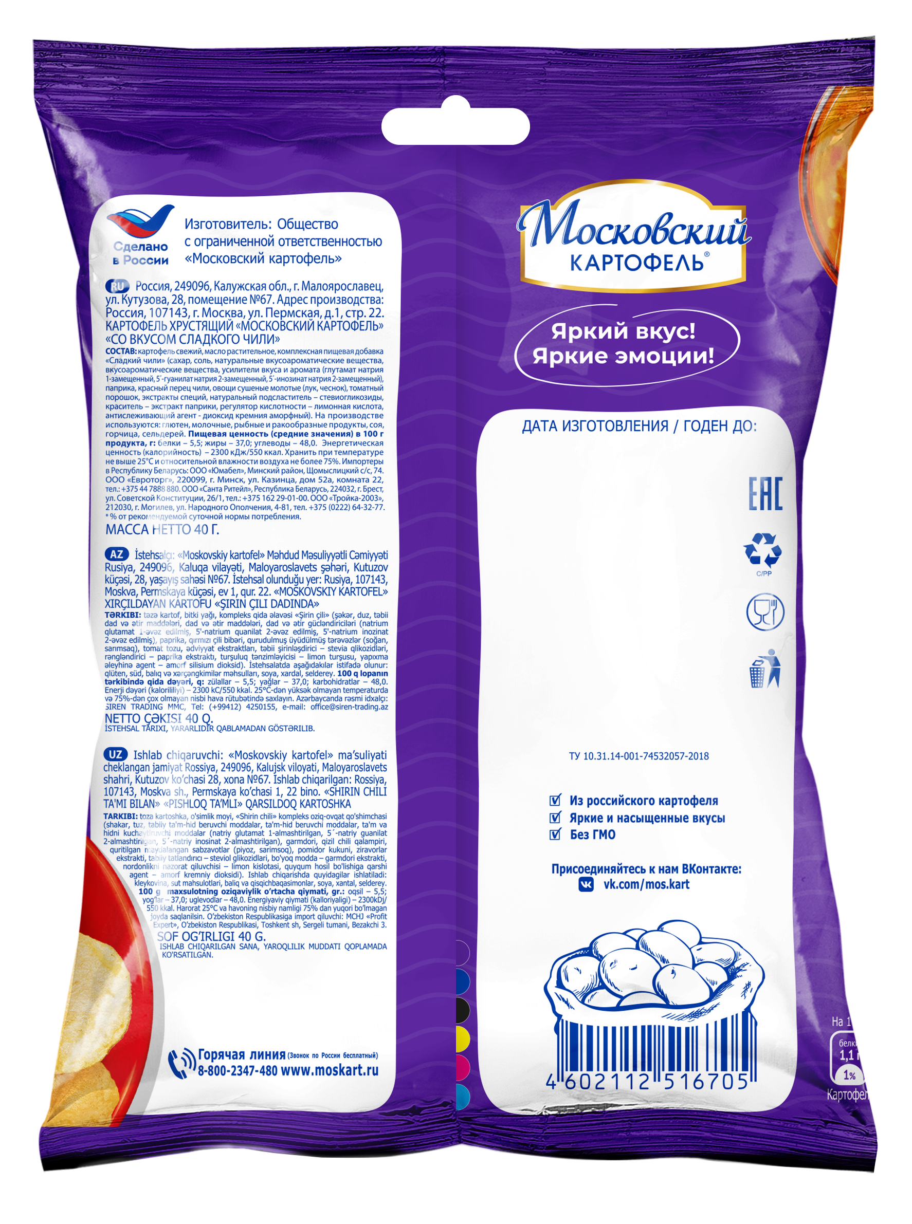 | Московский Картофель | Снеки | Московский картофель: Мелкая фасовка | Картофель Московский хруст. со вкусом сладкого чили 40г/28 у... | 2601922 | Пакет-подушка |  4602112516705 | 40 | 0,00215 | 163 | 55 | 240 |  |  | 20 | Натуральный картофель в объятиях сладкого соуса чили - пикан... | Готовый продукт | картофель свежий, масло растительное, комплексная пищевая до... | 3D Лицевая Оборотная | 550.0 | 5.5 | 37 | 48 | 9 |  | Хранить при температуре не выше 25°С и относительной влажнос... | 28 | гофрокороб |  4602112516712 | 1,12 | 1,55 | 0,04054 | 585 | 385 | 180 | 1 паллета | 112 | 4 | 1008 | 36 | 9 | 4 г/к х 9 слоев | 1770 | ООО Москарт | 107143, Россия, Москва г, ул. Пермская вл. 1 | ЕАЭС N RU Д-RU.РА04.В.01255/24 | 03.05.2024 - 02.05.2027 | соответствует требованиям ТУ10.31.14-001-74532057-2018 | Скачать | 2005202000 | 10.31.14.000 |