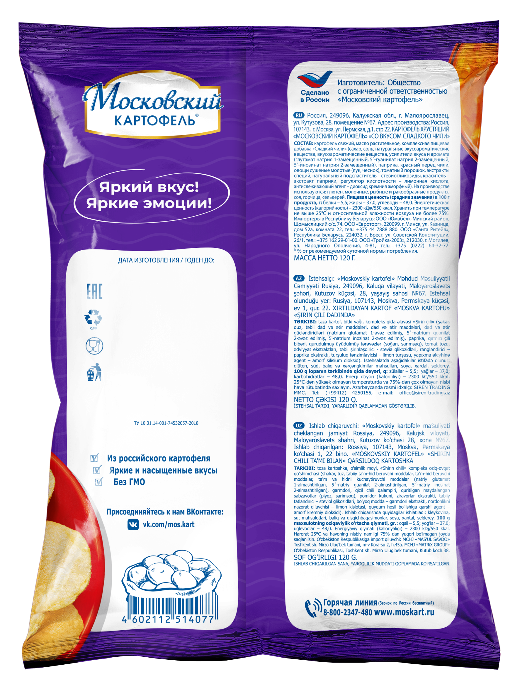| Московский Картофель | Снеки | Московский картофель: Большая фасовка | Картофель Московский хруст. со вкусом сладкого чили 120г/16 ... | 2601998 | Пакет-подушка |  4602112514077 | 120 | 0,00553 | 205 | 90 | 300 |  |  | 20 | Натуральный картофель в объятиях сладкого соуса чили - пикан... | Готовый продукт. | картофель свежий, масло растительное, комплексная пищевая до... | 3D Лицевая Оборотная | 550.0 | 5.5 | 37 | 48 | 9 |  | Хранить при температуре не выше 25°С и относительной влажнос... | 16 | гофрокороб |  4602112514084 | 1,92 | 2,28 | 0,04955 | 585 | 385 | 220 | 1 паллета | 64 | 4 | 448 | 28 | 7 | 4 г/к х 7 слоев | 1690 | ООО Москарт | 107143, Россия, Москва г, ул. Пермская вл. 1 | ЕАЭС N RU Д-RU.РА04.В.01255/24 | 03.05.2024 - 02.05.2027 | соответствует требованиям ТУ10.31.14-001-74532057-2018 | Скачать | 2005202000 | 10.31.14.000 |
