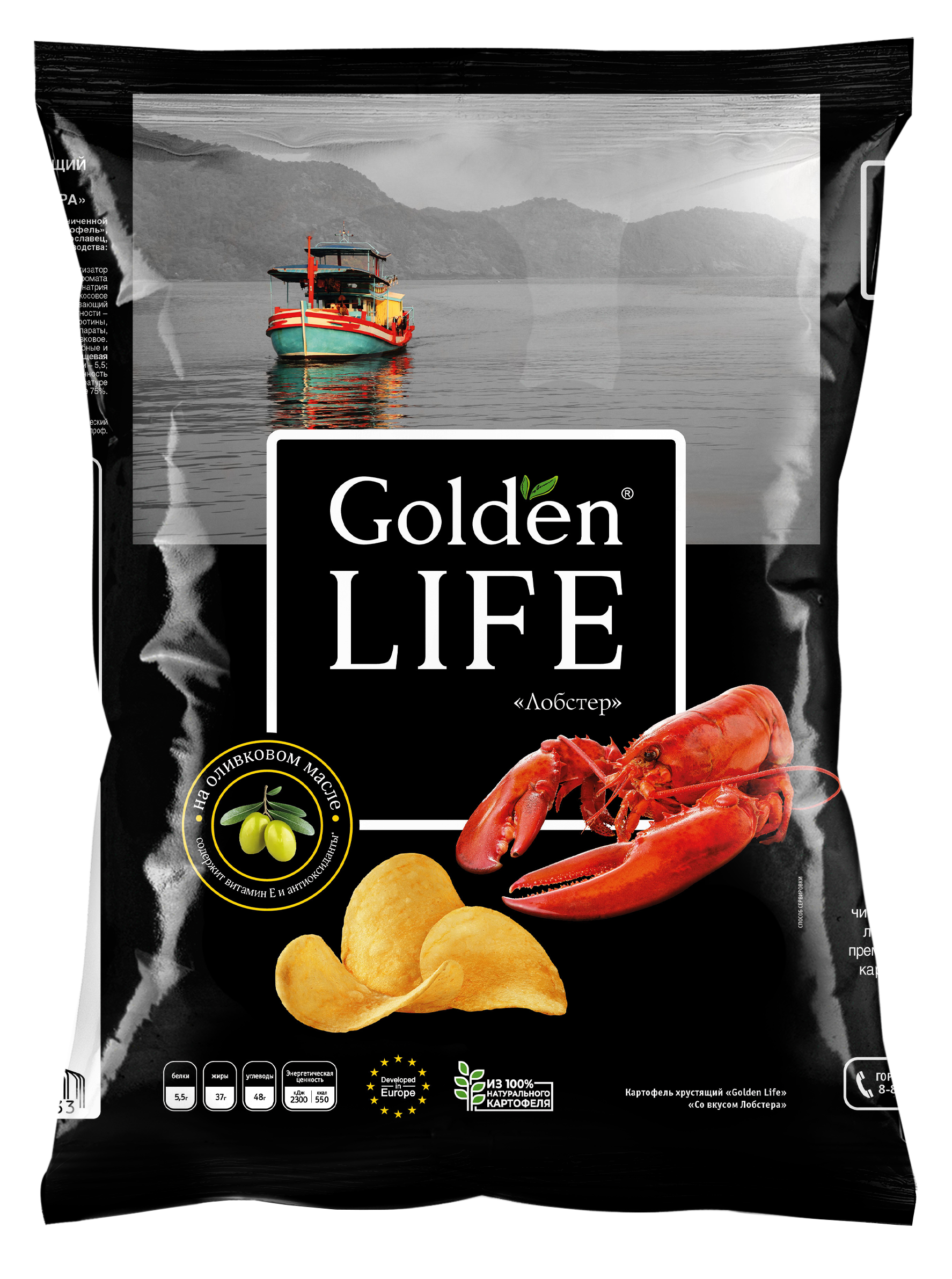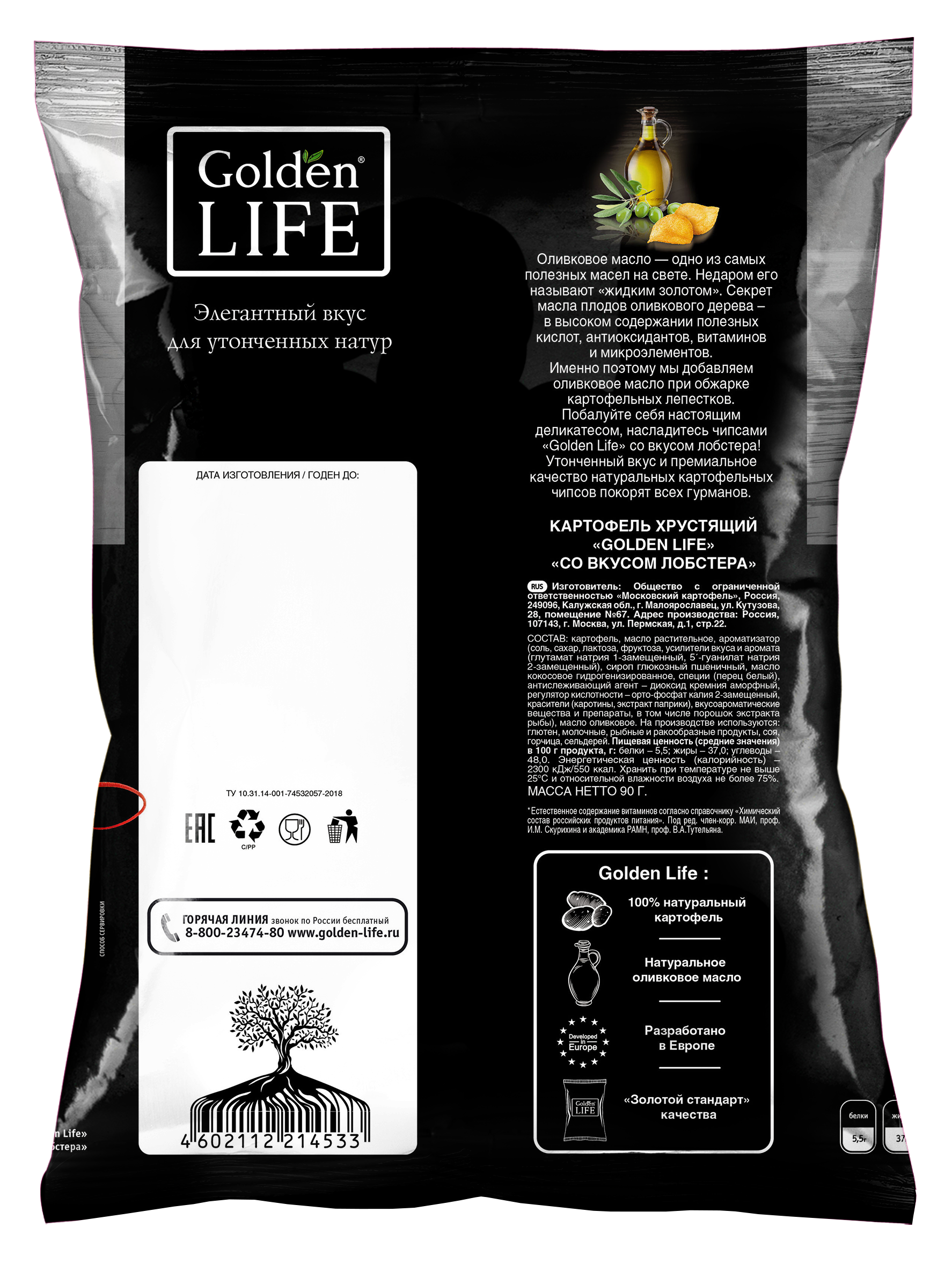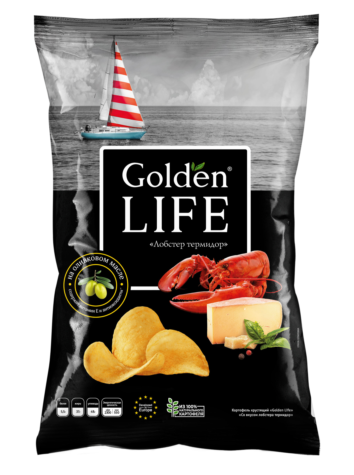 | Golden Life | Снеки | Golden Life: Средняя фасовка. Картофельные чипсы | Картофель хруст. Golden Life "Со вкусом Лобстера" 90г/ 12 уп... | 2602007 | Пакет-подушка |  4602112214533 | 90 | 0,00284 | 163 | 60 | 290 |  |  | 20 | Изысканные картофельные ломтики с утончённым вкусом лобстера... | Готовый продукт. | картофель, масло растительное, ароматизатор (соль, сахар, ла... | 3D Лицевая Оборотная Групповая уп | 550.0 | 5.5 | 37 | 48 | 9 |  | Хранить при температуре не выше 25°С и относительной влажнос... | 12 | гофрокороб |  4602112214540 | 1,08 | 1,48 | 0,02442 | 295 | 385 | 215 | 1 паллета | 96 | 8 | 672 | 56 | 7 | 8 г/к х 7 слоев | 1655 | ООО Москарт | 107143, Россия, Москва г, ул. Пермская вл. 1 | ЕАЭС N RU Д-RU.РА04.В.23845/25 | 12.05.2025 - 01.12.2027 | соответствует требованиям ТУ 10.31.14-001-74532057-2018 | Скачать | 2005202000 | 10.31.14.000 |