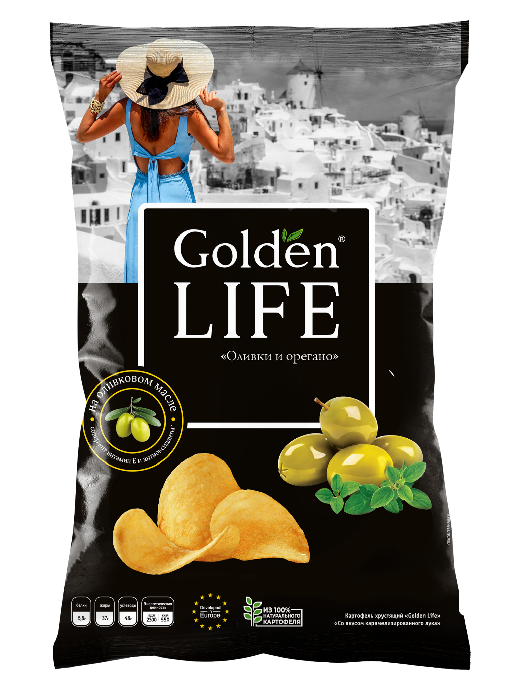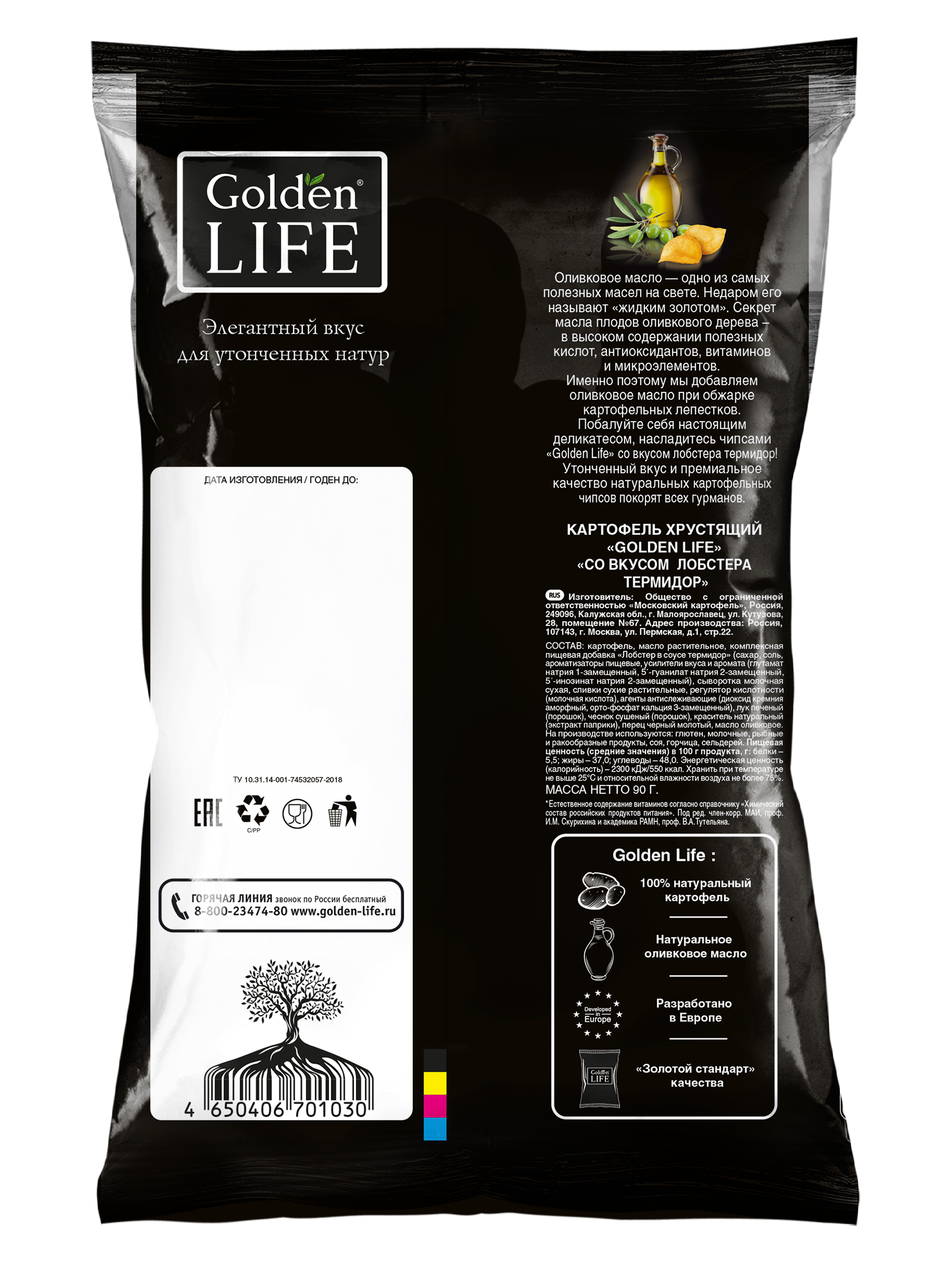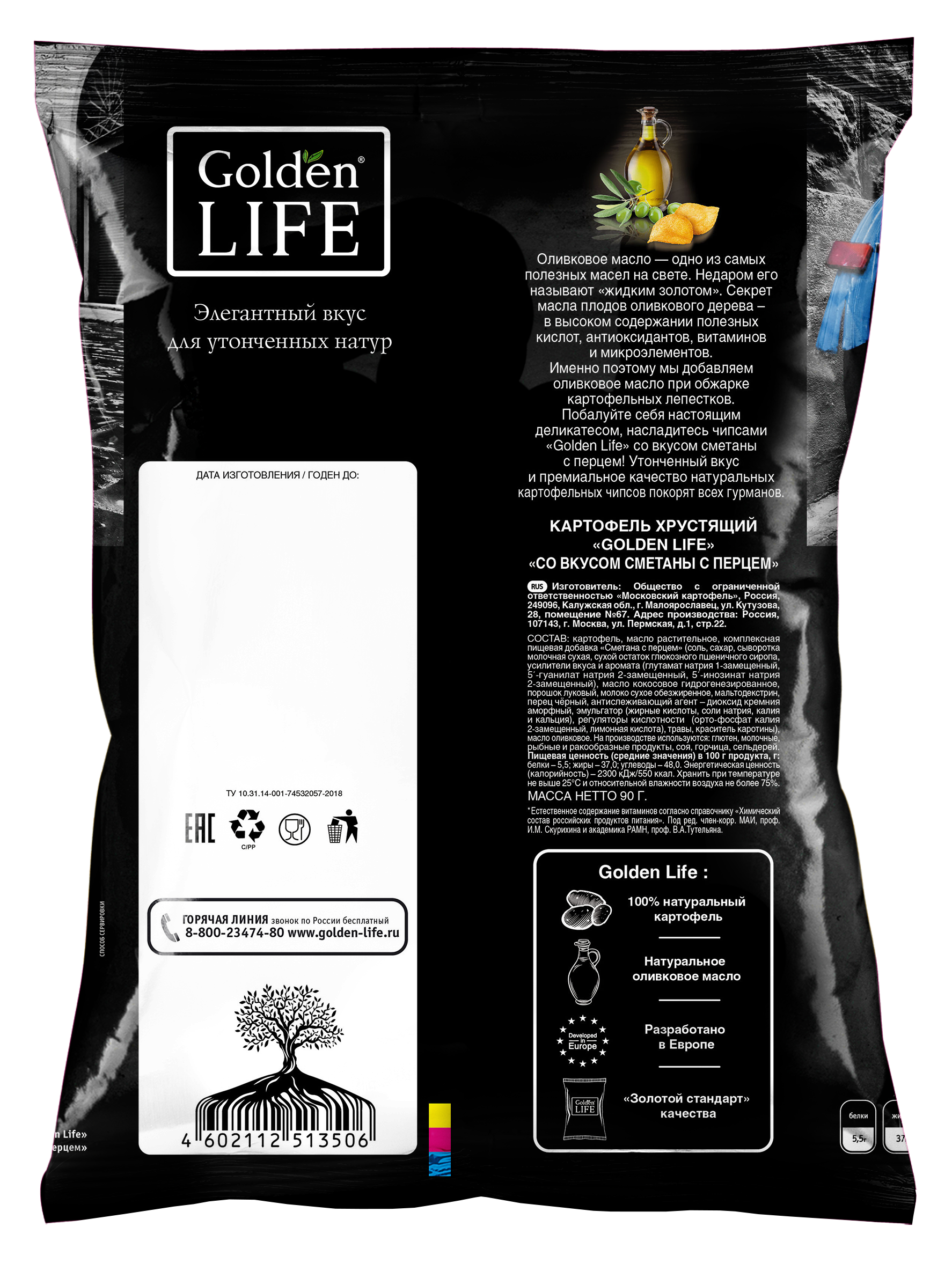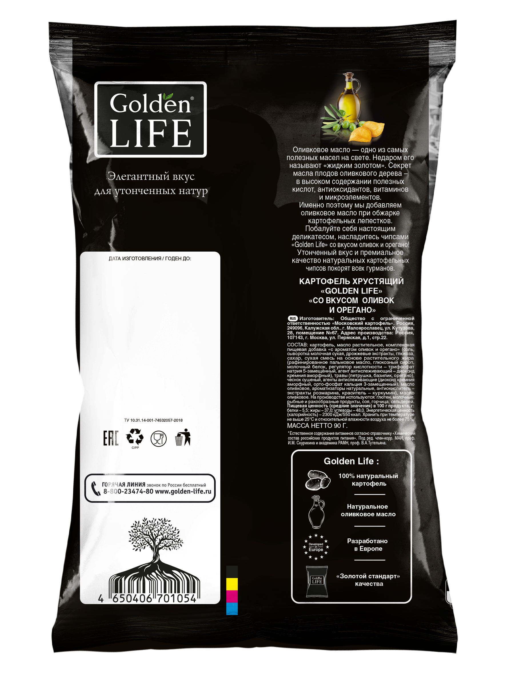 | Golden Life | Снеки | Golden Life: Средняя фасовка. Картофельные чипсы | Картофель хруст. Golden Life "Со вкусом Оливок и орегано" 90... | 2602172 | Пакет-подушка |  4650406701054 | 90 | 0,00284 | 163 | 60 | 290 | 21.04.2025 |  | 20 | Идеальный дуэт вкусов для неспешных вечеров с бокалом вина: ... | Готовый продукт. | картофель, масло растительное, приправа со вкусом "оливки и ... | 3D Лицевая Оборотная | 550.0 | 5.5 | 37 | 48 | 9 |  | Хранить при температуре не выше 25°С и относительной влажнос... | 12 | гофрокороб |  4650406701061 | 1,08 | 1,48 | 0,02442 | 295 | 385 | 215 | Паллета | 96 | 8 | 672 | 56 | 7 | 8 г/к х 7 слоев | 1655 | ООО Москарт | 107143, Россия, Москва г, ул. Пермская вл. 1 | ЕАЭС N RU Д-RU.РА03.В.17521/25 | 27.03.2025 - 26.03.2029 | соответствует требованиям ТУ 10.31.14-001-74532057-2018 | Скачать | 2005202000 | 10.31.14.000 |