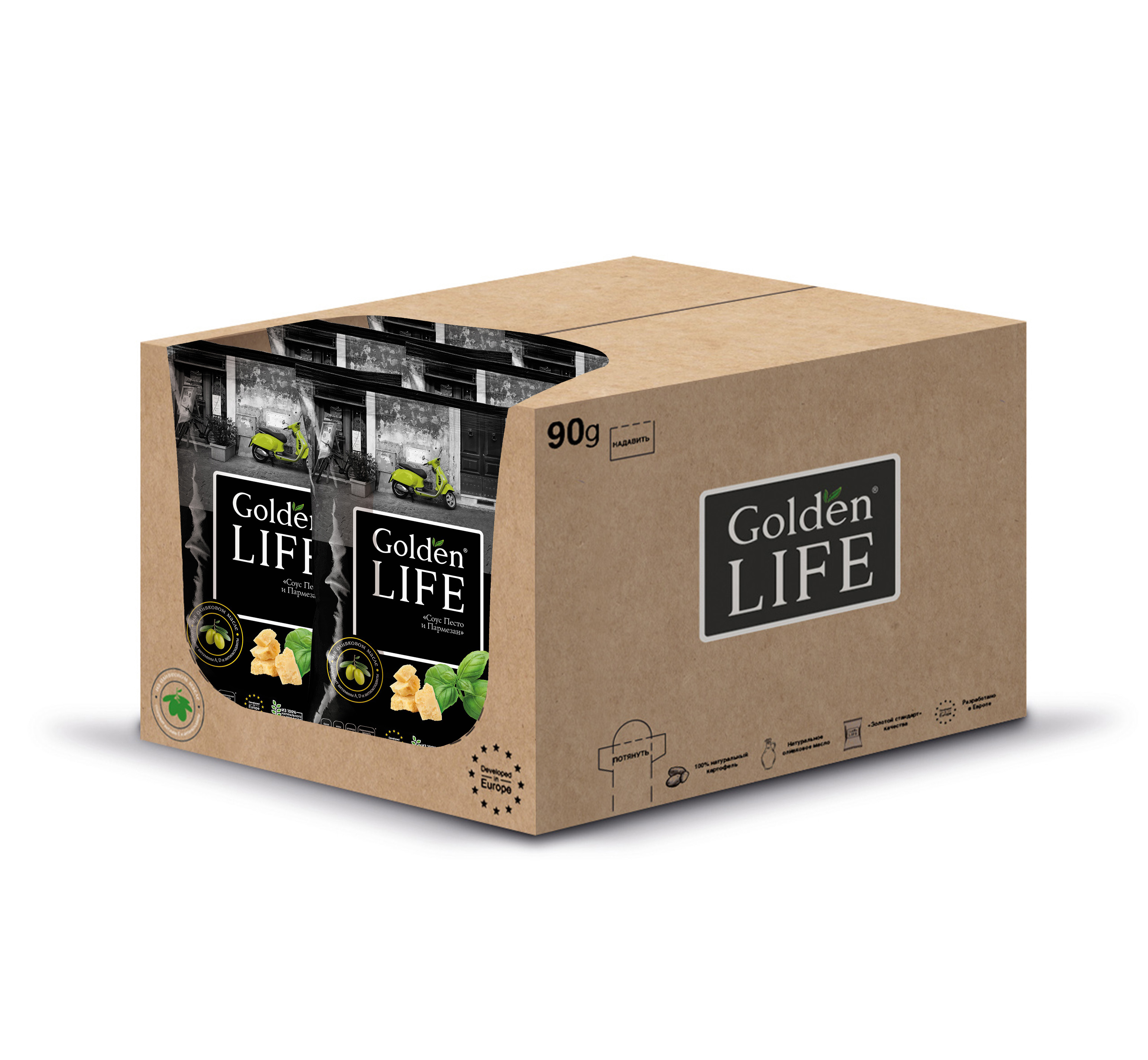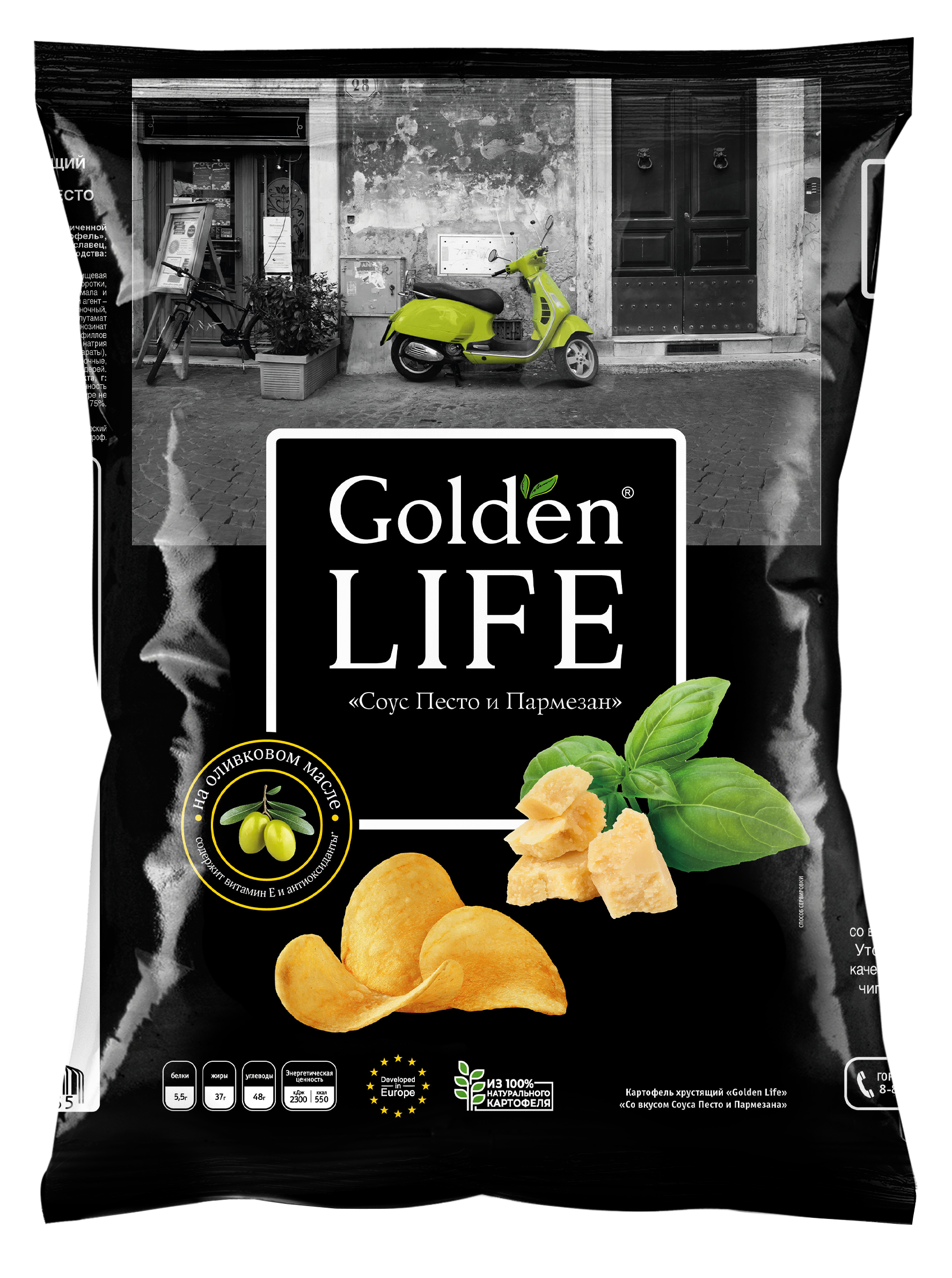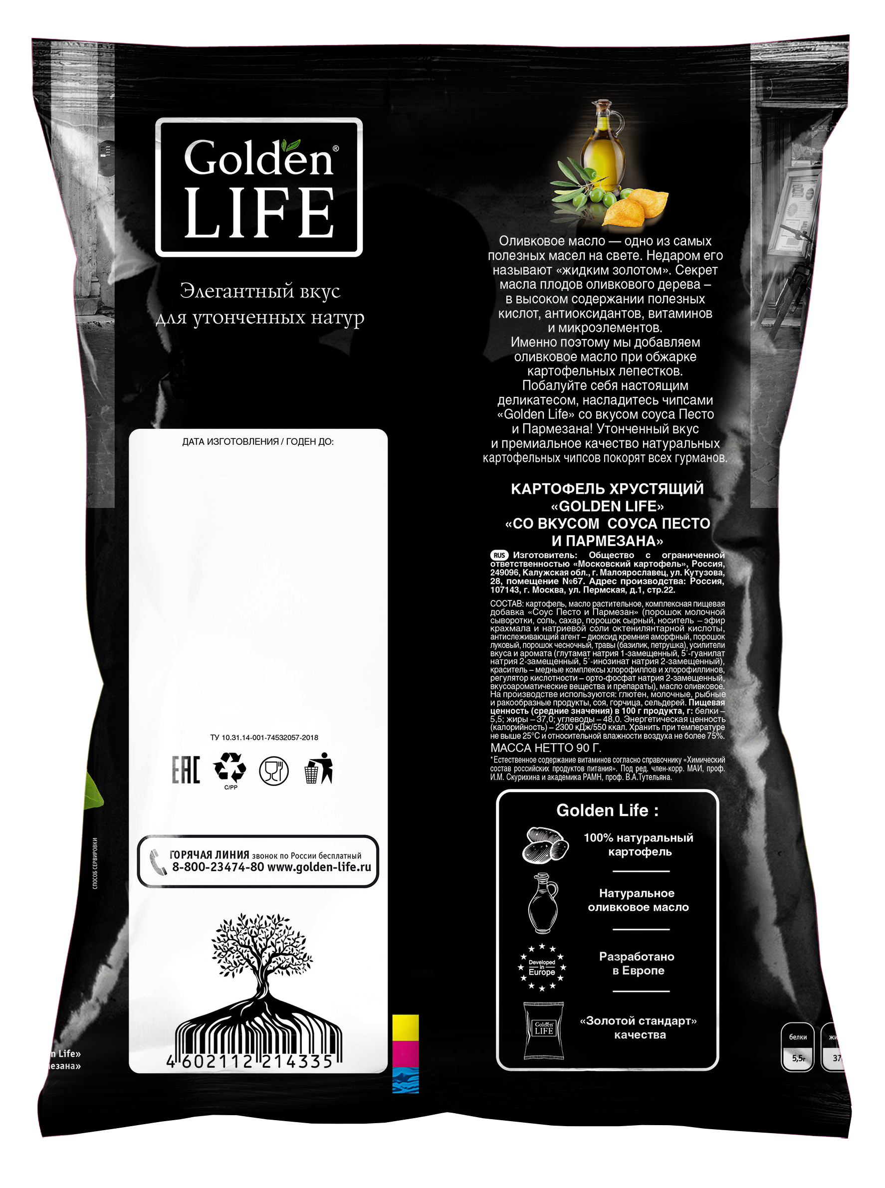 | Golden Life | Снеки | Golden Life: Средняя фасовка. Картофельные чипсы | Картофель хруст. Golden Life "Со вкусом Соуса Песто и Пармез... | 2602009 | Пакет-подушка |  4602112214335 | 90 | 0,00284 | 163 | 60 | 290 |  |  | 20 | Оливковое масло богато антиоксидантами, витаминами и микроэл... | Готовый продукт. | картофель, масло растительное, комплексная пищевая добавка "... | 3D Лицевая Оборотная Групповая уп | 550.0 | 5.5 | 37 | 48 | 9 |  | Хранить при температуре не выше 25°С и относительной влажнос... | 12 | гофрокороб |  4602112214465 | 1,08 | 1,48 | 0,02442 | 295 | 385 | 215 | 1 паллета | 96 | 8 | 672 | 56 | 7 | 8 г/к х 7 слоев | 1655 | ООО Москарт | 107143, Россия, Москва г, ул. Пермская вл. 1 | ЕАЭС N RU Д-RU.РА04.В.23845/25 | 12.05.2025 - 01.12.2027 | соответствует требованиям ТУ 10.31.14-001-74532057-2018 | Скачать | 2005202000 | 10.31.14.000 |