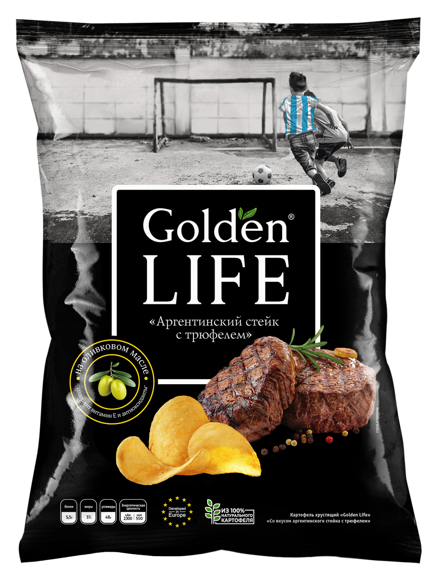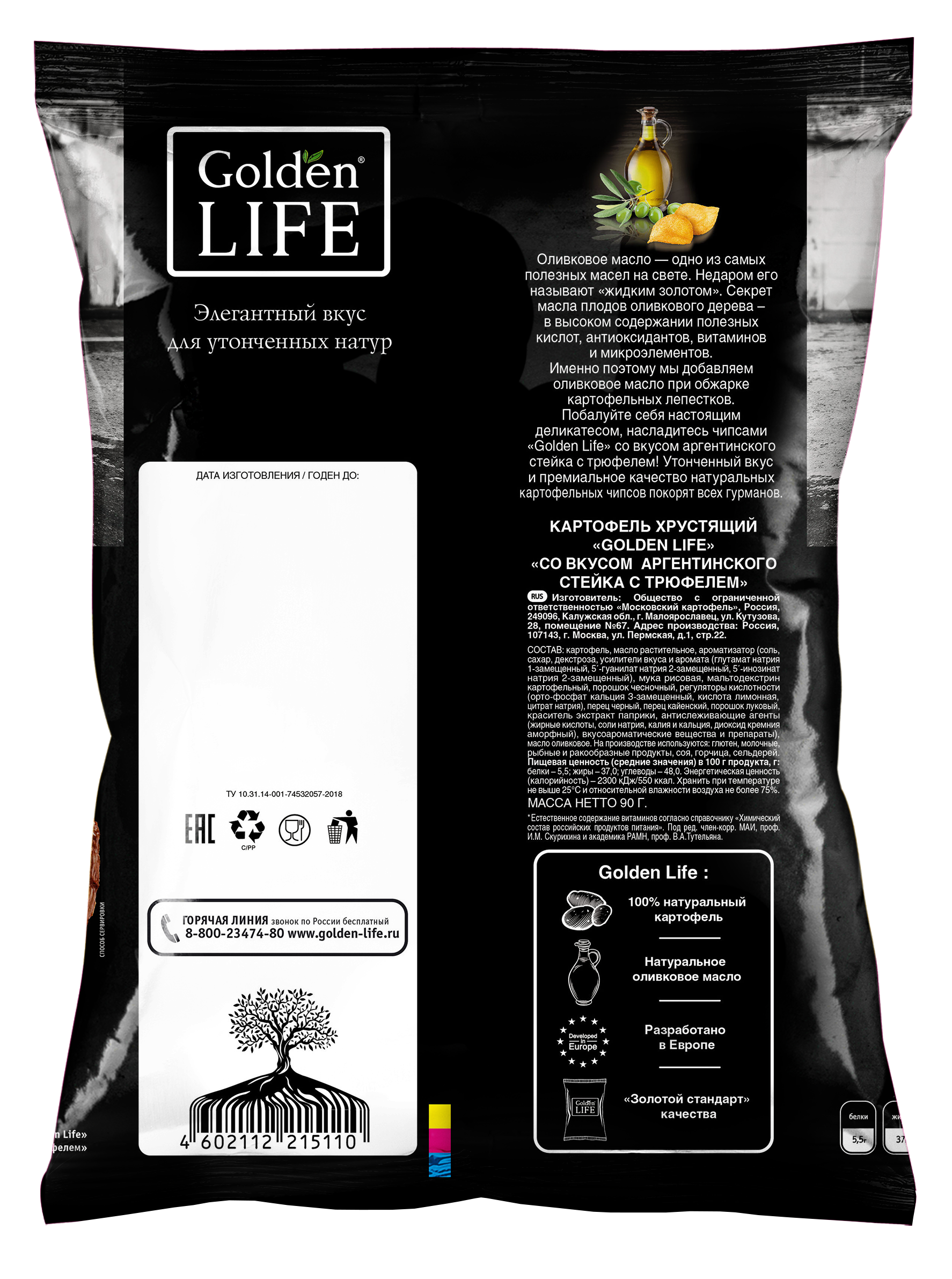 | Golden Life | Снеки | Golden Life: Средняя фасовка. Картофельные чипсы | Картофель хруст. Golden Life "Со вкусом Аргентинского стейка... | 2602257 | Пакет-подушка |  4602112215110 | 90 | 0,00284 | 163 | 60 | 290 |  |  | 20 | Оливковое масло богато антиоксидантами, витаминами и микроэл... | Готовый продукт. | картофель, масло растительное, ароматизатор (соль, сахар, де... | 3D Лицевая Оборотная Групповая уп | 550.0 | 5.5 | 37 | 48 | 9 |  | Хранить при температуре не выше 25°С и относительной влажнос... | 12 | гофрокороб |  4602112215127 | 1,08 | 1,48 | 0,02442 | 295 | 385 | 215 | 1 паллета | 96 | 8 | 672 | 56 | 7 | 8 г/к х 7 слоев | 1655 | ООО Москарт | 107143, Россия, Москва г, ул. Пермская вл. 1 | ЕАЭС N RU Д-RU.РА04.В.23845/25 | 12.05.2025 - 01.12.2027 | соответствует требованиям ТУ 10.31.14-001-74532057-2018 | Скачать | 2005202000 | 10.31.14.000 |