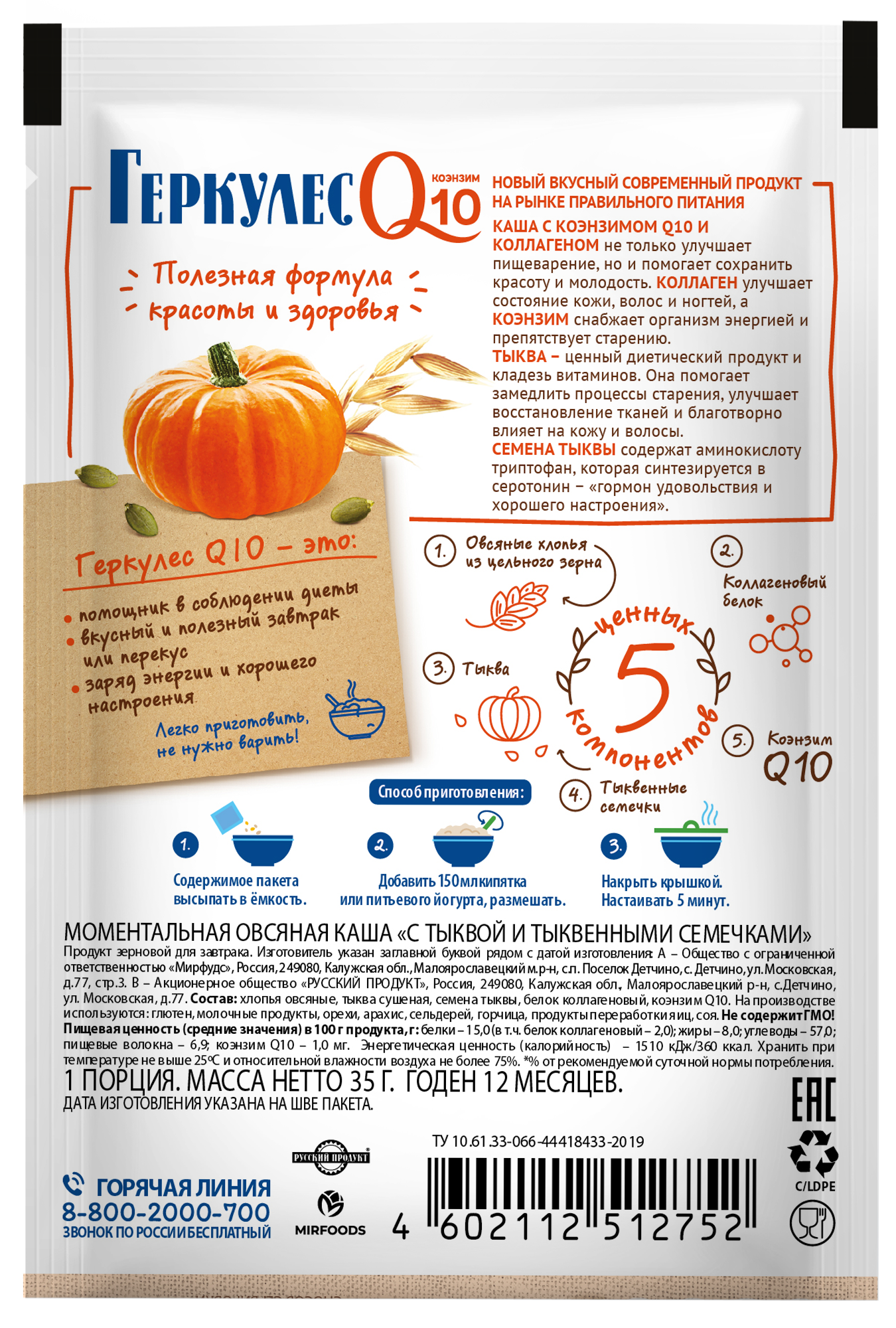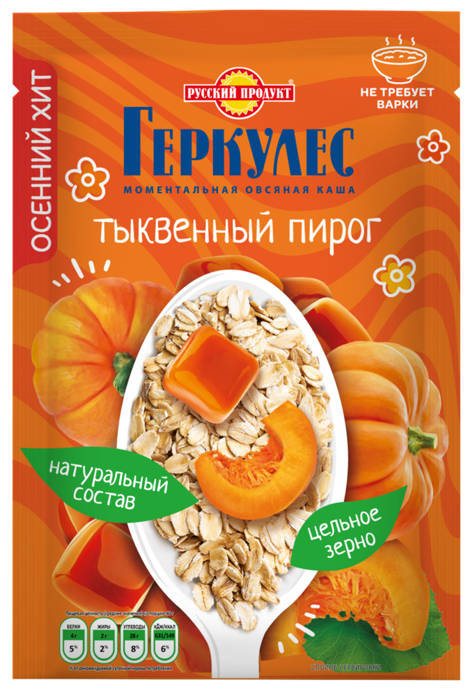 | Геркулес | Бакалея | Каши моментальные Геркулес | Овсяная каша момент Геркулес "Тыквенный пирог" 40г/30 уп в ш... | 2700501 | пакет |  4680176172716 | 40 | 0,00019 | 100 | 13 | 145 | 09.10.2025 |  | 10 |  | 1. Содержимое пакета высыпать в ёмкость.