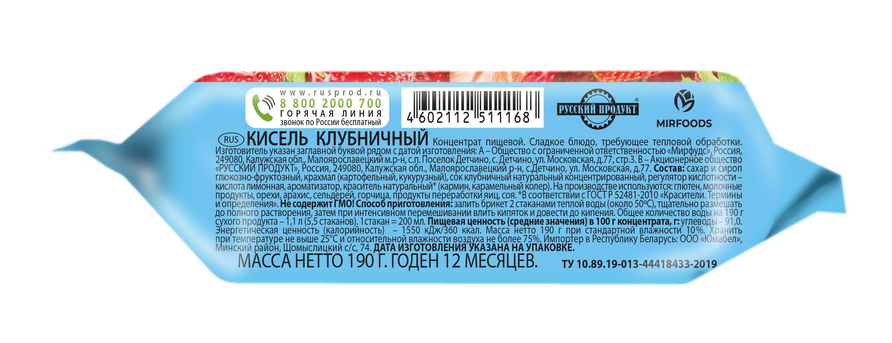 | Русский Продукт | Бакалея | Желе. | Желе быстрого пригот. "Вкус клубники" 50 г/35 уп в ш/б (Мирф... | 2726955 | Пакет |  4602112102922 | 50 | 0,00019 | 120 | 10 | 160 |  |  | 20 | За что вы любите лето? За свежесть раннего утра, капли росы ... | содержимое пакета высыпать в чашку, при постоянном перемешив... | сахар, желатин, регулятор кислотности (кислота лимонная), ар... | 3D Лицевая Оборотная Групповая уп | 390.0 | 9 | 0 | 89 | 12 |  | Хранить при температуре не выше 25°С и относительной влажнос... | 35 | шоу-бокс |  4602112209553 | 1,75 | 2,12 | 0,00648 | 125 | 305 | 170 | Слой | 840 | 24 | 7560 | 216 | 9 | 24 ш/б х 9 слоев | 1690 | ООО Мирфудс | 249080, Россия, Калужская обл, Малоярославецкий р-н, Детчино... | ЕАЭС N RU Д-RU.РА05.В.93558/25 | 14.07.2025 - 13.07.2030 | соответствует требованиям ТУ 10.89.19-002-50948224-2022 | Скачать | 2106909808 | 10.89.19.230 |