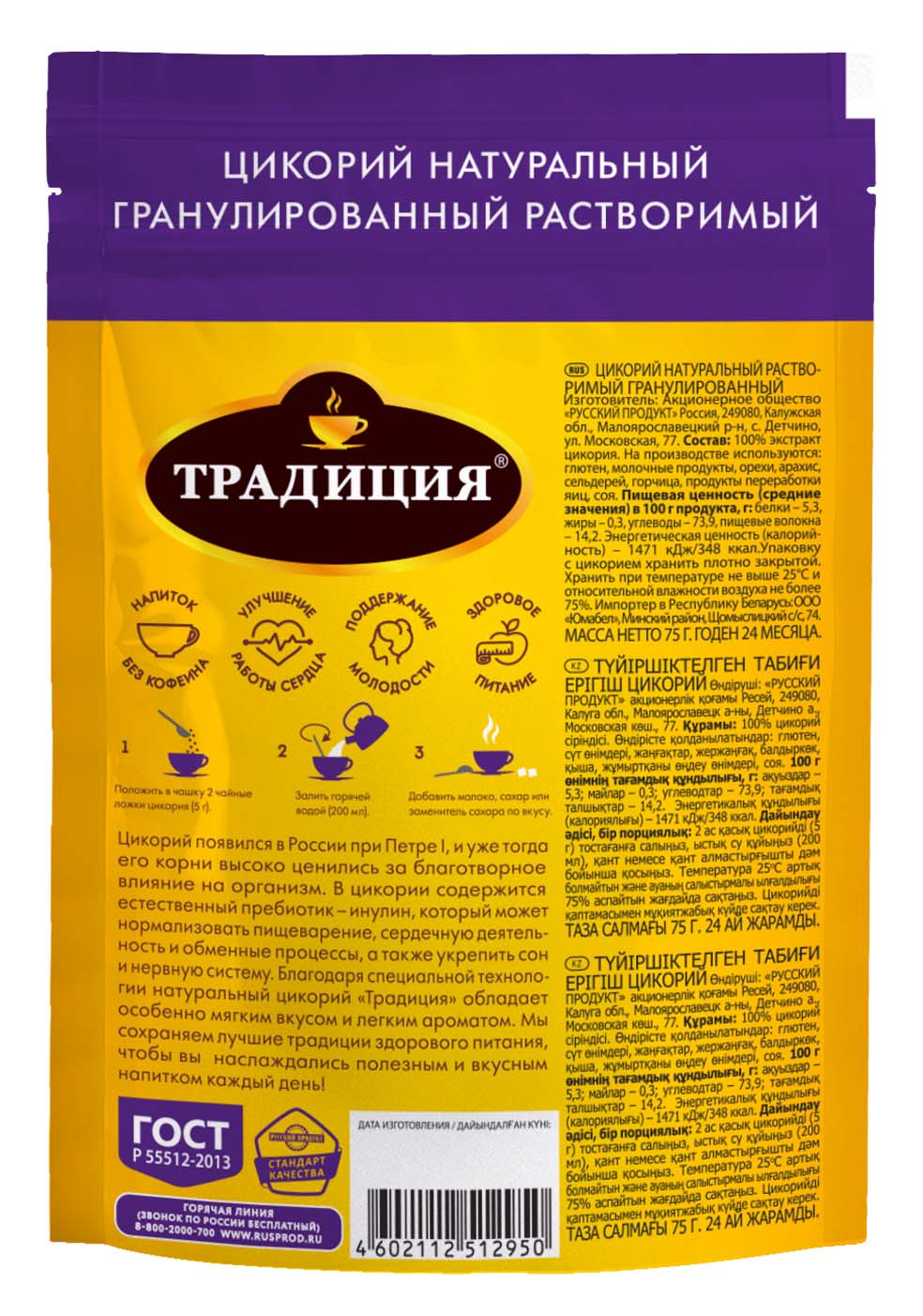| Русский Продукт | Напитки | Цикорий растворимый (дой-пак) | Цикорий растворимый гранулированный " Традиция" 75 г 12 уп в... | 2126893 | стоячий пакет |  4602112512950 | 75 | 0,0014 | 140 | 50 | 200 |  |  | 20 | Цикорий появился в России при Петре I, и уже тогда его корни... | Положить в чашку 2 чайные ложки цикория (5 г).