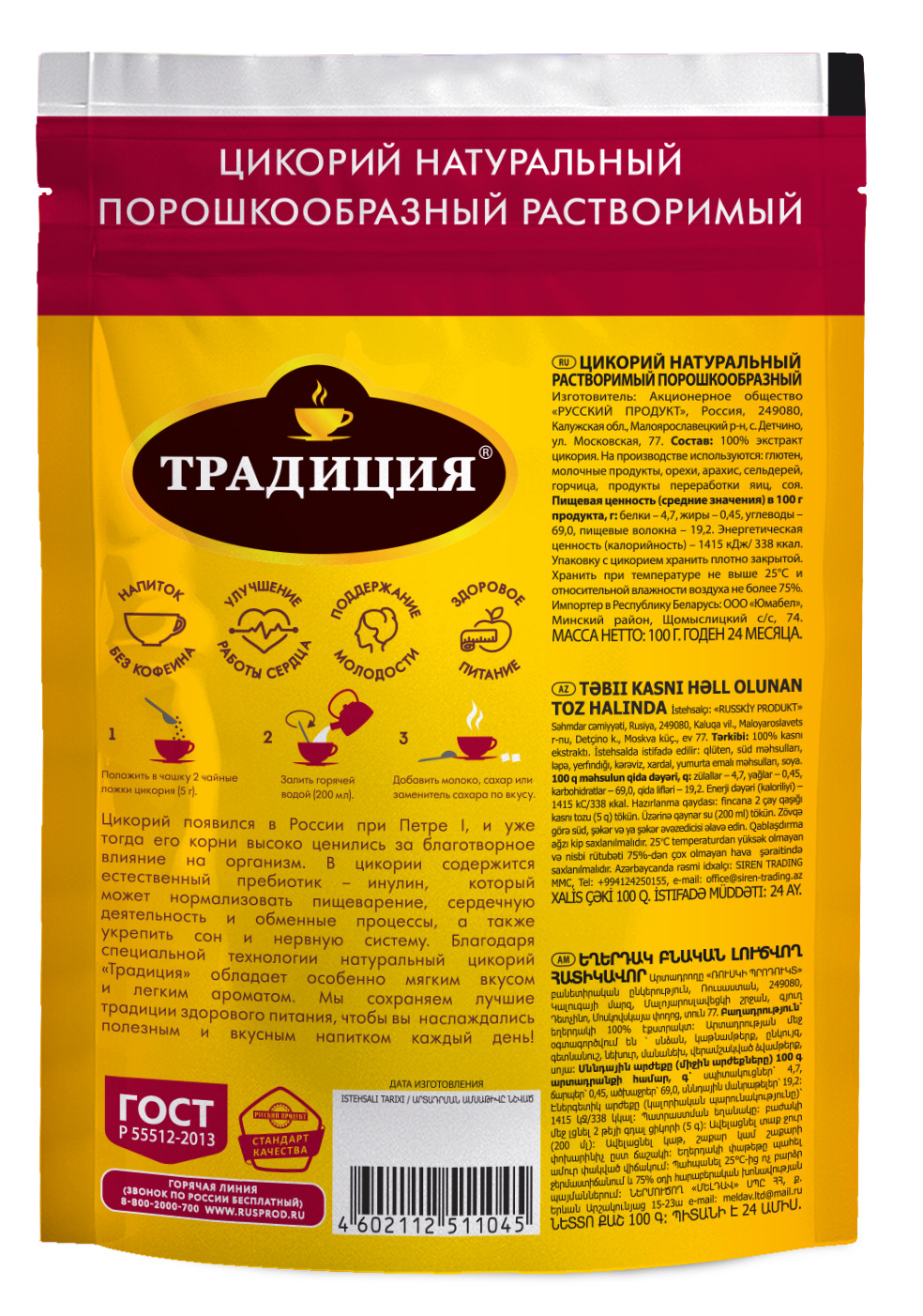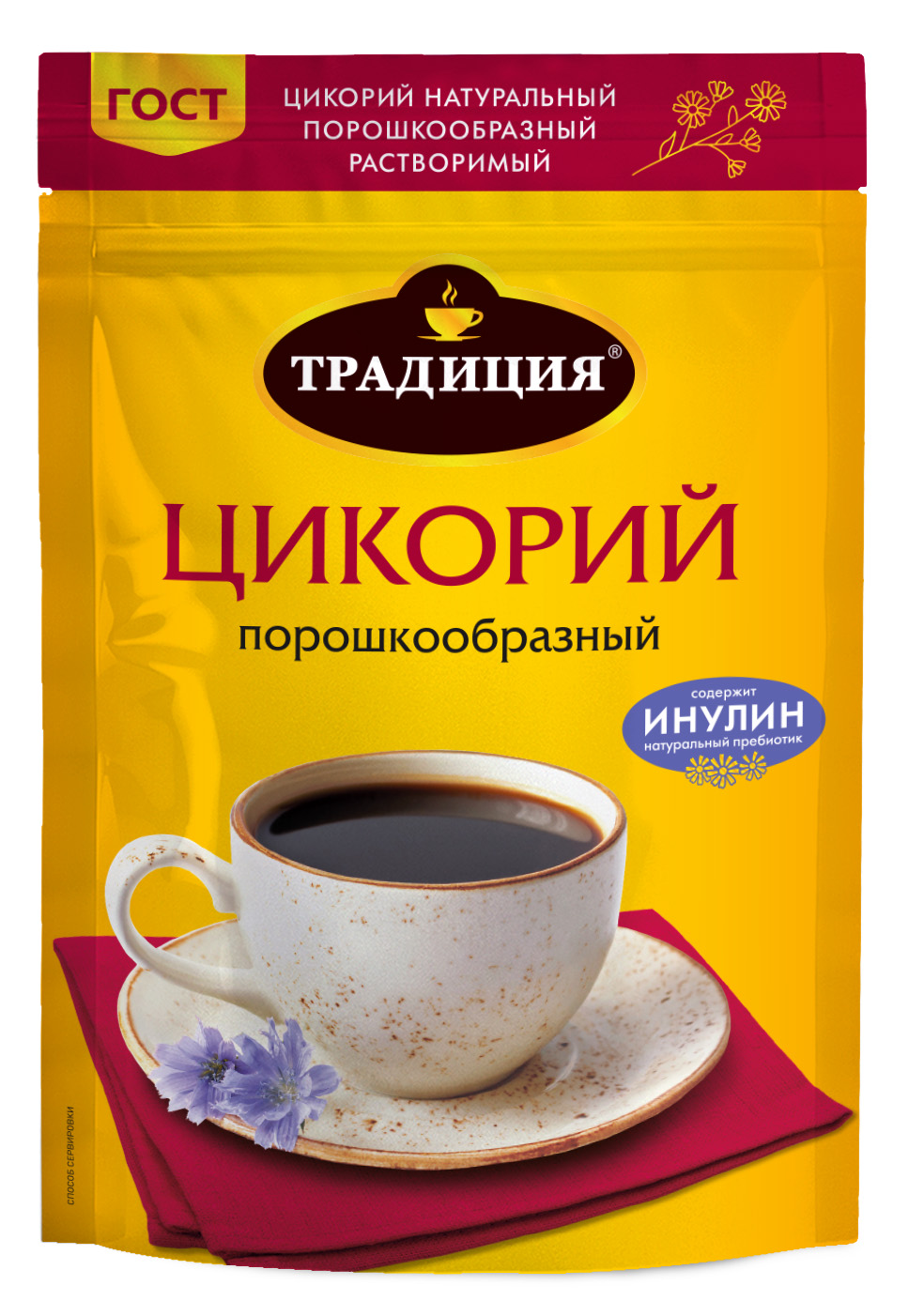 | Русский Продукт | Напитки | Цикорий растворимый (дой-пак) | Цикорий натуральный порошкообразный "Традиция" 100 г /12 уп ... | 2126939 | Пакет |  4602112511045 | 100 | 0,0014 | 140 | 50 | 200 |  |  | 20 | Цикорий появился в России при Петре I, и уже тогда его корни... | 1)	Положить в чашку 2 чайные ложки цикория (5 г).
