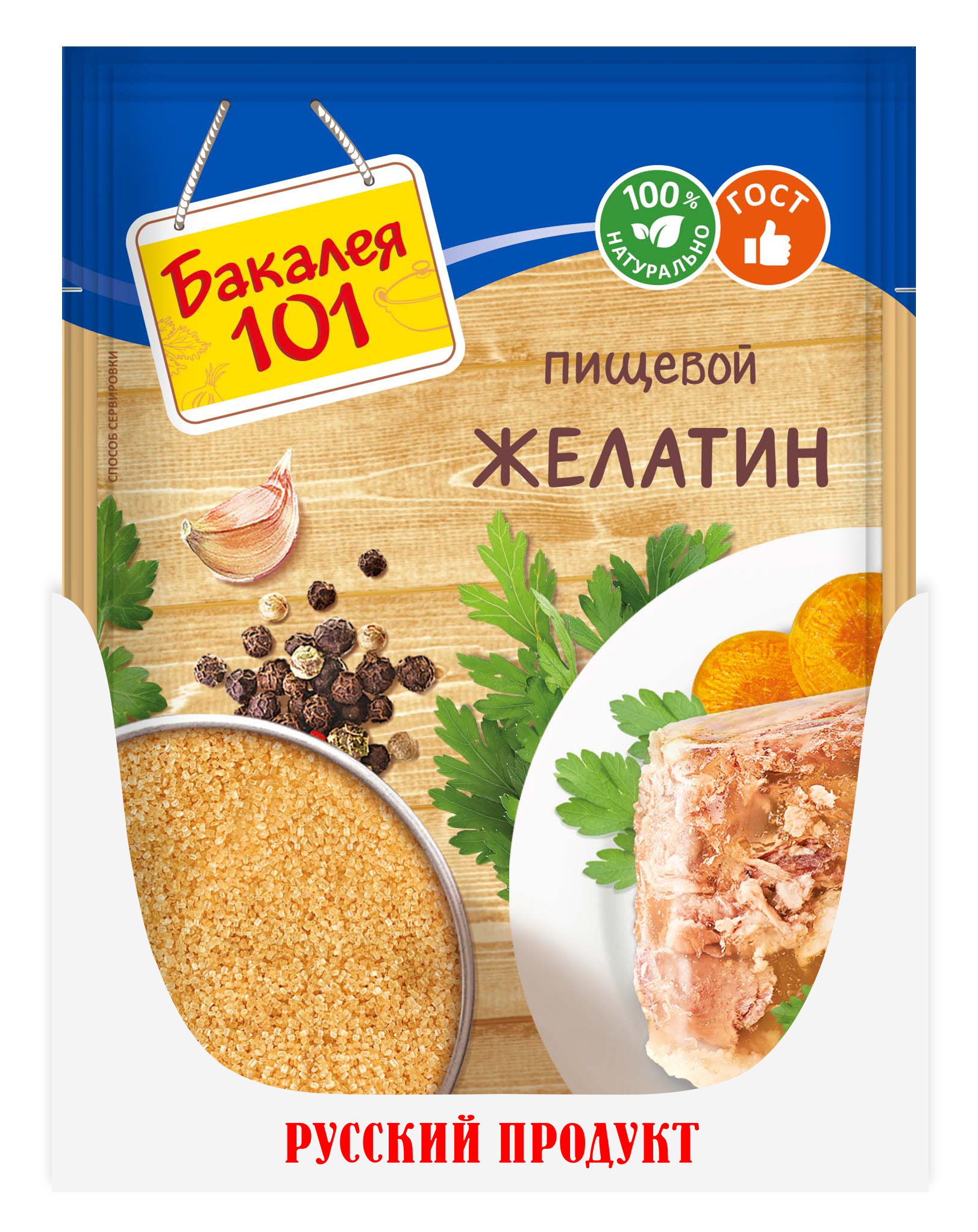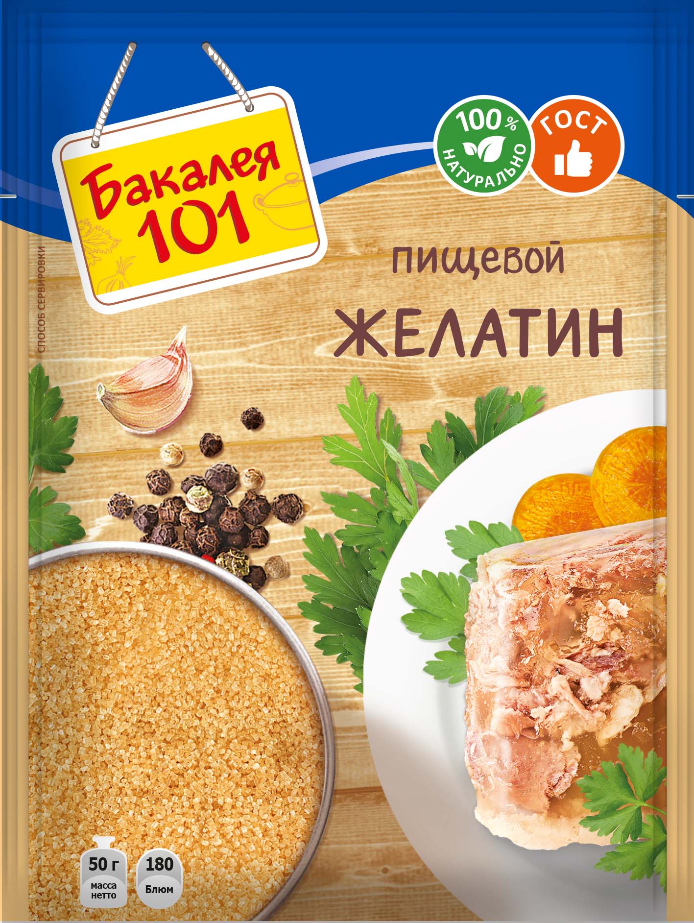 | Бакалея 101 | Бакалея | Желатин | Желатин пищевой Бакалея 101 50 г/30 уп в ш/б (Мирфудс) | 2726907 | Пакет |  4602112102366 | 50 | 0,00015 | 120 | 8 | 160 |  |  | 20 | Желатин применяют при приготовлении желе, кремов, тортов, ов... | Столовую ложку желатина залить стаканом холодной воды или бу... | Желатин пищевой.