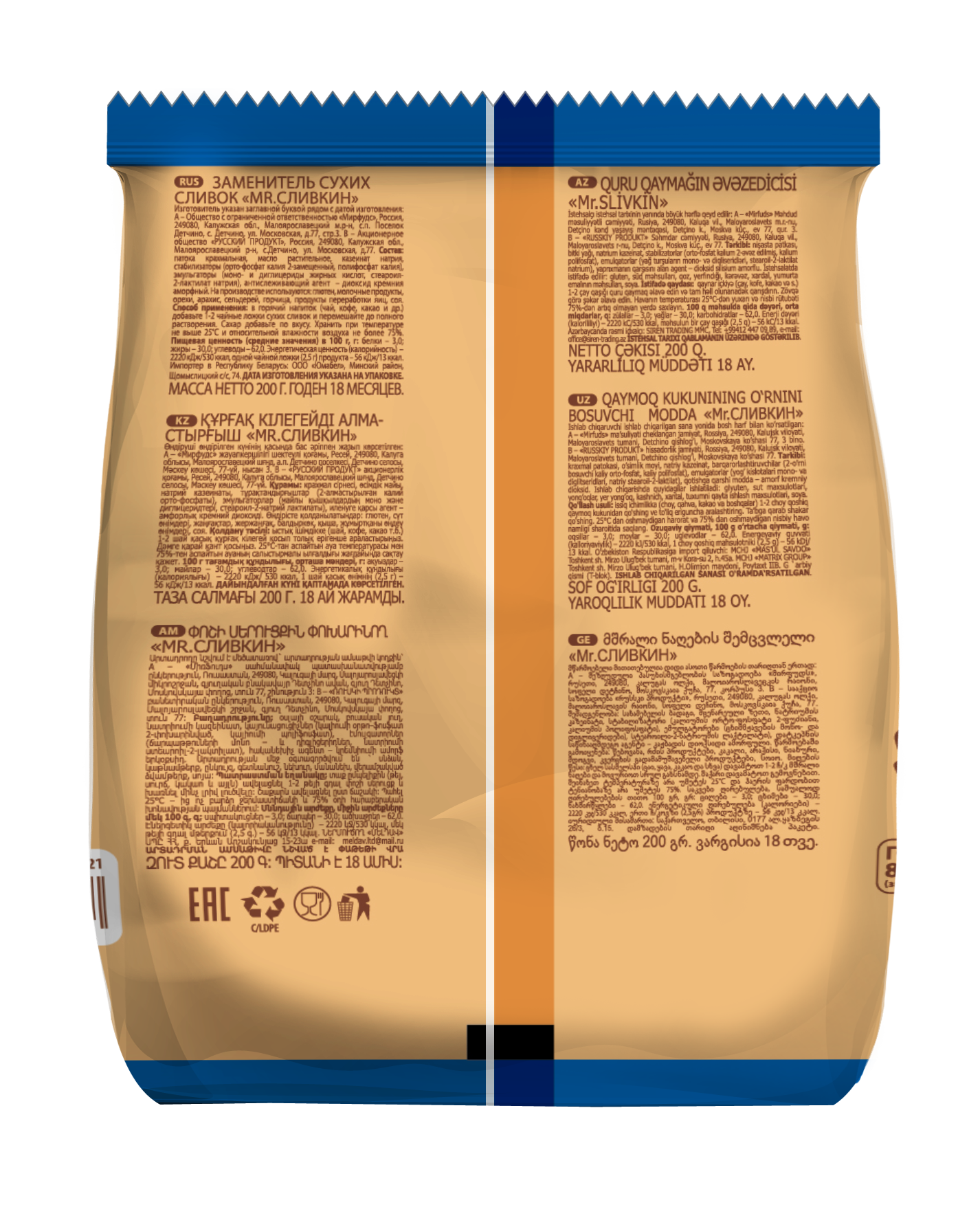 | Mr. Сливкин | Бакалея | Сухие сливки | Сливок сухих заменитель Mr. Сливкин 200г/10 уп в ш/б (Мирфуд... | 2726929 | Пакет-подушка |  4602112208327 | 200 | 0,00064 | 115 | 40 | 140 | 22.09.2023 |  | 20 | Mr Сливкин - сухие сливки на растительной основе, заменитель... | в горячий напиток (чай, кофе, какао и др.) добавьте 1-2 чайн... | патока крахмальная, масло растительное, казеинат натрия, ста... | Лицевая Оборотная Боковая Л Боковая П Групповая уп | 530.0 | 3 | 30 | 62 | 18 |  | Хранить при температуре не выше 25°С и относительной влажнос... | 10 | шоу-бокс |  4602112513315 | 2 | 2,15 | 0,00699 | 129 | 387 | 140 | Слой | 180 | 18 | 1980 | 198 | 11 | 18 ш/б х 11 слоев | 1700 | ООО Мирфудс | 249080, Россия, Калужская обл, Малоярославецкий р-н, Детчино... | ЕАЭС N RU Д-RU.РА04.В.47440/25 | 20.05.2025 - 19.05.2030 | соответствует требованиям ТУ 10.89.19-054-44418433-2021 | Скачать | 2106909808 | 10.89.19.290 |