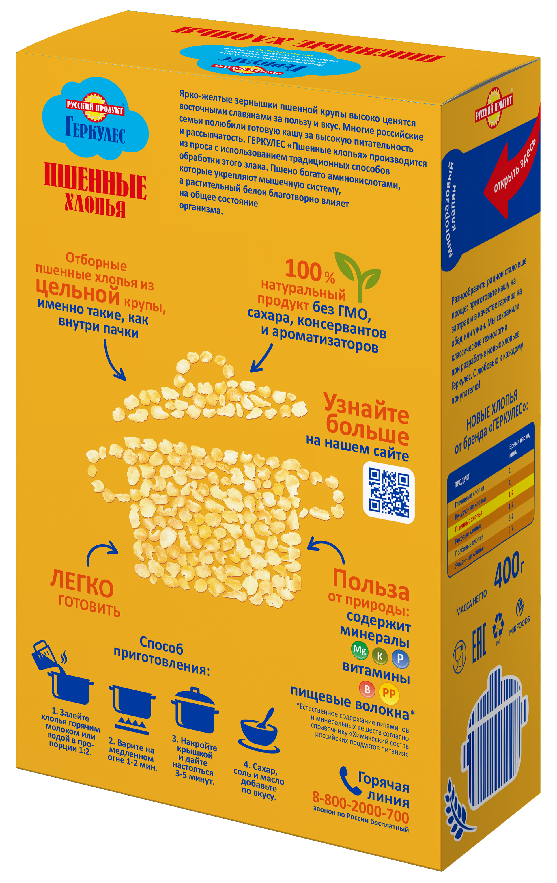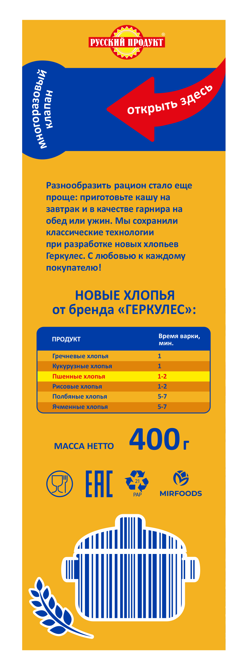 | Геркулес | Бакалея | Геркулес | Геркулес Хлопья Пшённые 400 г/ 1*6 шт в SRP ш/б (Мирдфус) (с... | 2726891 | Коробка |  4602112510086 | 400 | 0,00144 | 120 | 63 | 190 |  |  | 10 | Ярко-желтые зернышки пшенной крупы высоко ценятся восточными... | Залейте хлопья горячим молоком или водой в пропорции 1:2. Ва... | Хлопья пшенные. | Лицевая Оборотная Боковая Л Боковая П Групповая уп | 350.0 | 12 | 3 | 69 | 6 |  | Хранить при температуре не выше 25°С и относительной влажнос... | 6 | шоу-бокс |  4602112510093 | 2,4 | 2,76 | 0,00999 | 130 | 396 | 194 | 1 паллета | 108 | 18 | 864 | 144 | 8 | 18 ш/б х 8 слоев | 1710 | ООО Мирфудс | 249080, Россия, Калужская обл, Малоярославецкий р-н, Детчино... | ЕАЭС N RU Д-RU.РА06.В.95069/25 | 11.08.2025 - 10.08.2030 | соответствует требованиям ТУ 10.61.33-016-44418433-2018 | Скачать | 1104199900 | 10.61.33.110 |