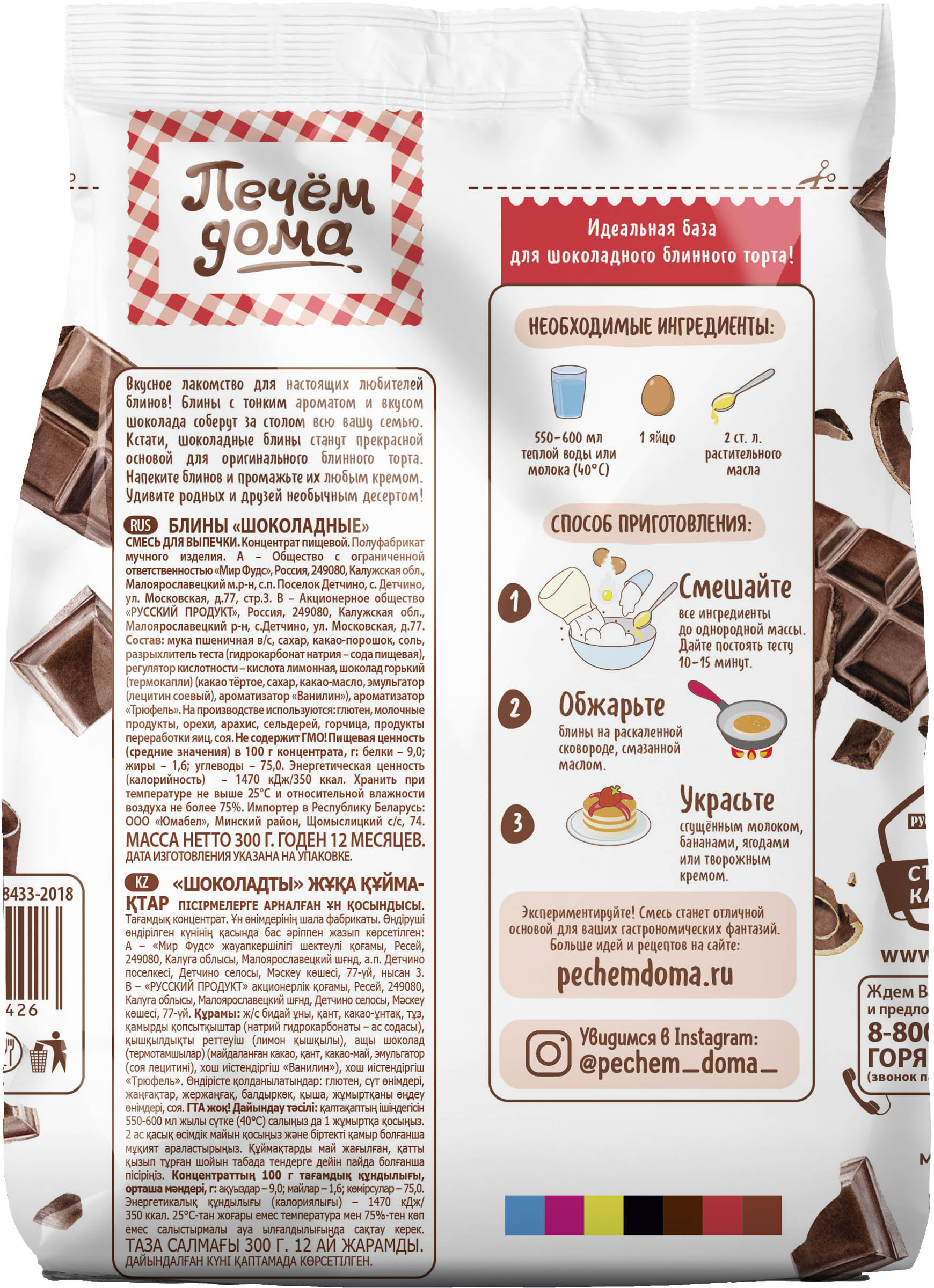 | Печем Дома | Бакалея | Кремы | Крем-десерт Печем дома "Шоколадный" 90г/15 уп в ш/б (Мирфудс... | 2726845 | Пакет |  4602112506287 | 90 | 0,00027 | 120 | 14 | 160 |  |  | 20 | Сервируйте крем-десерт "Печем Дома" как самостоятельное блюд... | Способ приготовления: