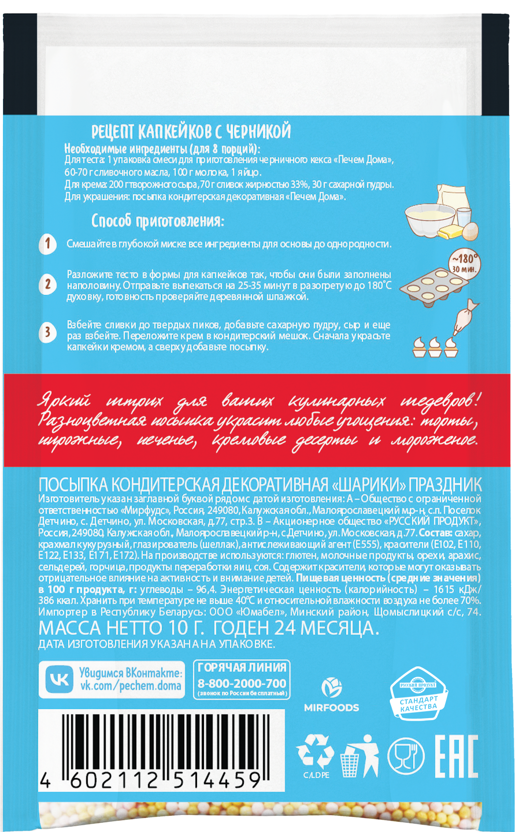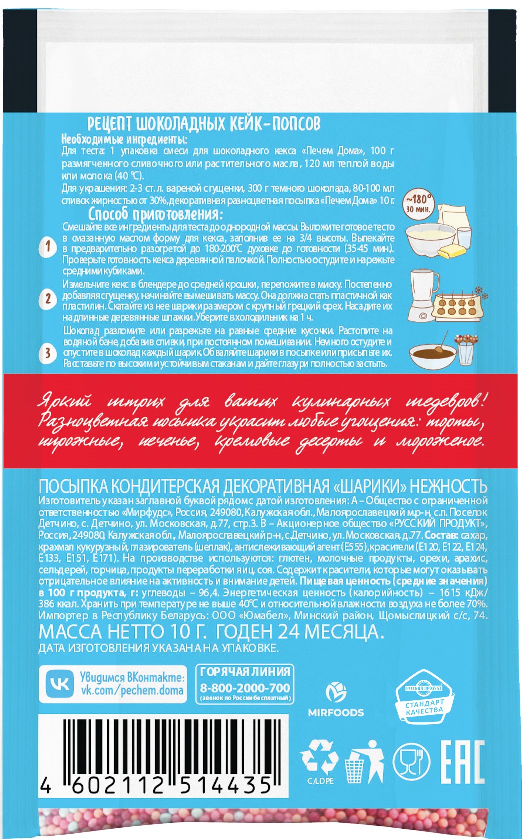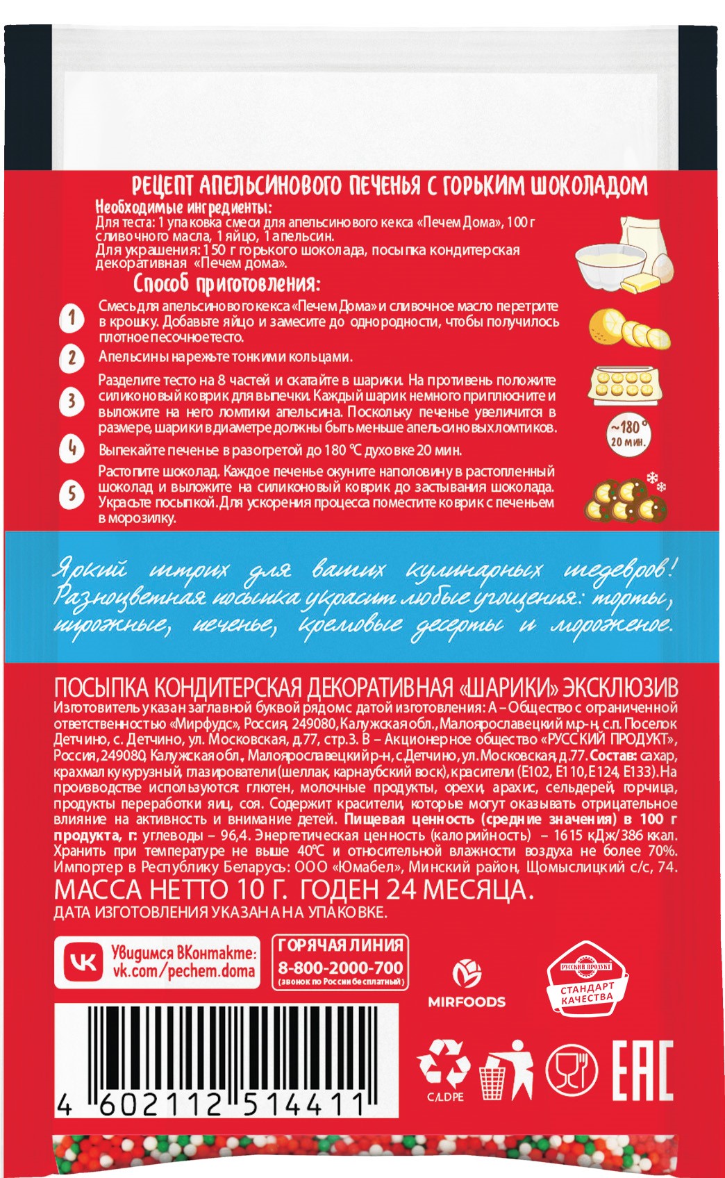 | Печем Дома | Бакалея | Кулинарные добавки | Посыпка кондитерская декоративная "Шарики" Эксклюзив ТМ "Печ... | 2700084 | Пакет |  4602112514411 | 10 | 0,0001 | 75 | 7 | 120 |  |  | 20 | Легкие и хрустящие шарики станут идеальным украшением для лю... | Применяется в соответствии с кулинарными рецептами. | сахар, крахмал кукурузный, глазирователи (шеллак, карнаубски... | Лицевая Оборотная Групповая уп | 386.0 | 0 | 0 | 96.4 | 24 |  | Хранить при относительной влажности воздуха не более 70% | 30 | шоу-бокс |  4602112514428 | 0,3 | 0,396 | 0,00286 | 84 | 264 | 129 | Слой | 1260 | 42 | 15120 | 504 | 12 | 42 ш/б х 12 слоев | 1715 | ООО Мирфудс | 249080, Россия, Калужская обл, Малоярославецкий р-н, Детчино... | ЕАЭС N RU Д-RU.РА11.В.51982/24 | 17.12.2024 - 15.12.2027 | соответствует требованиям ТУ 10.82.23-058-44418433-2021 | Скачать | 1704909900 | 10.82.23.290 |