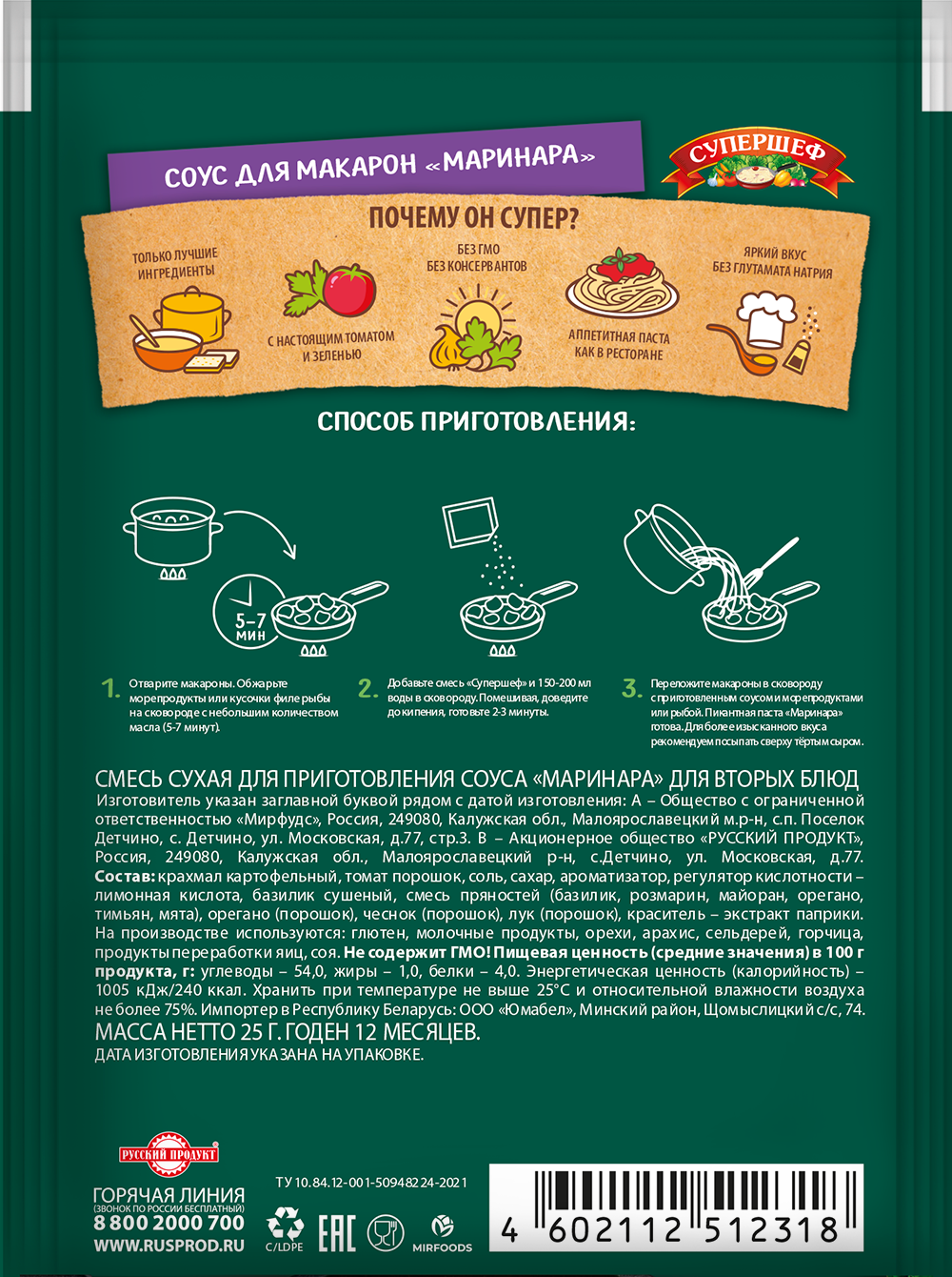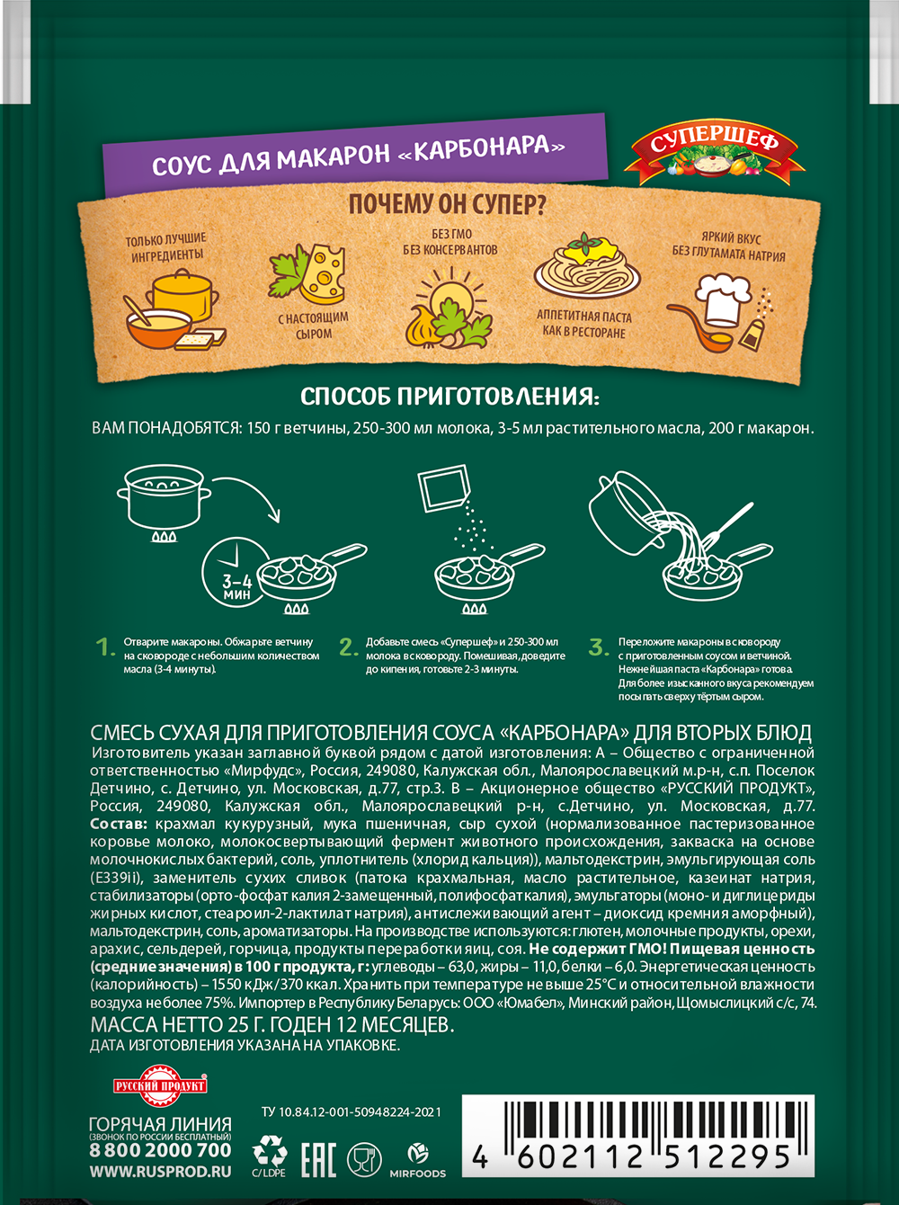 Без ГМО Без ко... | ВАМ ПОНАДОБИТСЯ: 150 г ветчины, 250-300 мл молока, 3-5 мл ра... | заменитель сухих сливок (патока крахмальная, масло раститель... | 3D Лицевая Оборотная | 370.0 | 6 | 11 | 63 | 12 |  | Хранить при температуре не выше 25°С и относительной влажнос... | 20 | шоу-бокс |  4602112512301 | 0,5 | 0,65 | 0,00453 | 130 | 205 | 170 | Слой | 680 | 34 | 6120 | 306 | 9 | 34 ш/б х 9 слоев | 1680 | ООО Мирфудс | 249080, Россия, Калужская обл, Малоярославецкий р-н, Детчино... | ЕАЭС N RU Д-RU.РА01.В.52820/25 | 30.01.2025 - 28.01.2030 | соответствует требованиям ТУ10.84.12-001-50948224-2021 | Скачать | 2103909009 | 10.84.12.150 |