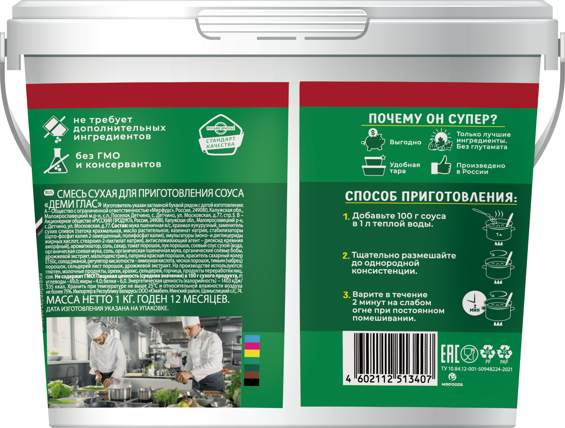 Выверенная рецептура, создан... |  Разведите 100 г соуса в 1 л теплой воде, хорошо размешайте... | молоко сухое цельное, крахмал кукурузный, мука пшеничная в/с... | 3D Лицевая Оборотная | 350.0 | 11 | 9 | 57 | 12 |  | Хранить при температуре не выше 25°С и относительной влажнос... | 4 | гофрокороб |  4602112513438 | 7,2 | 7,62 | 0,028 | 400 | 200 | 350 | Слой | 48 | 12 | 192 | 48 | 4 | 12 г/к х 4 слоев | 1550 | ООО Мирфудс | 249080, Россия, Калужская обл, Малоярославецкий р-н, Детчино... | ЕАЭС N RU Д-RU.РА06.В.94049/23 | 29.08.2023 - 28.08.2026 | соответствует требованиям ТУ 10.84.12-001-50948224-2021 | Скачать | 2103909009 | 10.84.12.150 |