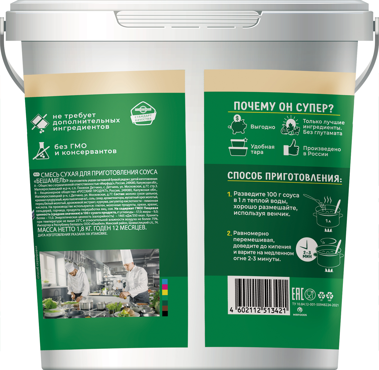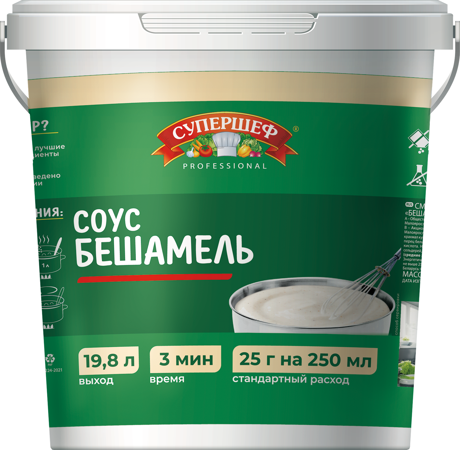 | Супершеф | HoReCa | Смеси сухие для приготовления соуса | Смесь сухая для приготолвения соуса "Бешамель" 1800г/4 уп в ... | 2700026 | ведро |  4602112513421 | 1800 | 0,007 | 200 | 200 | 175 |  |  | 20 | Ваш профессиональный помощник: