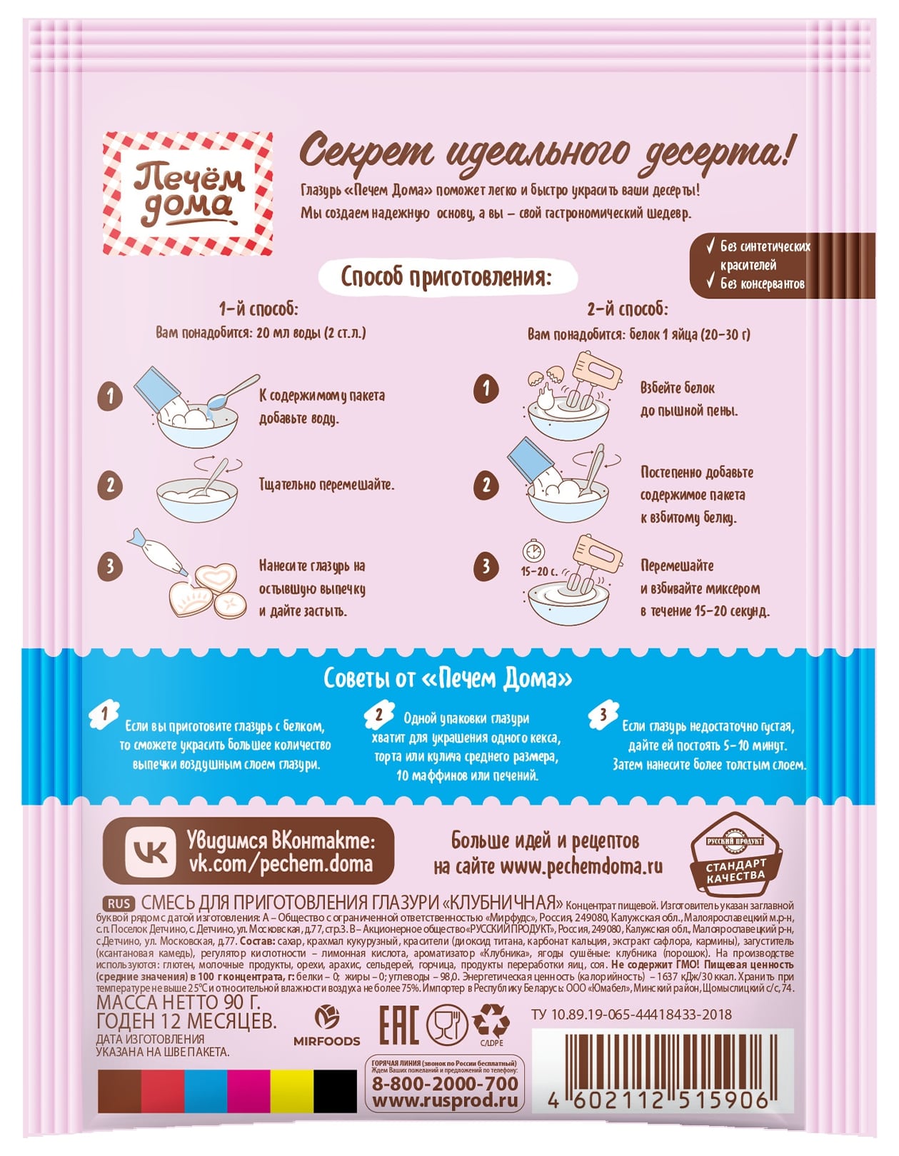 | Печем Дома | Бакалея | Кулинарные добавки | Глазурь Печем дома "Клубничная" 90г /15 уп в ш/б (Мирфудс) | 2700187 | Пакет |  4602112515906 | 90 | 0,00038 | 120 | 20 | 160 |  |  | 20 | 	Глазурь "Печем Дома" поможет легко и быстро украсить ваши д... | 1-й способ: