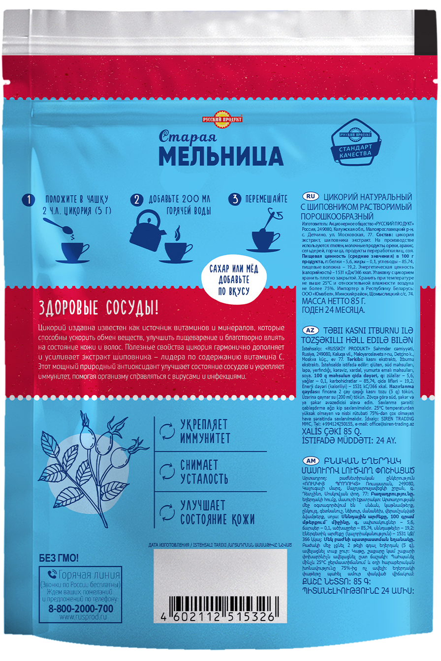 2. Добавьте 200 мл... | цикория экстракт, шиповника экстракт. На производстве исполь... | Лицевая Оборотная Групповая уп |  |  |  |  | 24 |  | Хранить при температуре не выше 25°С и относительной влажнос... | 12 | гофрокороб |  4602112515333 | 1,02 | 1,29 | 0,01126 | 225 | 385 | 130 | Слой | 120 | 10 | 1440 | 120 | 12 | 10 г/к х 12 слоев | 1720 | АО Русский Продукт | 249080, Россия, Калужская обл, Малоярославецкий р-н, Детчино... | ЕАЭС N RU Д-RU.РА10.В.89098/23 | 21.12.2023 - 20.12.2026 | соответствует требованиям ТУ 10.83.12-055-44418433-2018 | Скачать | 2101309100 | 10.83.12.110 |