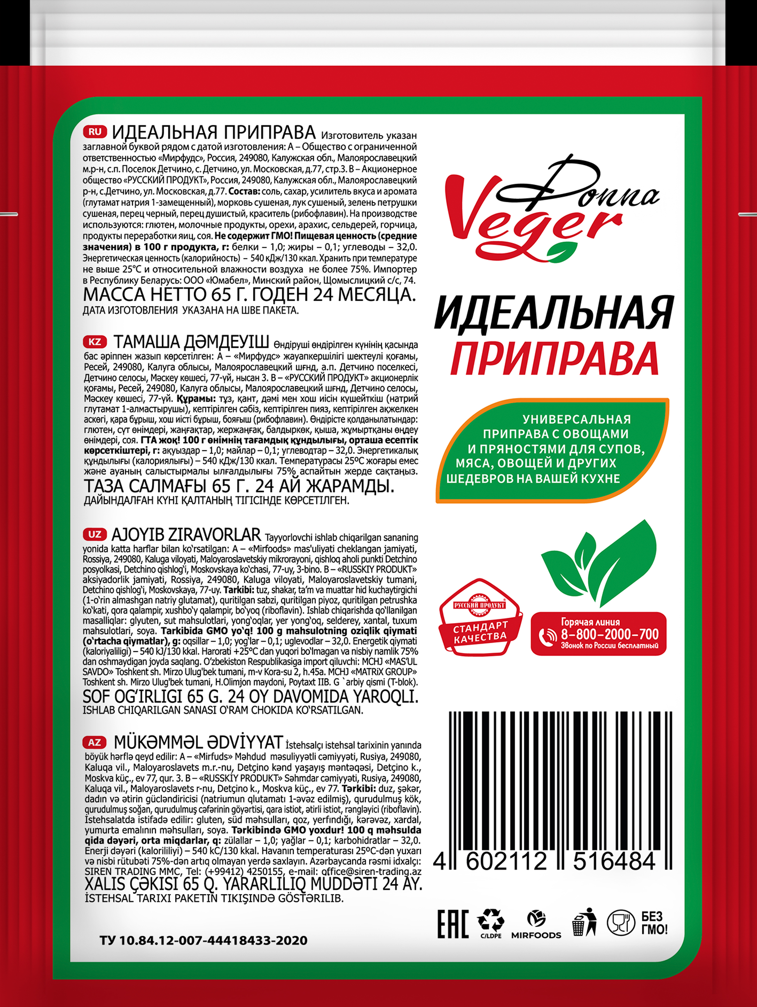 | Donna VEGER | Бакалея | Идеальная приправа | Приправа Идеальная Donna VEGER 65г /30 уп в ш/б (Мирфудс) | 2700203 | пакет |  4602112516484 | 65 | 0,0001 | 120 | 5 | 160 |  |  | 20 | Универсальная приправа с овощами и пряностями для супов, мяс... | Готовый продукт	 | соль, сахар, усилитель вкуса и аромата (глутамат натрия 1-за... | 3D Лицевая Оборотная | 130.0 | 1 | 0.1 | 32 | 24 |  | Хранить при температуре не выше 25°С и относительной влажнос... | 30 | шоу-бокс |  4602112516491 | 1,95 | 2,24 | 0,00663 | 130 | 300 | 170 | Слой | 720 | 24 | 6480 | 216 | 9 | 24 ш/б х 9 слоев | 1680 | ООО Мирфудс | 249080, Россия, Калужская обл, Малоярославецкий р-н, Детчино... | ЕАЭС N RU Д-RU.РА02.В.16556/23 | 02.03.2023 - 01.03.2026 | соответствует требованиям ТУ 10.84.12-007-44418433-2020 | Скачать | 2103909009 | 10.84.12.150 |