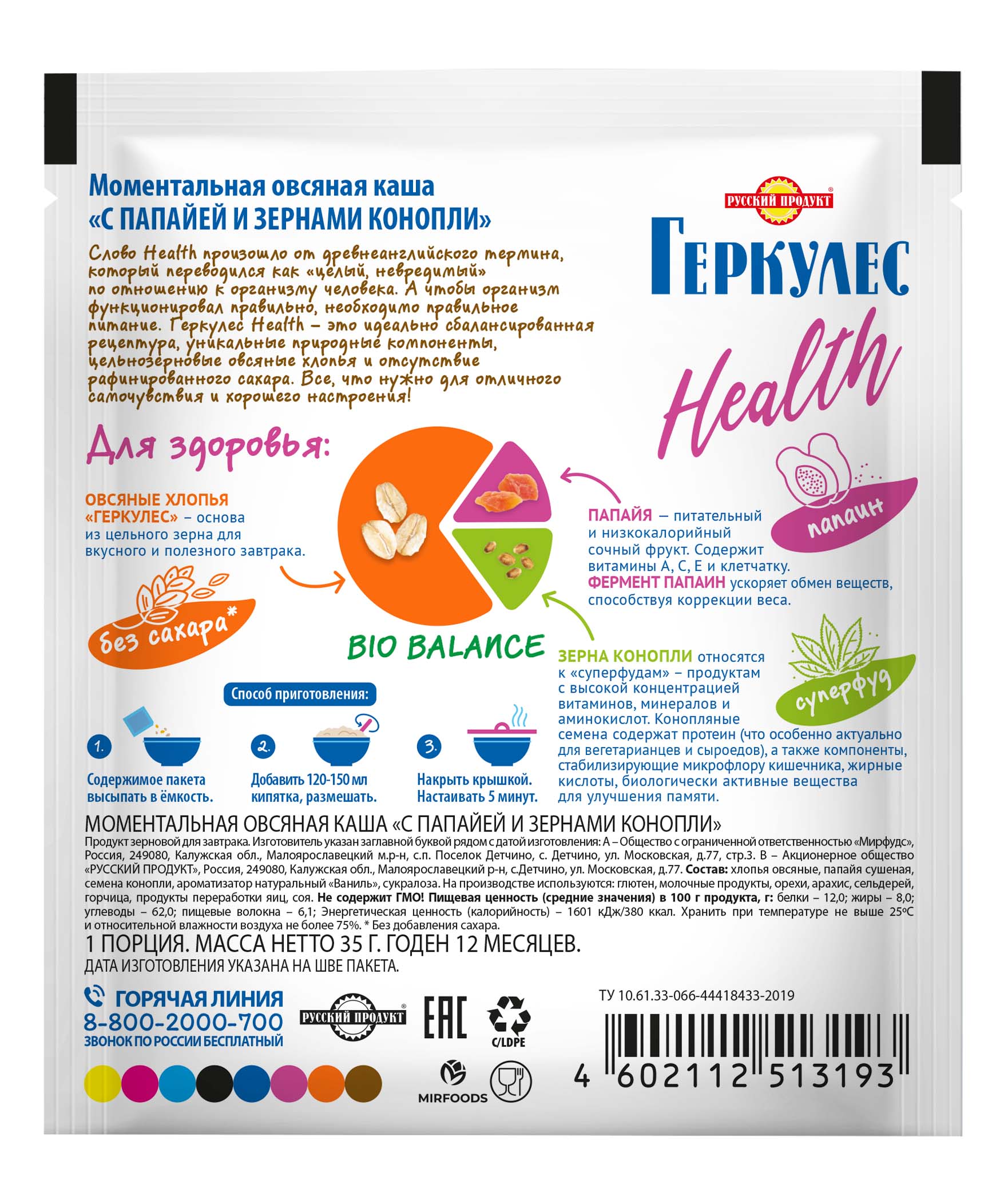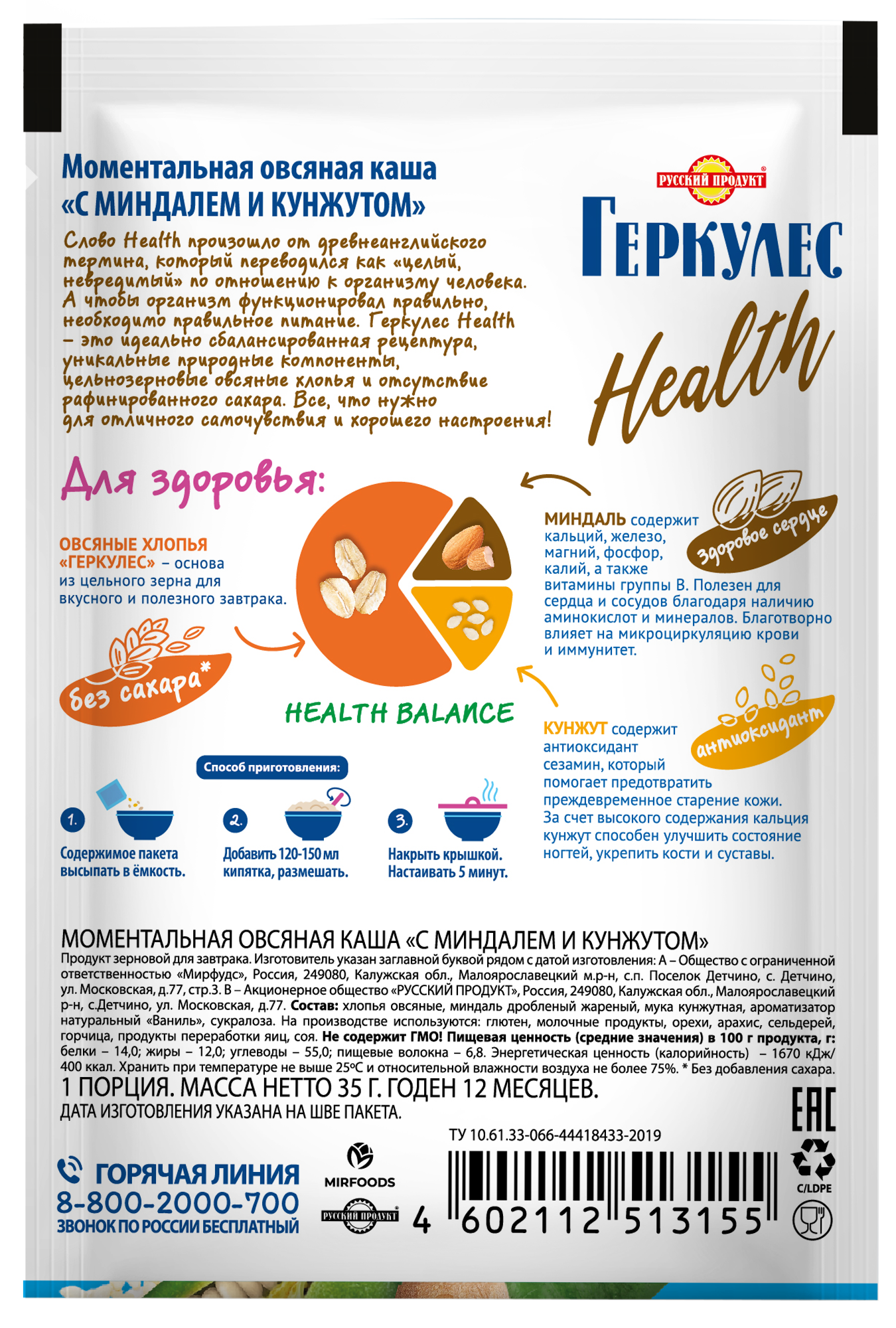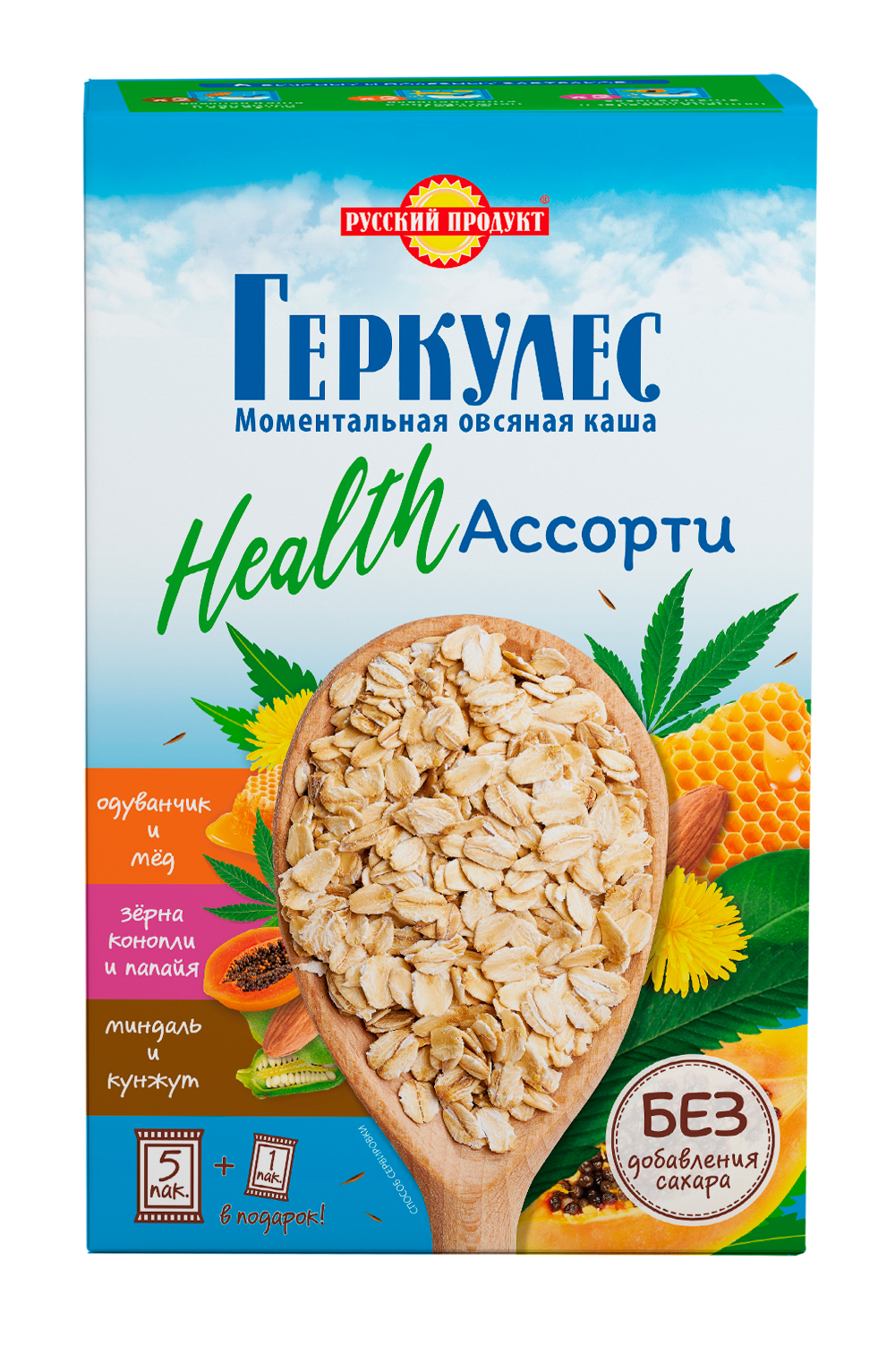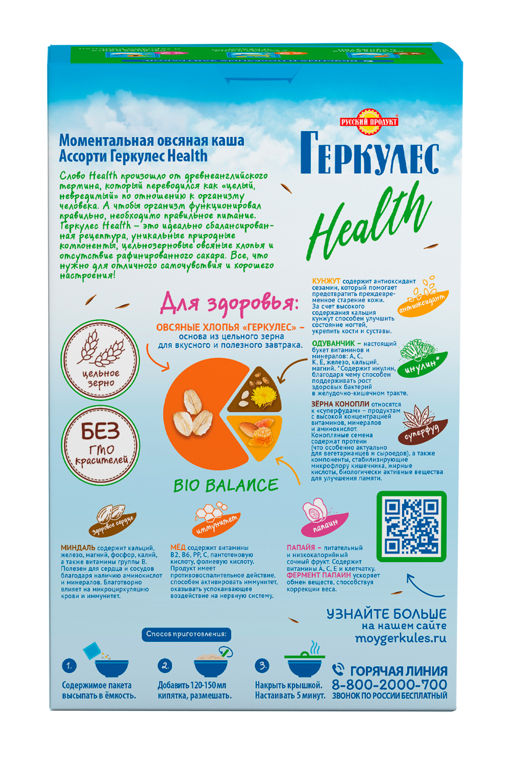 | Геркулес | Бакалея | Каши моментальные Геркулес | Овсяная каша момент Ассорти "Геркулес Health" (миндаль, одув... | 2700092 | Коробка |  4602112514541 | 210 | 0,00118 | 138 | 45 | 190 |  |  | 10 | Слово Health произошло от древнеанглийского термина, который... | Способ приготовления: