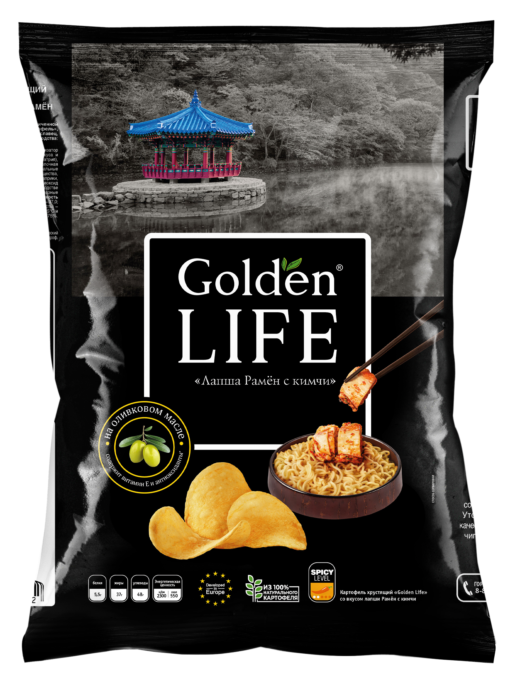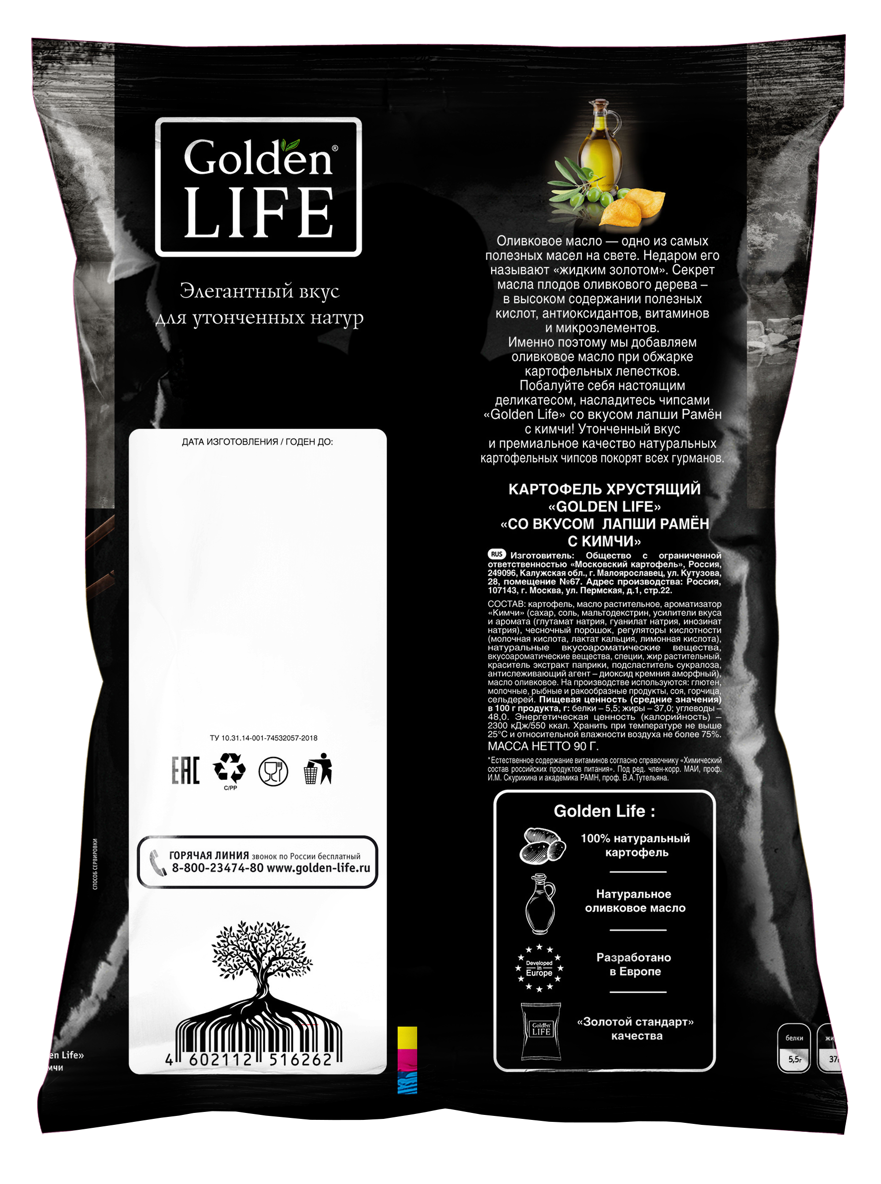 | Golden Life | Снеки | Golden Life: Средняя фасовка. Картофельные чипсы | Картофель хруст. Golden Life "Со вкусом лапши Рамён с кимчи"... | 2602006 | Пакет-подушка |  4602112516262 | 90 | 0,00284 | 163 | 60 | 290 |  |  | 20 | Golden Life cо вкусом лапши рамён с кимчи - волнующее азиатс... | Готовый продукт. |   картофель, масло растительное, ароматизатор "Кимчи" (сахар... | 3D Лицевая Оборотная | 550.0 | 5.5 | 37 | 48 | 9 |  | Хранить при температуре не выше 25°С и относительной влажнос... | 12 | гофрокороб |  4602112516279 | 1,08 | 1,48 | 0,02442 | 295 | 385 | 215 | 1 паллета | 96 | 8 | 672 | 56 | 7 | 8 г/к х 7 слоев | 1655 | ООО Москарт | 107143, Россия, Москва г, ул. Пермская вл. 1 | ЕАЭС N RU Д-RU.РА04.В.01255/24 | 03.05.2024 - 02.05.2027 | соответствует требованиям ТУ10.31.14-001-74532057-2018 | Скачать | 2005202000 | 10.31.14.000 |