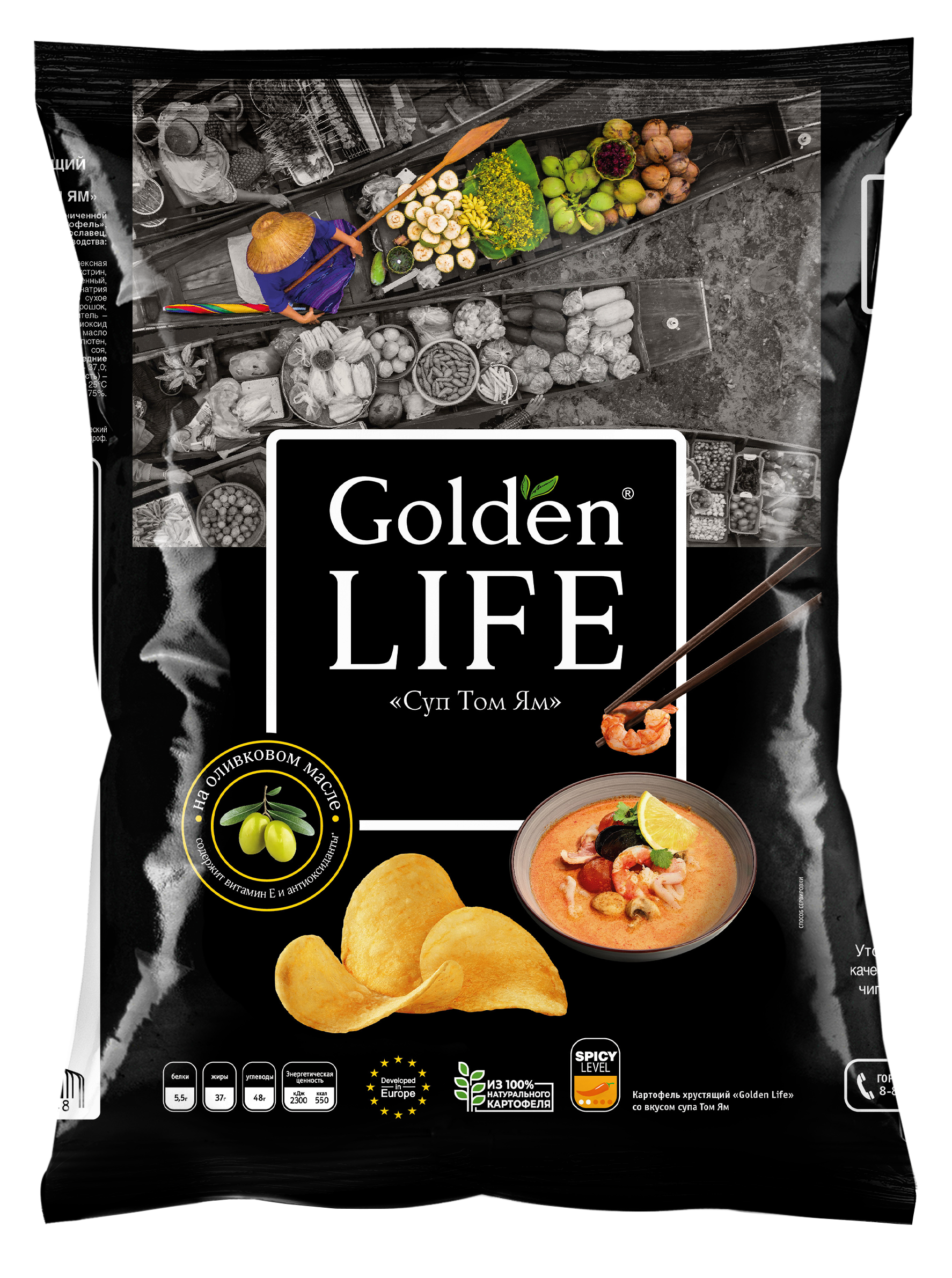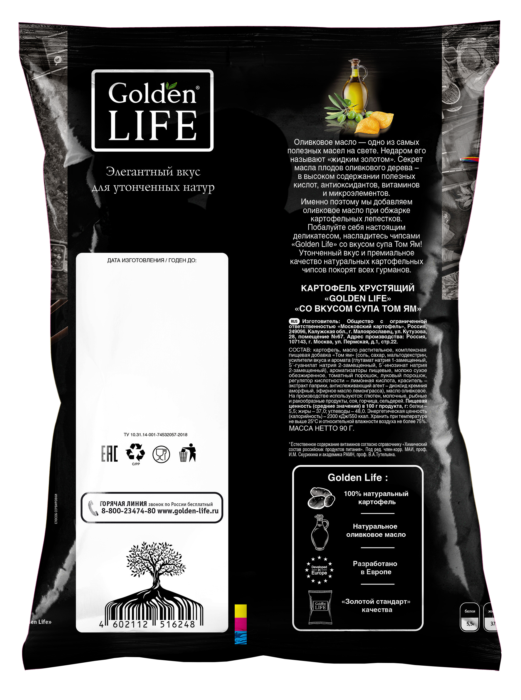 | Golden Life | Снеки | Golden Life: Средняя фасовка. Картофельные чипсы | Картофель хруст. Golden Life "Со вкусом супа Том Ям" 90г/ 12... | 2602010 | Пакет-подушка |  4602112516248 | 90 | 0,00284 | 163 | 60 | 290 |  |  | 20 | Golden Life cо вкусом супа Том Ям - изысканное сочетание ост... | Готовый продукт.  | картофель, масло растительное, комплексная пищевая добавка "... | 3D Лицевая Оборотная | 550.0 | 5.5 | 37 | 48 | 9 |  | Хранить при температуре не выше 25°С и относительной влажнос... | 12 | гофрокороб |  4602112516255 | 1,08 | 1,48 | 0,02442 | 295 | 385 | 215 | 1 паллета | 96 | 8 | 672 | 56 | 7 | 8 г/к х 7 слоев | 1655 | ООО Москарт | 107143, Россия, Москва г, ул. Пермская вл. 1 | ЕАЭС N RU Д-RU.РА04.В.23845/25 | 12.05.2025 - 01.12.2027 | соответствует требованиям ТУ 10.31.14-001-74532057-2018 | Скачать | 2005202000 | 10.31.14.000 |