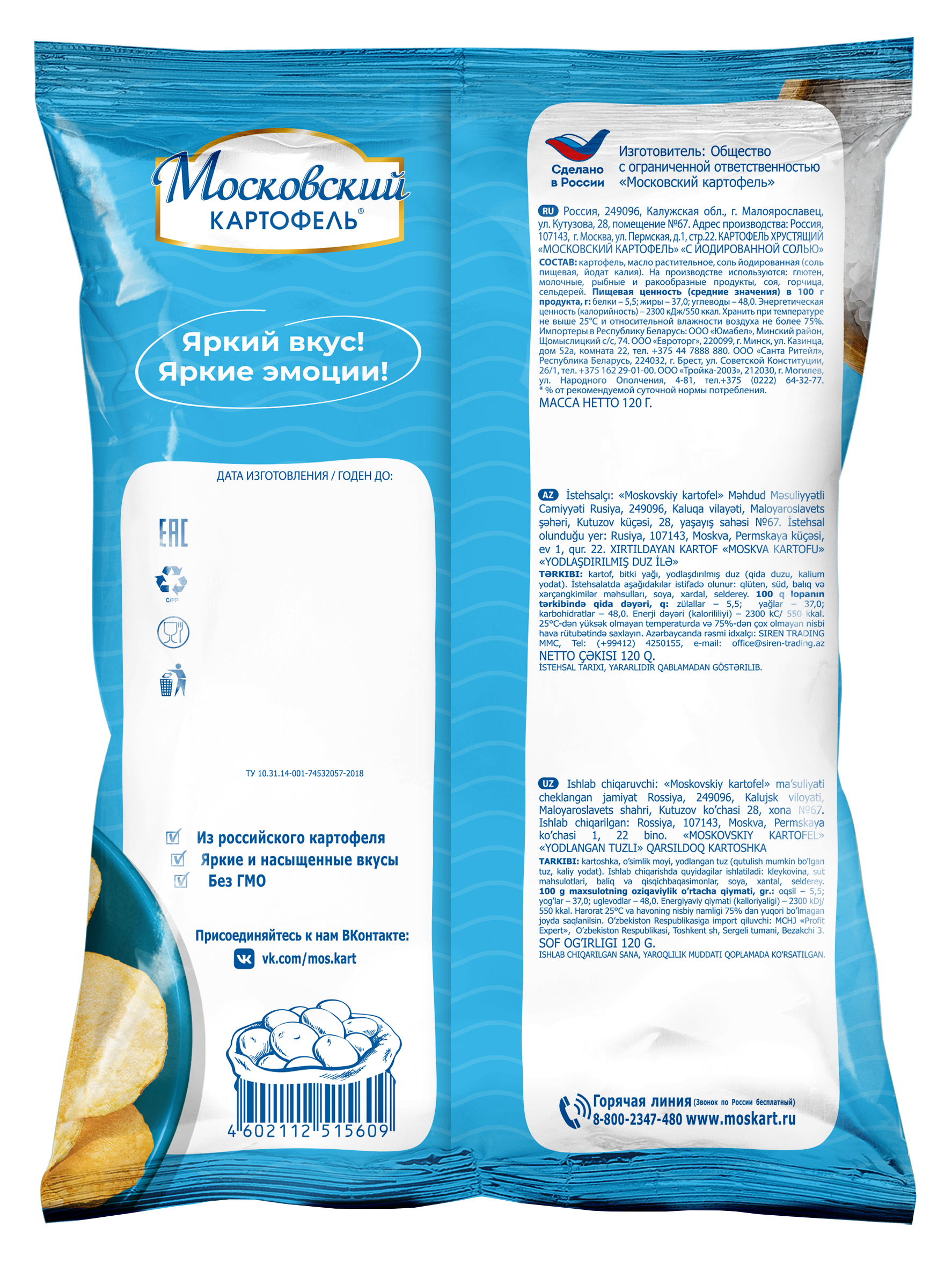 | Московский Картофель | Снеки | Московский картофель: Большая фасовка | Картофель Московский хруст. с йодир. солью 120г/16 уп в кор ... | 2601982 | Пакет-подушка |  4602112515609 | 120 | 0,00553 | 205 | 90 | 300 |  |  | 20 | Классика жанра и знакомый с детства вкус: хрустящий картофел... | Готовый продукт. | картофель, масло растительное, соль йодированная (соль пищев... | 3D Лицевая Оборотная | 550.0 | 5.5 | 37 | 48 | 9 |  | Хранить при температуре не выше 25°С и относительной влажнос... | 16 | гофрокороб |  4602112515616 | 1,92 | 2,2 | 0,04955 | 585 | 385 | 220 | 1 паллета | 64 | 4 | 448 | 28 | 7 | 4 г/к х 7 слоев | 1690 | ООО Москарт | 107143, Россия, Москва г, ул. Пермская вл. 1 | ЕАЭС N RU Д-RU.РА04.В.23845/25 | 12.05.2025 - 01.12.2027 | соответствует требованиям ТУ 10.31.14-001-74532057-2018 | Скачать | 2005202000 | 10.31.14.000 |