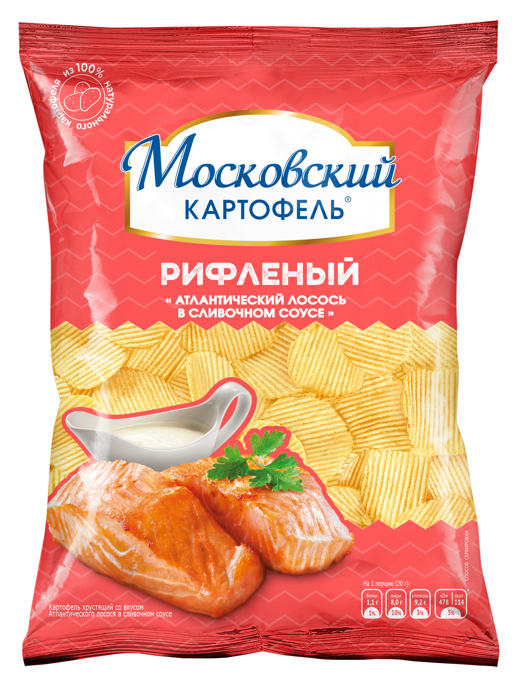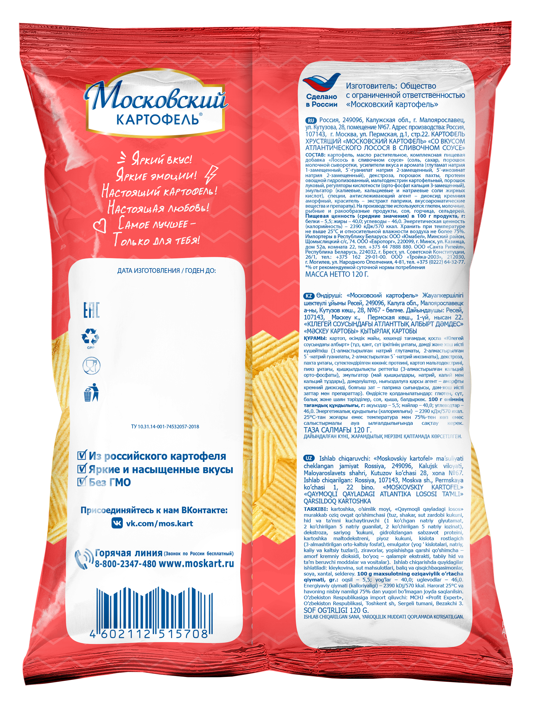 | Московский Картофель | Снеки | Московский картофель: Большая фасовка. Рифленые | Картофель Московский хруст. рифл со вкусом атлантического ло... | 2601965 | Пакет-подушка |  4602112515708 | 120 | 0,00553 | 205 | 90 | 300 |  |  | 20 | Идеальное сочетание сочного вкуса атлантического лосося, неж... | Готовый продукт.  | картофель, масло растительное, комплексная пищевая добавка "... | 3D Лицевая Оборотная | 570.0 | 5.5 | 40 | 46 | 9 |  | Хранить при температуре не выше 25°С и относительной влажнос... | 16 | гофрокороб |  4602112515715 | 1,92 | 2,2 | 0,04955 | 585 | 385 | 220 | 1 паллета | 64 | 4 | 448 | 28 | 7 | 4 г/к х 7 слоев | 1690 | ООО Москарт | 107143, Россия, Москва г, ул. Пермская вл. 1 | ЕАЭС N RU Д-RU.РА04.В.23845/25 | 12.05.2025 - 01.12.2027 | соответствует требованиям ТУ 10.31.14-001-74532057-2018 | Скачать | 2005202000 | 10.31.14.000 |