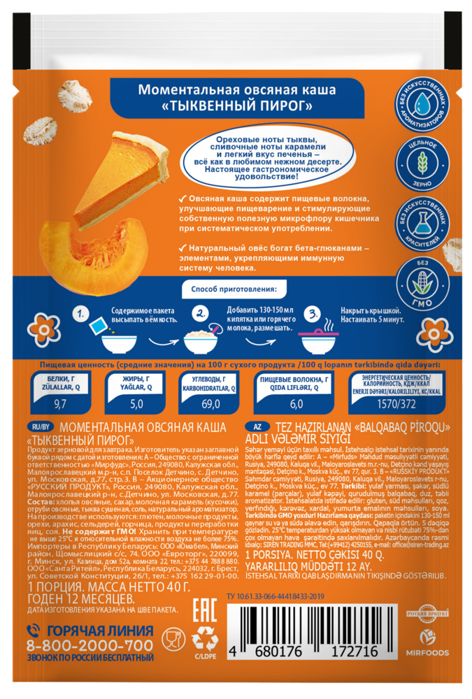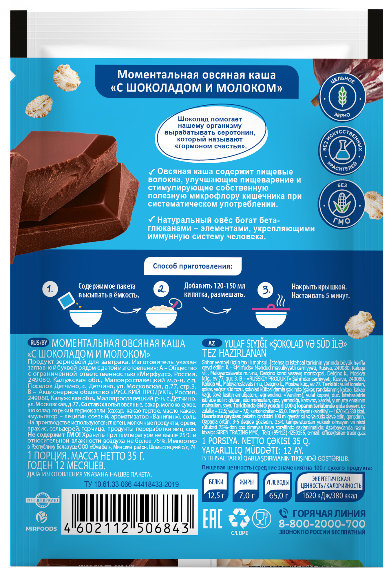 2. Добавить 130-15... | Хлопья овсяные, сахар, молочная карамель (кусочки), отруби о... | 3D Лицевая Оборотная | 372.0 | 9.7 | 5 | 69 | 12 |  | Хранить при температуре не выше 25°С и относительной влажнос... | 30 | шоу-бокс |  4680176172723 | 1,2 | 1,35 | 0,00652 | 107 | 398 | 153 | Слой | 660 | 22 | 6600 | 220 | 10 | 22 ш/б х 10 слоев | 1690 | ООО Мирфудс | 249080, Россия, Калужская обл, Малоярославецкий р-н, Детчино... | ЕАЭС N RU Д-RU.РА08.В.89078/25 | 02.10.2025 - 01.10.2028 | соответствует требованиям ТУ 10.61.33-066-44418433-2019 | Скачать | 1904908000 | 10.61.33.110 |