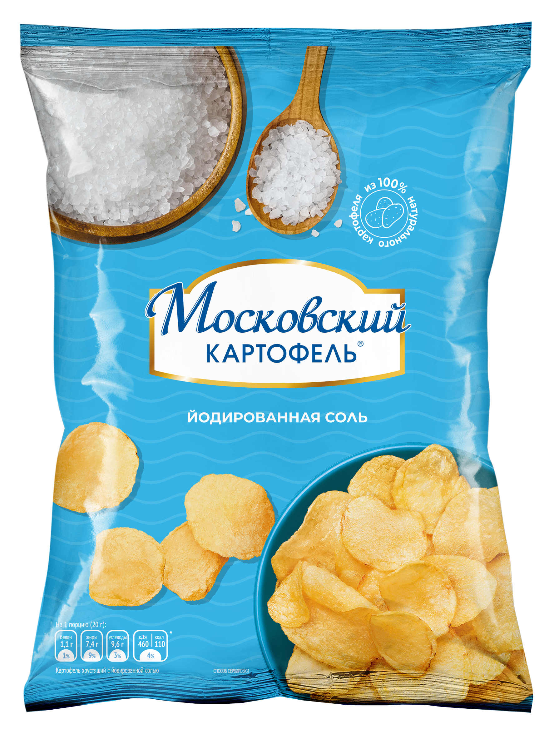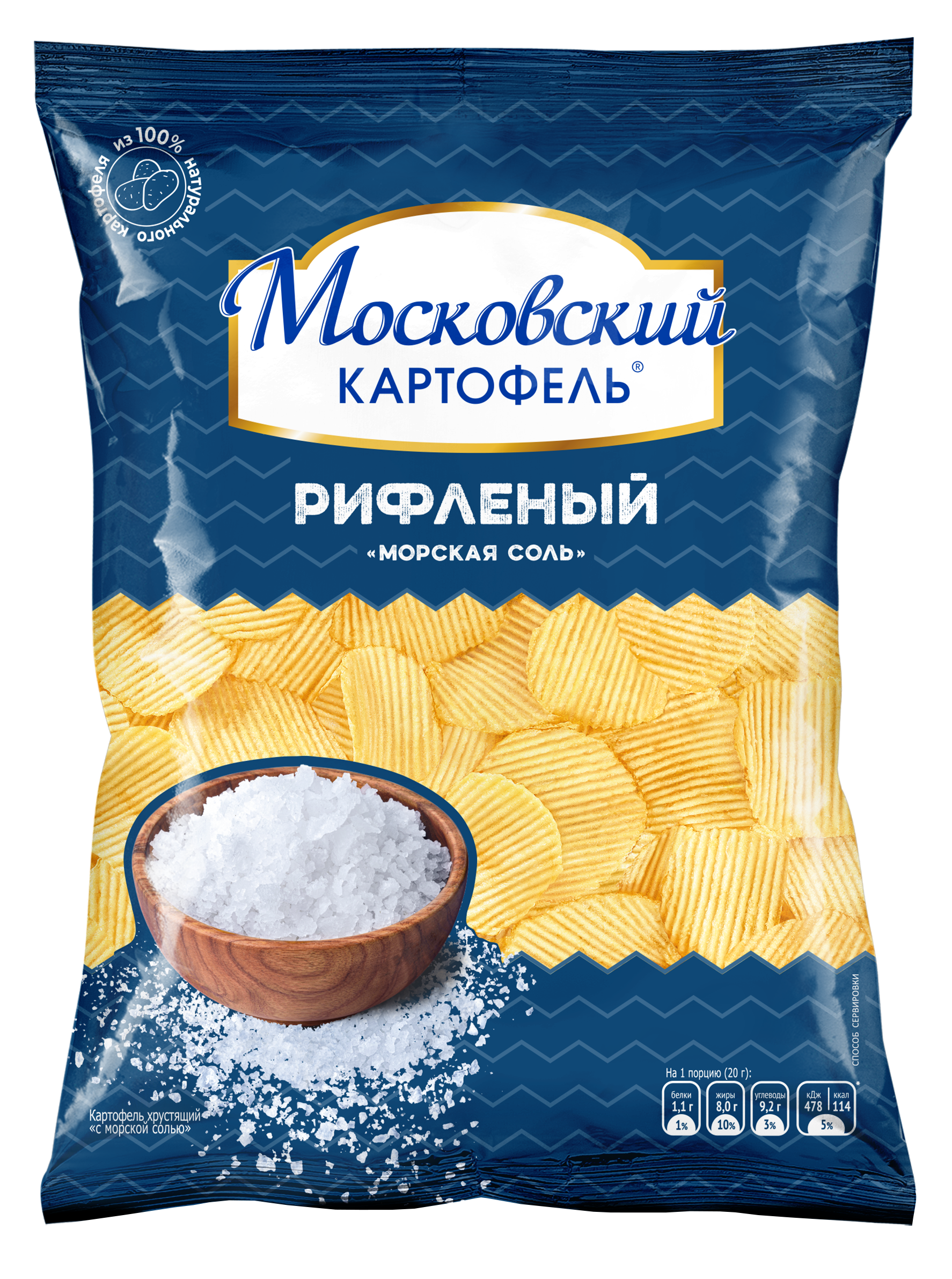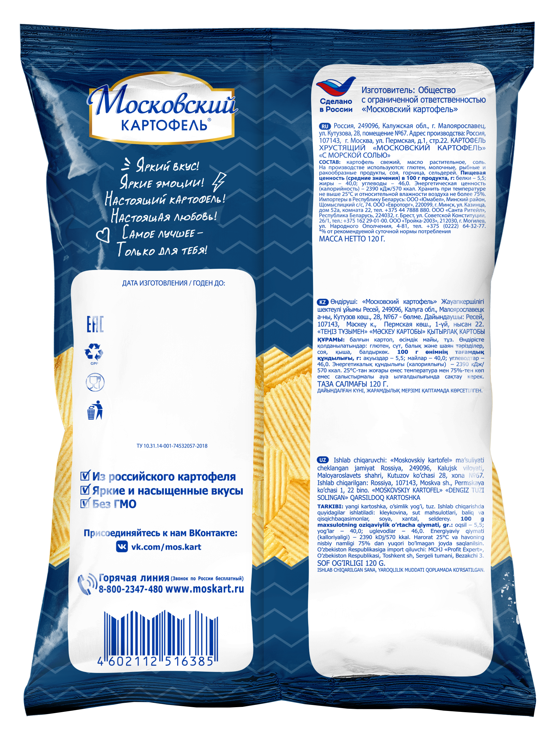 | Московский Картофель | Снеки | Московский картофель: Большая фасовка. Рифленые | Картофель Московский хруст. рифл с морской солью 120г/16 уп ... | 2601964 | Пакет-подушка |  4602112516385 | 120 | 0,00553 | 205 | 90 | 300 |  |  | 20 | Натуральный вкус отборного картофеля и польза морской соли -... | Готовый продукт. | картофель свежий, масло растительное, соль.
