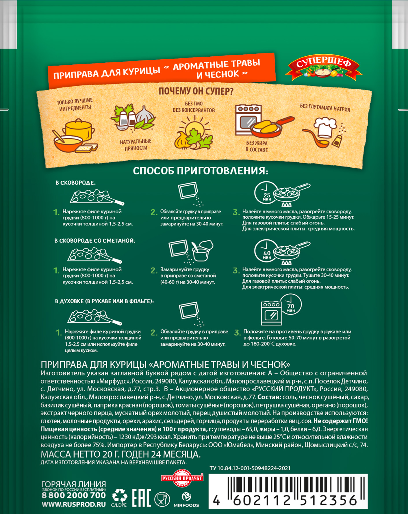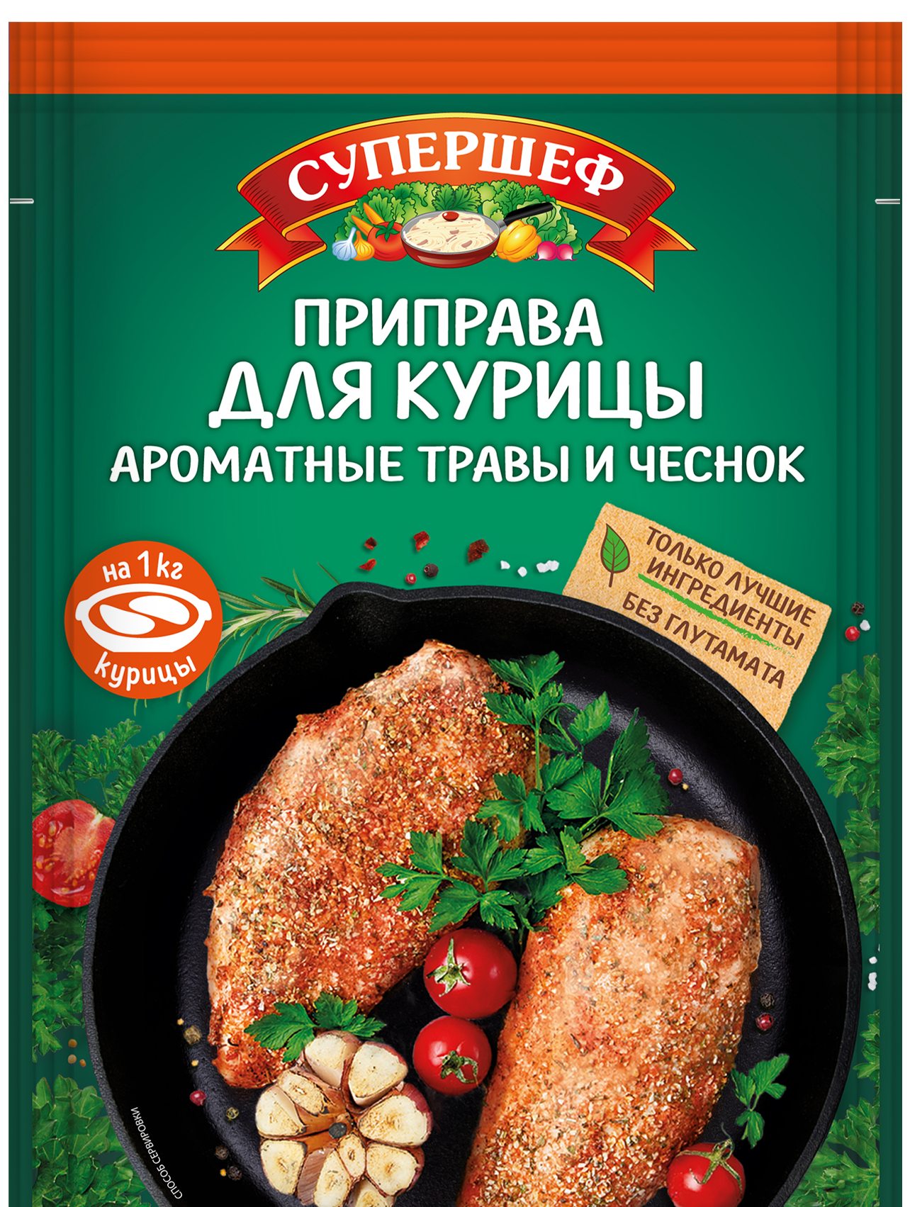 | Супершеф | Бакалея | Специи и приправы | Приправа для курицы "Супершеф" Ароматные травы и чеснок 20г/... | 2700212 | пакет |  4602112512356 | 20 | 0,0001 | 120 | 5 | 160 |  |  | 20 | Идеальное сочетание трав и чеснока для сочной и ароматной ку... | в сковороде: