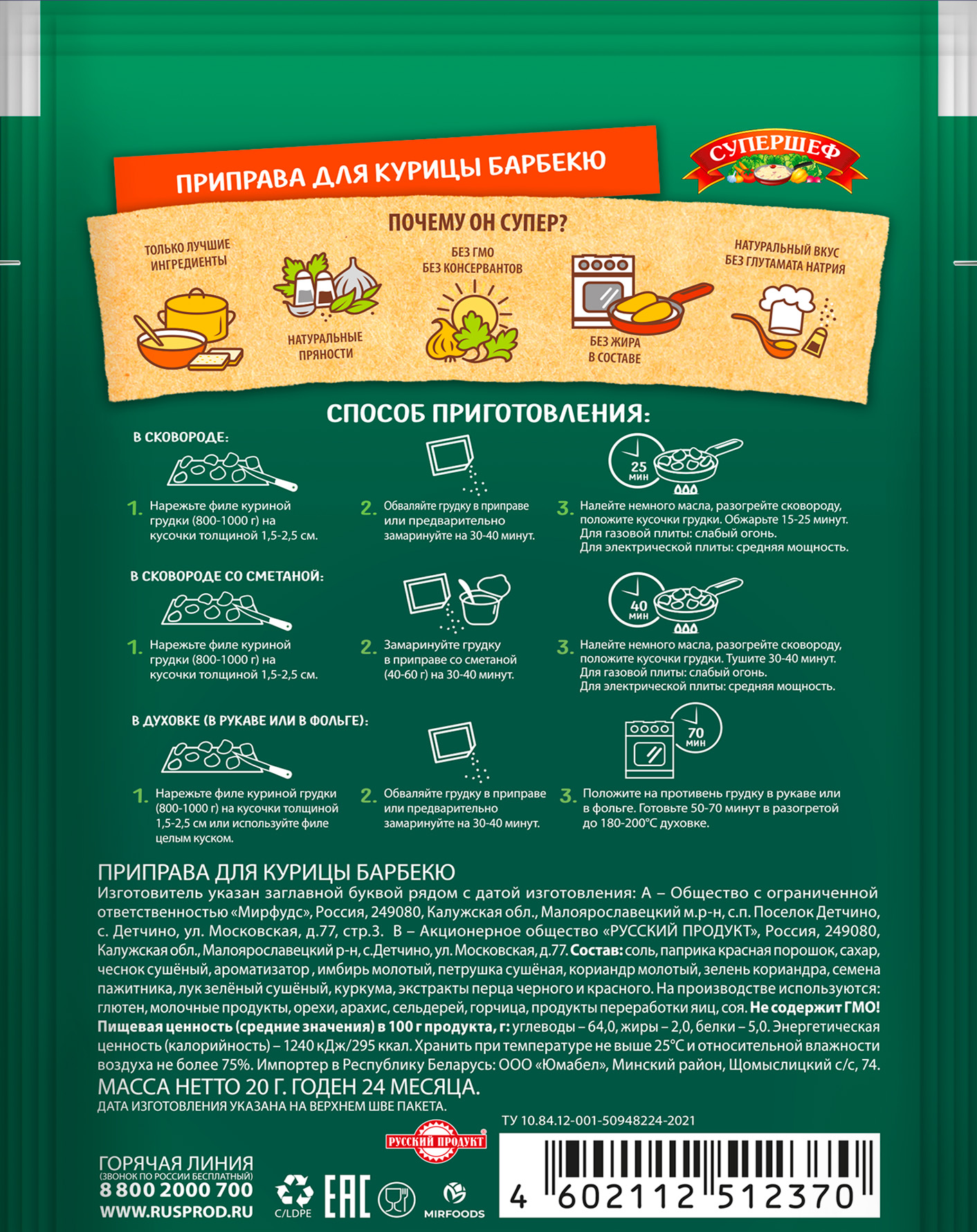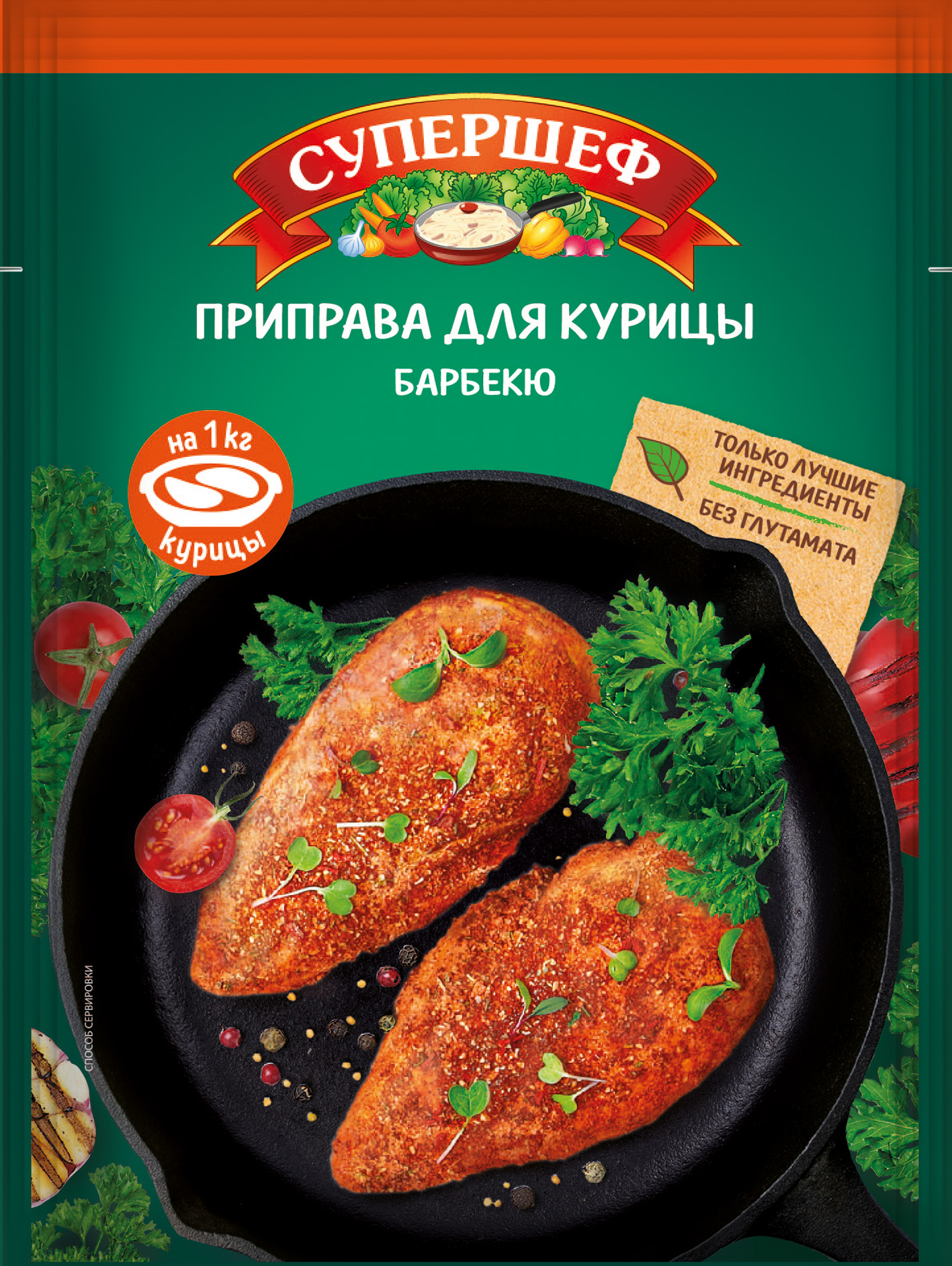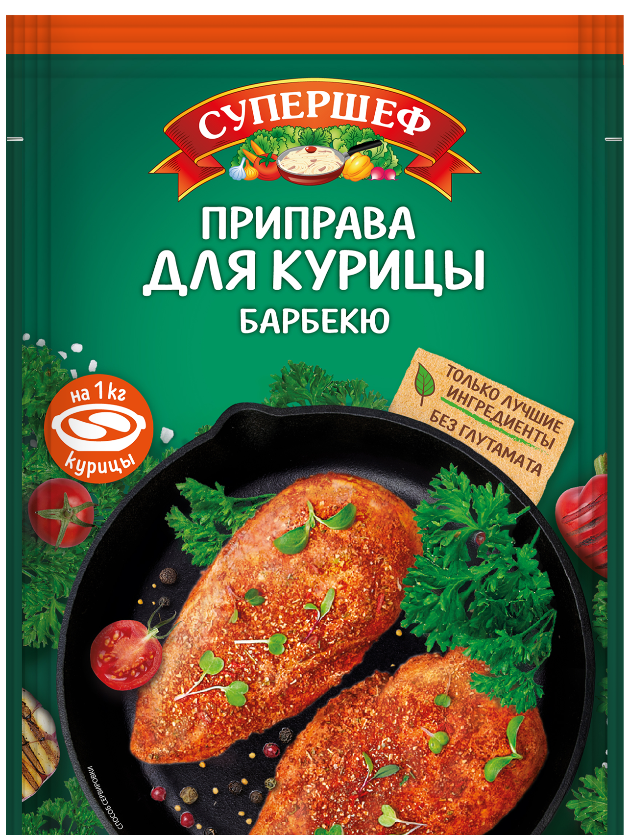 | Супершеф | Бакалея | Специи и приправы | Приправа для курицы "Супершеф" Барбекю 20г/15 уп в ш/б | 2700210 | пакет |  4602112512370 | 20 | 0,0001 | 120 | 5 | 160 |  |  | 20 | Идеальное сочетание специй барбекю для сочной и ароматной ку... | в сковороде: