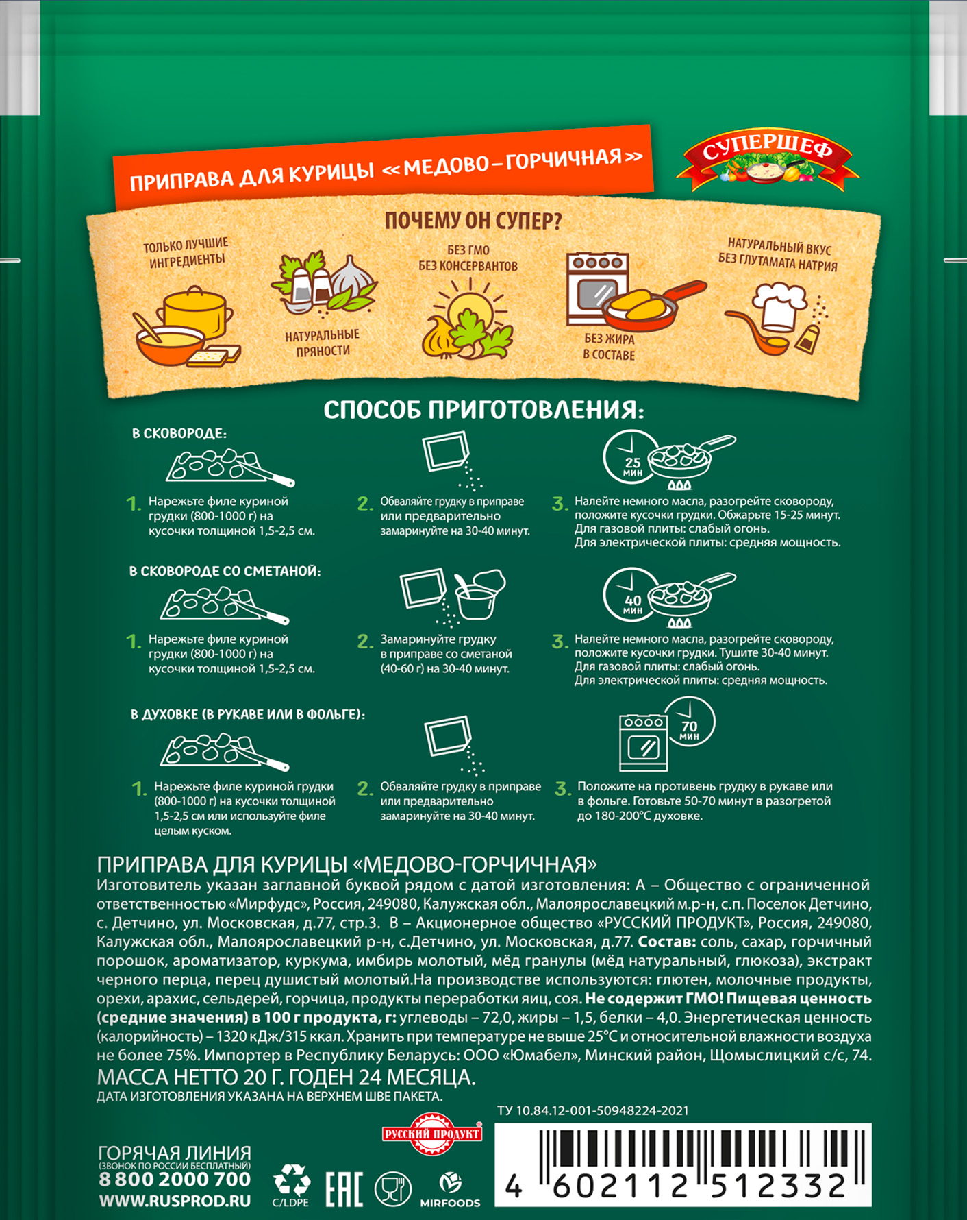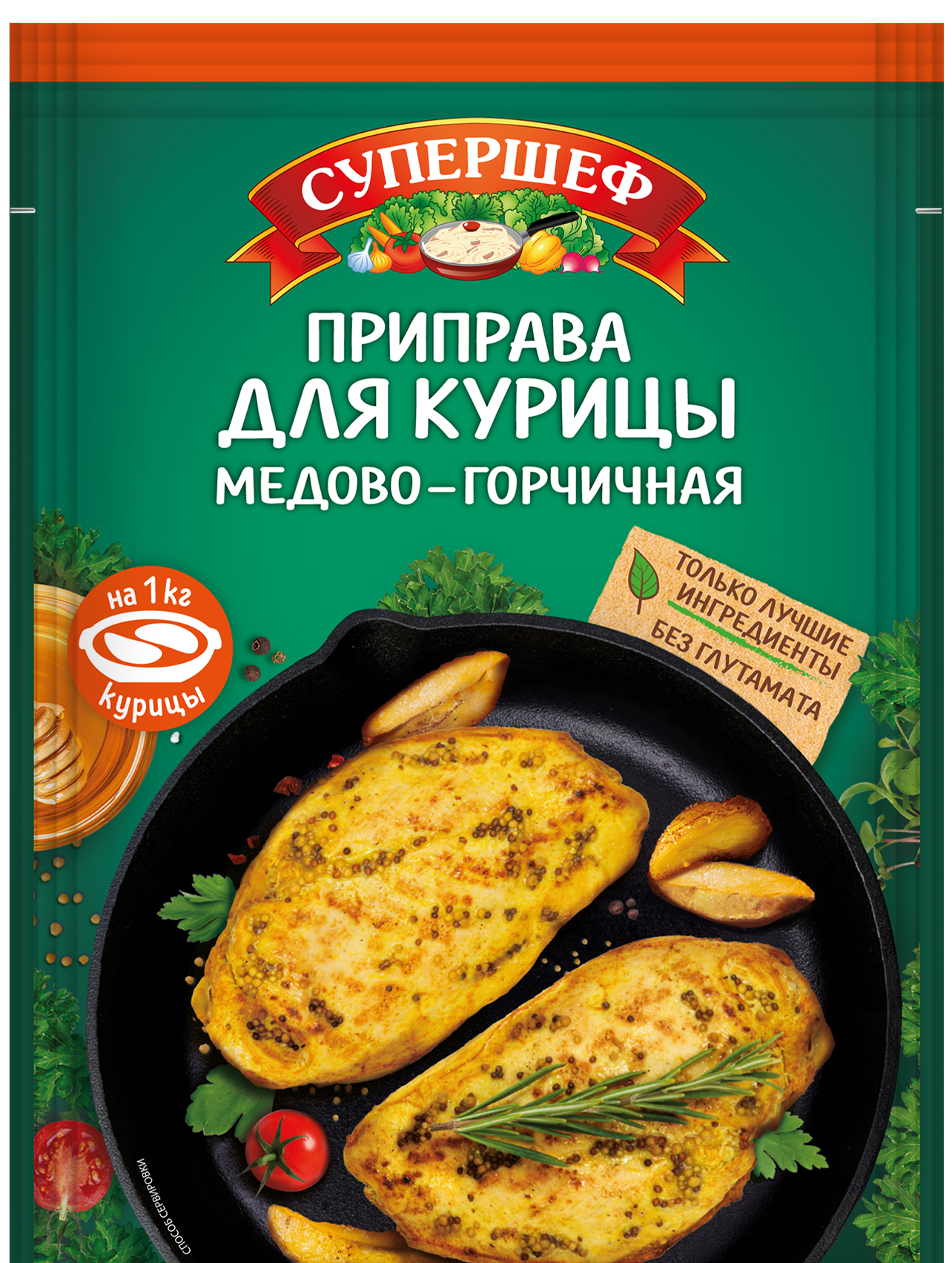 | Супершеф | Бакалея | Специи и приправы | Приправа для курицы "Супершеф" Медово-горчичная 20г/15 уп в ... | 2700211 | пакет |  4602112512332 | 20 | 0,0001 | 120 | 5 | 160 |  |  | 20 | Сочетание специй, мёда и горчицы для ароматной курицы. Натур... | в сковороде: