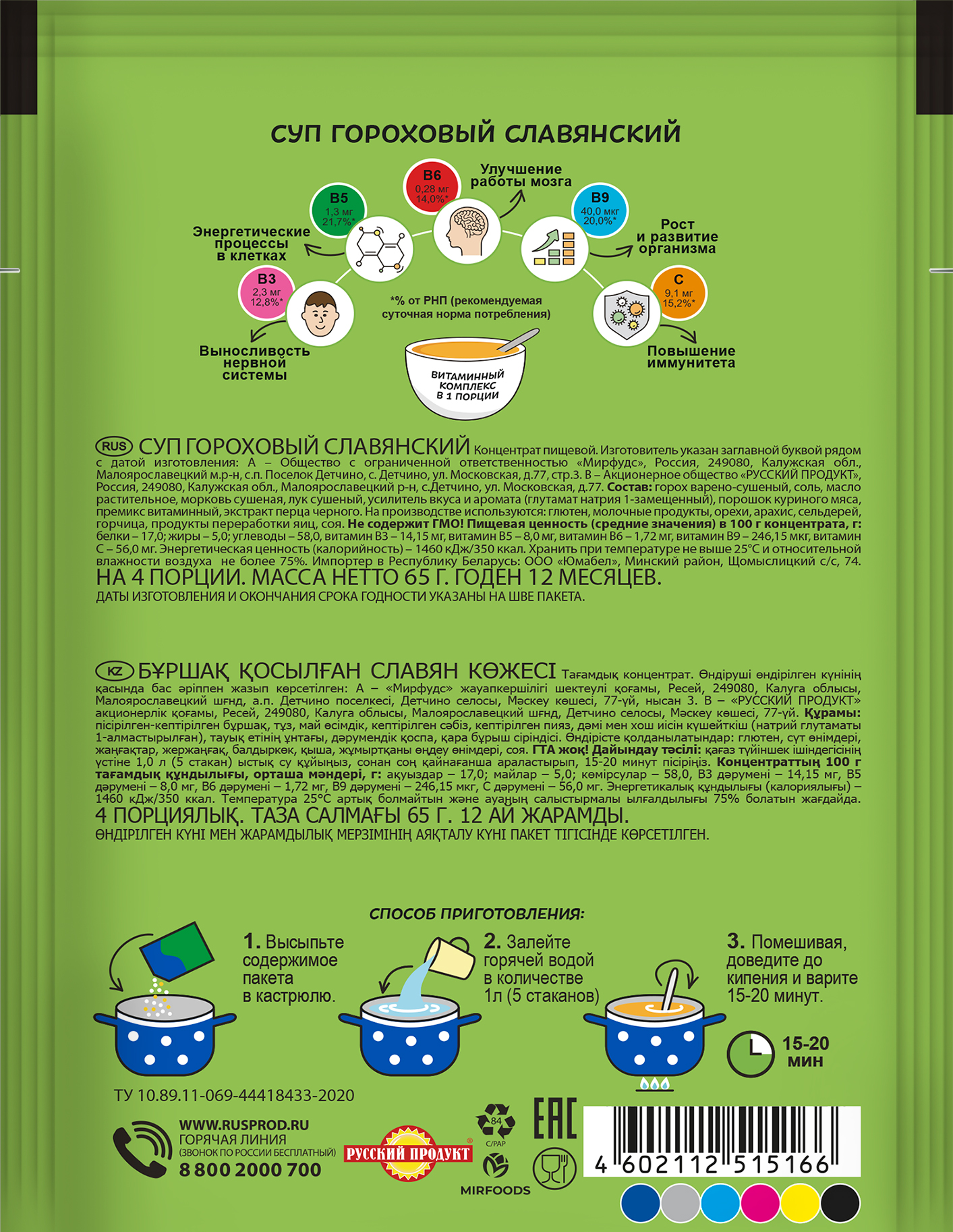 Имеет однородную консистенци... |  Разведите 90 г сухого продукта в 1 л теплой / холодной воды... | мука пшеничная в/с, крахмал кукурузный, концентрат порошковы... | 3D Лицевая Оборотная | 375.0 | 6 | 15 | 53 | 12 |  | Хранить при температуре не выше 25°С и относительной влажнос... | 4 | гофрокороб |  4602112513377 | 6,8 | 7,22 | 0,028 | 400 | 200 | 350 | Слой | 48 | 12 | 192 | 48 | 4 | 12 г/к х 4 слоев | 1550 | ООО Мирфудс | 249080, Россия, Калужская обл, Малоярославецкий р-н, Детчино... | ЕАЭС N RU Д-RU.РА03.В.39440/23 | 21.04.2023 - 20.04.2026 | соответствует требованиям ТУ 10.89.11-069-44418433-2020 | Скачать | 2104100000 | 10.89.11.130 |