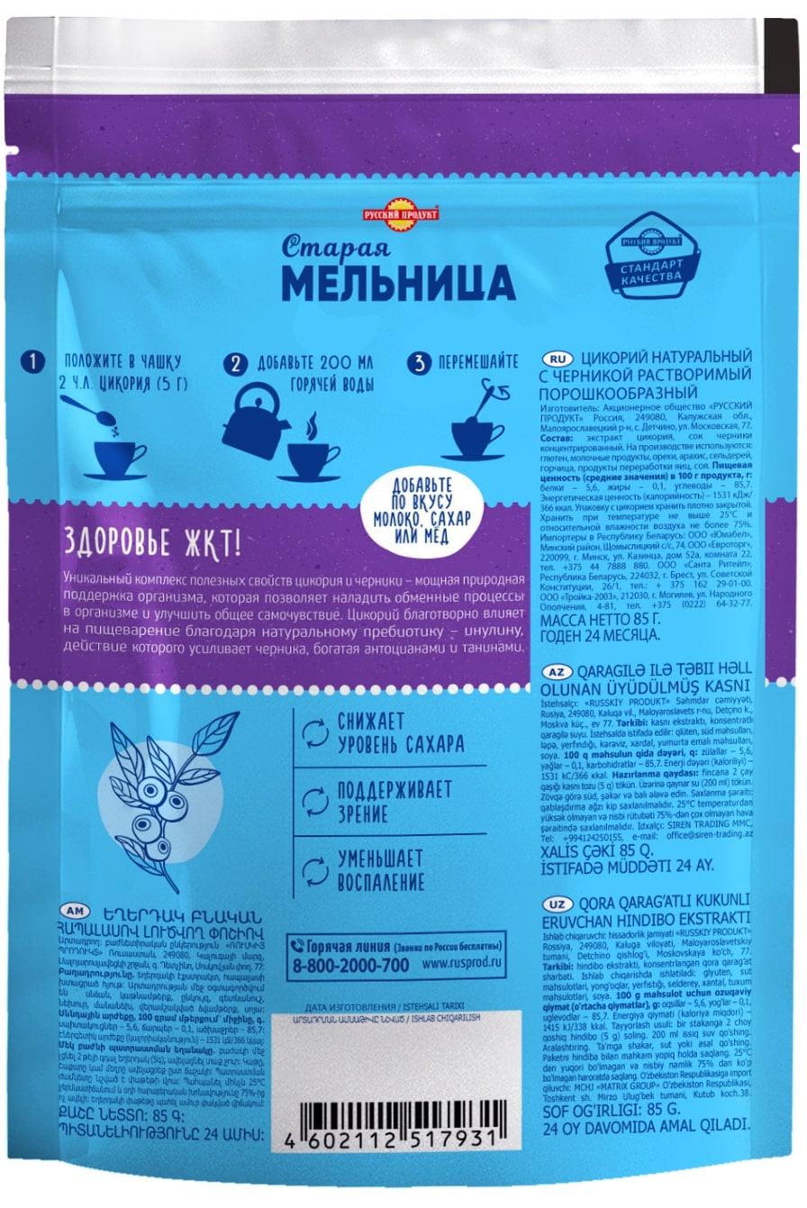 | Русский Продукт | Напитки | Цикорий растворимый (дой-пак) | Цикорий натуральный порошкообразный "Старая мельница" 85 г/1... | 2127001 | Пакет |  4602112511069 | 85 | 0,0014 | 140 | 50 | 200 |  |  | 20 | Натуральный цикорий <Старая мельница> - полезная альтернатив... |