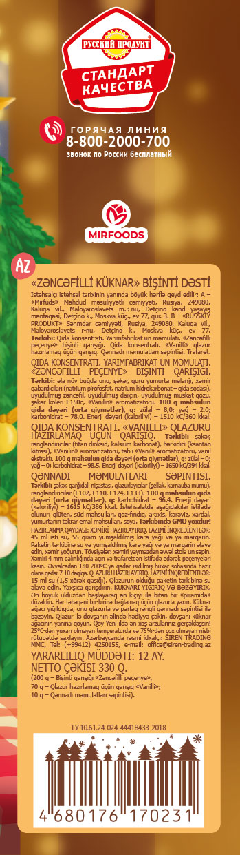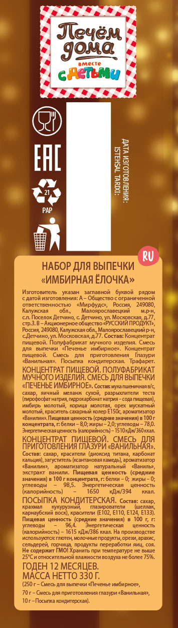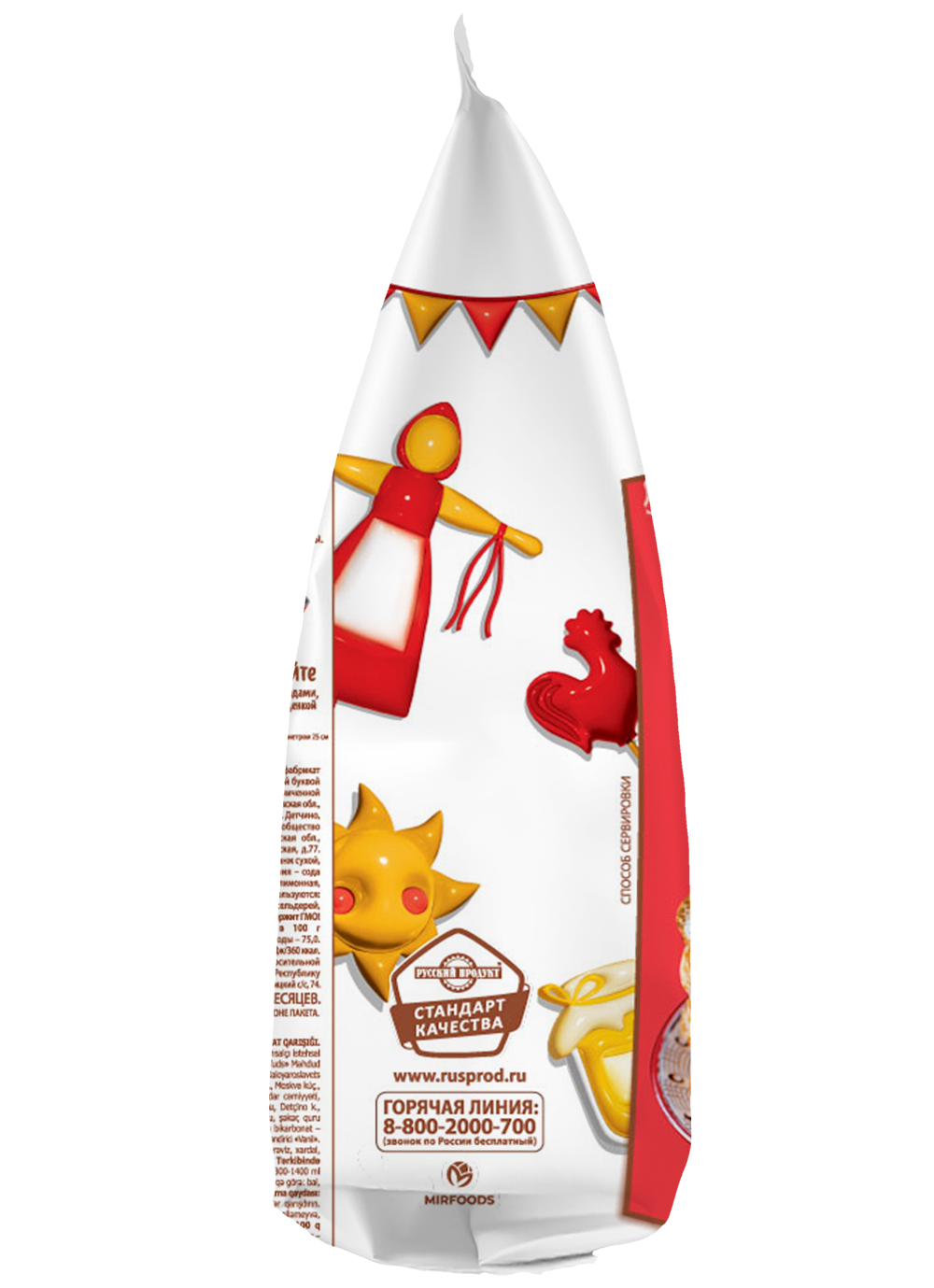 Тщательно разме... | Мука пшеничная в/с , крахмал кукурузный, заменитель сухих сл... | 3D Лицевая Оборотная | 335.0 | 6 | 4 | 69 | 12 |  | Хранить при температуре не выше 25°С и относительной влажнос... | 4 | гофрокороб |  4602112513414 | 4 | 4,3 | 0,01487 | 350 | 170 | 250 | Слой | 56 | 14 | 336 | 84 | 6 | 14 г/к х 6 слоев | 1650 | ООО Мирфудс | 249080, Россия, Калужская обл, Малоярославецкий р-н, Детчино... | ЕАЭС N RU Д-RU.РА06.В.94049/23 | 29.08.2023 - 28.08.2026 | соответствует требованиям ТУ 10.84.12-001-50948224-2021 | Скачать | 2103909009 | 10.84.12.150 |