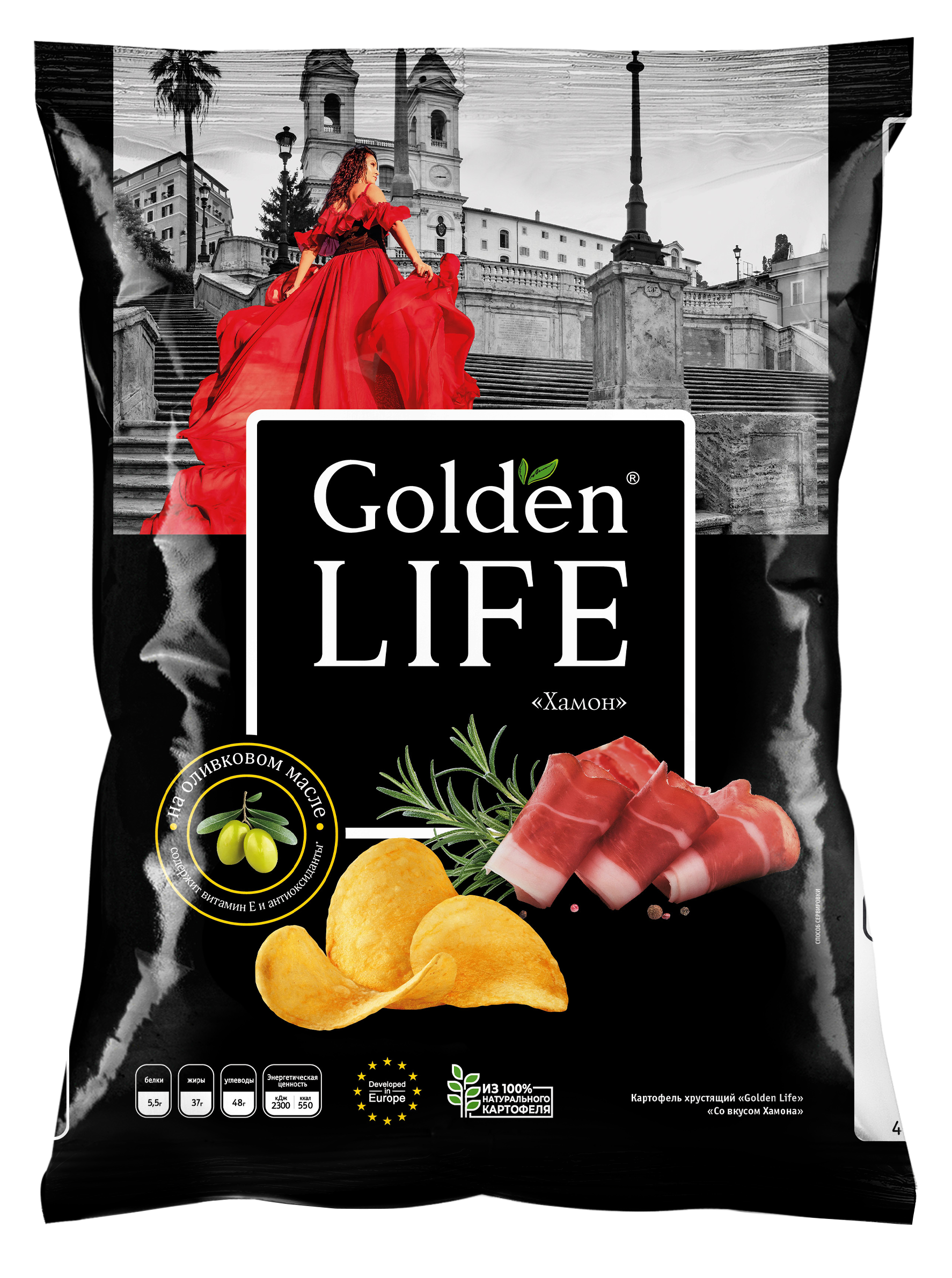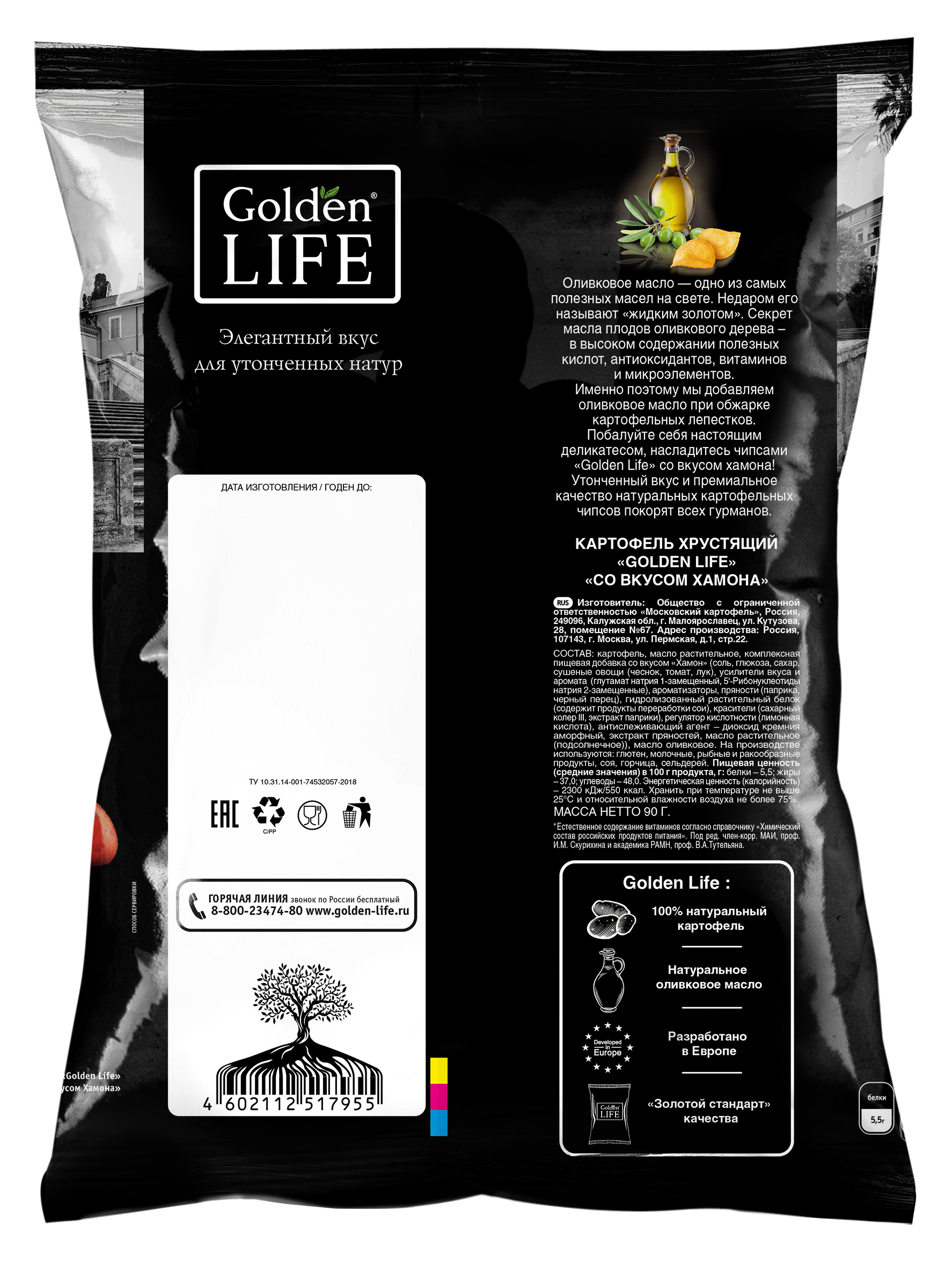 | Golden Life | Снеки | Golden Life: Средняя фасовка. Картофельные чипсы | Картофель хруст. Golden Life "Со вкусом Хамона" 90г/ 12 уп в... | 2602082 | Пакет-подушка |  4602112517955 | 90 | 0,00284 | 163 | 60 | 290 |  |  | 20 | Оливковое масло - одно из самых полезных масел на свете. Нед... | Готовый продукт | картофель, масло растительное, комплексная пищевая добавка с... | 3D Лицевая Оборотная | 550.0 | 5.5 | 37 | 48 | 9 |  | Хранить при температуре не выше 25°С и относительной влажнос... | 12 | гофрокороб |  4602112517962 | 1,08 | 1,48 | 0,02442 | 295 | 385 | 215 | 1 паллета | 96 | 8 | 672 | 56 | 7 | 8 г/к х 7 слоев | 1655 | ООО Москарт | 107143, Россия, Москва г, ул. Пермская вл. 1 | ЕАЭС N RU Д-RU.РА04.В.23845/25 | 12.05.2025 - 01.12.2027 | соответствует требованиям ТУ 10.31.14-001-74532057-2018 | Скачать | 2005202000 | 10.31.14.000 |