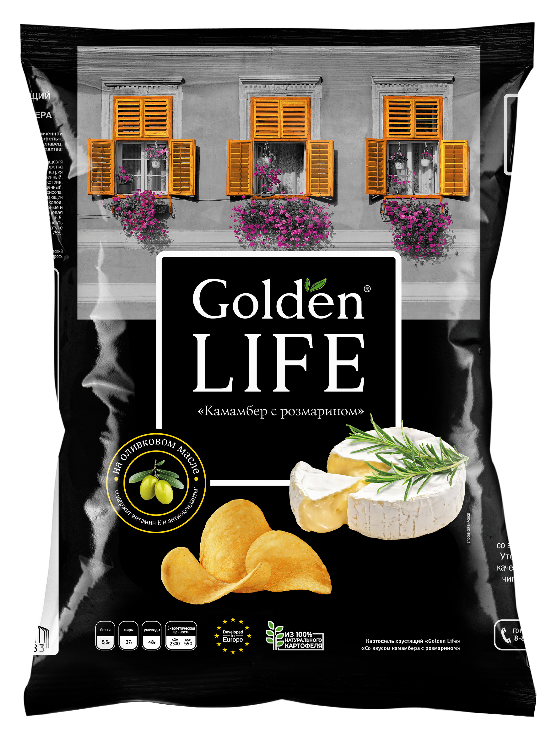 | Golden Life | Снеки | Golden Life: Средняя фасовка. Картофельные чипсы | Картофель хруст. Golden Life "Со вкусом Камамбера с розмарин... | 2602005 | Пакет-подушка |  4602112513483 | 90 | 0,00284 | 163 | 60 | 290 |  |  | 20 | Откройте для себя натуральные картофельные чипсы Golden Life... | Готовый продукт.  | картофель, масло растительное, комплексная пищевая добавка "... | 3D Лицевая Оборотная | 550.0 | 5.5 | 37 | 48 | 9 |  | Хранить при температуре не выше 25°С и относительной влажнос... | 12 | гофрокороб |  4602112513490 | 1,08 | 1,48 | 0,02442 | 295 | 385 | 215 | 1 паллета | 96 | 8 | 672 | 56 | 7 | 8 г/к х 7 слоев | 1655 | ООО Москарт | 107143, Россия, Москва г, ул. Пермская вл. 1 | ЕАЭС N RU Д-RU.РА04.В.01255/24 | 03.05.2024 - 02.05.2027 | соответствует требованиям ТУ10.31.14-001-74532057-2018 | Скачать | 2005202000 | 10.31.14.000 |