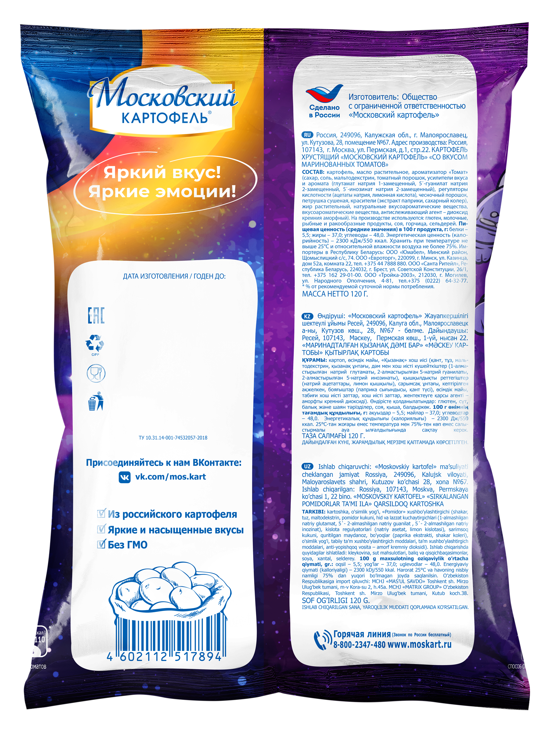 | Московский Картофель | Снеки | Московский картофель: Большая фасовка | Картофель Московский хруст. со вкусом маринованных томатов 1... | 2601949 | Пакет-подушка |  4602112517894 | 120 | 0,00553 | 205 | 90 | 300 |  |  | 20 | Жареная картошка с маринованными томатами - аппетитное блюдо... | Готовый продукт. | картофель, масло растительное, ароматизатор "Томат" (сахар, ... | 3D Лицевая Оборотная | 550.0 | 5.5 | 37 | 48 | 9 |  | Хранить при температуре не выше 25°С и относительной влажнос... | 16 | гофрокороб |  4602112517900 | 1,92 | 2,2 | 0,04955 | 585 | 385 | 220 | 1 паллета | 64 | 4 | 448 | 28 | 7 | 4 г/к х 7 слоев | 1690 | ООО Москарт | 107143, Россия, Москва г, ул. Пермская вл. 1 | ЕАЭС N RU Д-RU.РА04.В.23845/25 | 12.05.2025 - 01.12.2027 | соответствует требованиям ТУ 10.31.14-001-74532057-2018 | Скачать | 2005202000 | 10.31.14.000 |
