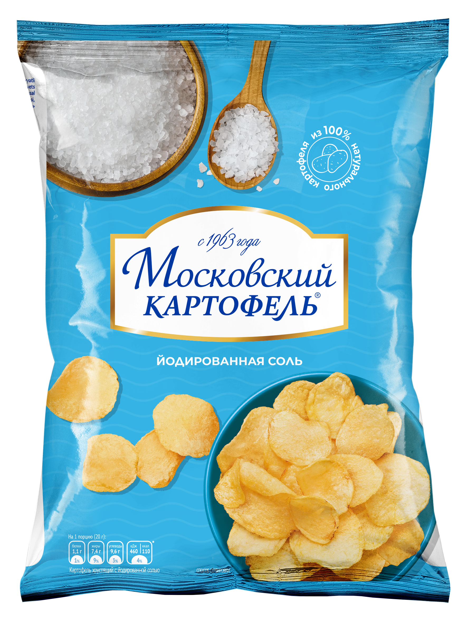 | Московский Картофель | Снеки | Московский картофель: Средняя фасовка. Рифленые | Картофель Московский хруст. рифл со вкусом картофель по-дере... | 2602192 | Пакет-подушка |  4650406701078 | 84,5 | 0,00461 | 205 | 90 | 250 | 21.07.2025 |  | 20 |  |  | картофель свежий, масло растительное, соль |  | 570.0 | 5.5 | 40 | 46 | 7 |  | Хранить при температуре от 0°С до +25°С и относительной влаж... | 16 | гофрокороб |  4650406701085 | 1,352 | 1,64 | 0,04167 | 585 | 385 | 185 | Паллета | 64 | 4 | 512 | 32 | 8 | 4 г/к х 8 слоев | 1630 | ООО Москарт | 107143, Россия, Москва г, ул. Пермская вл. 1 | ЕАЭС N RU Д-RU.РА05.В.56568/25 | 03.07.2025 - 22.01.2030 | соответствует требованиям ТУ 10.31.14-001-74532057-2018 | Скачать | 2005202000 | 10.31.14.000 |