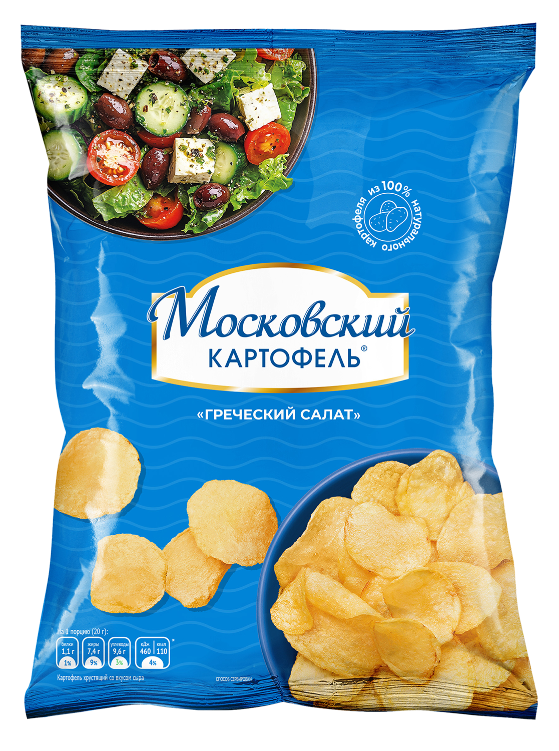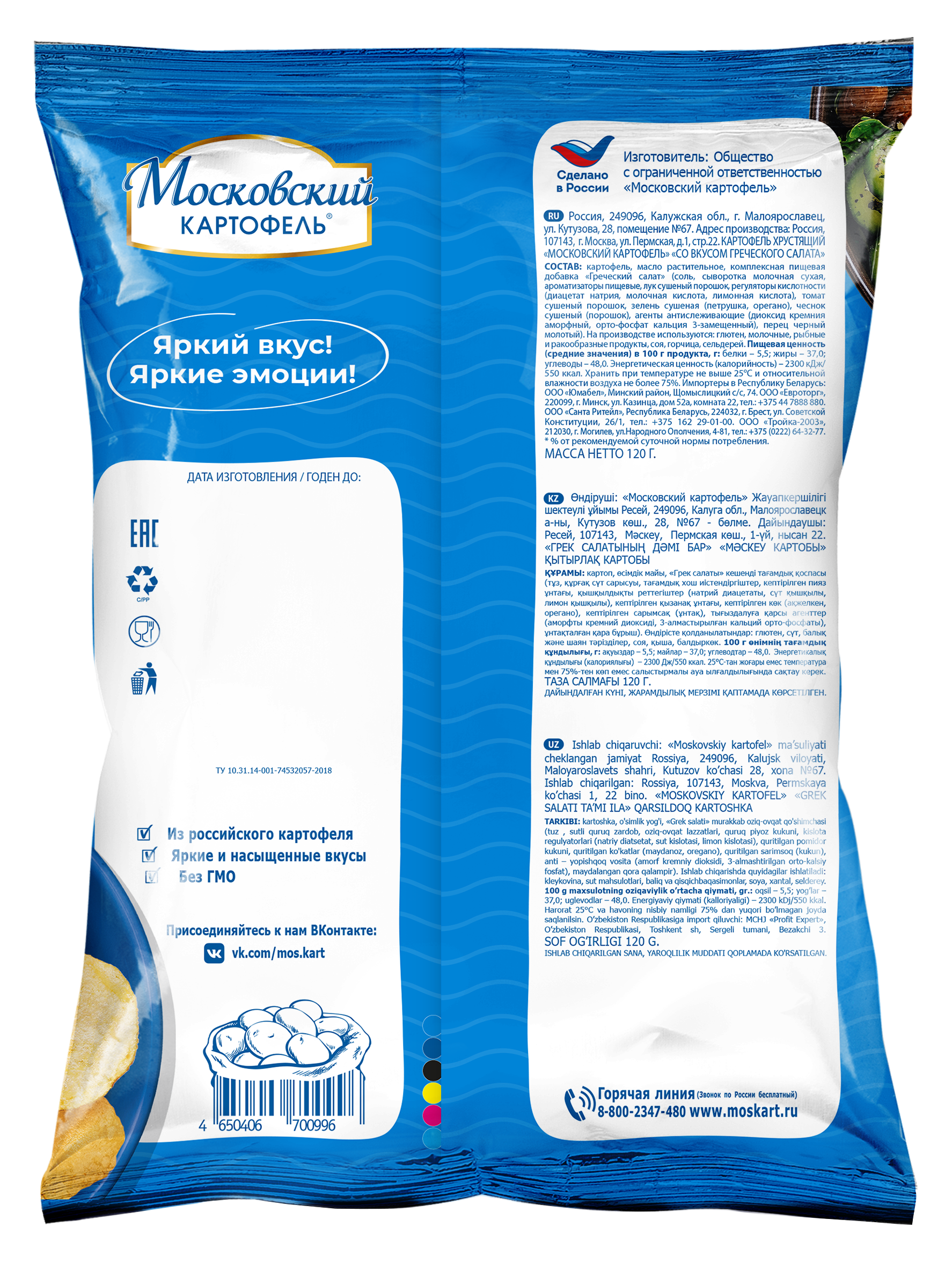 | Московский Картофель | Снеки | Московский картофель: Большая фасовка | Картофель Московский хруст. со вкусом Греческого салата 120г... | 2602173 | Пакет-подушка |  4650406700996 | 120 | 0,00553 | 205 | 90 | 300 |  |  | 20 | Спелые томаты, сочные огурцы, пикантная фета и лёгкая цитрус... | Готовый продукт. | картофель, масло растительное, комплексная пищевая добавка "... | 3D Лицевая Оборотная | 550.0 | 5.5 | 37 | 48 | 9 |  | Хранить при температуре не выше 25°С и относительной влажнос... | 16 | гофрокороб |  4650406701009 | 1,92 | 2,2 | 0,04955 | 585 | 385 | 220 | 1 паллета | 64 | 4 | 448 | 28 | 7 | 4 г/к х 7 слоев | 1690 | ООО Москарт | 107143, Россия, Москва г, ул. Пермская вл. 1 | ЕАЭС N RU Д-RU.РА02.В.55331/25 | 03.03.2025 - 02.03.2030 | соответствует требованиям ТУ 10.31.14-001-74532057-2018 | Скачать | 2005202000 | 10.31.14.000 |