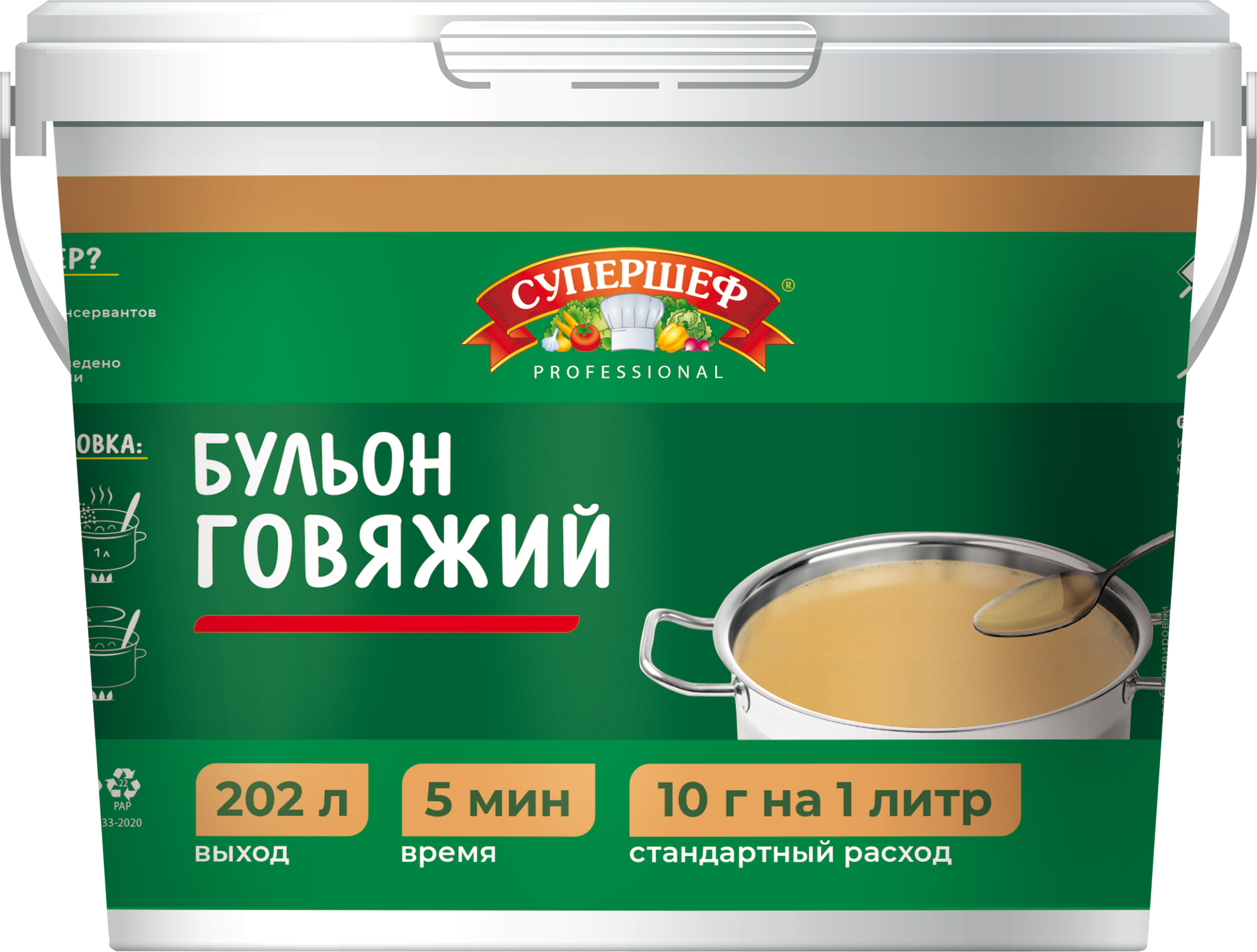 | Супершеф | HoReCa | Супы концентраты | HoReCa Говяжий бульон 2000г/4 уп в кор | 2700288 | ведро |  4680176170118 | 2000 | 0,005 | 200 | 200 | 125 |  |  | 10 | Ваш профессиональный помощник: