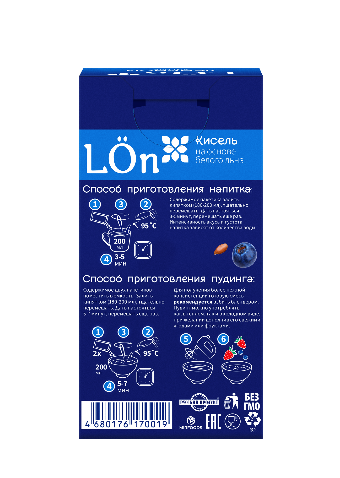 | Lon | Бакалея | Каши моментальные Lon | Овсяно-льняная каша момент "С клубникой и папайей" ТМ "Lon" ... | 2700287 | Пакет |  4680176170071 | 30 | 0,00017 | 100 | 12 | 145 | 01.02.2025 |  | 10 |  | Содержимое пакета высыпать в ёмкость. Добавить 180-200 мл ки... | Мука льняная, хлопья овсяные, папайя сушеная, клубника сушен... | 3D Лицевая Оборотная Групповая уп | 365.0 | 26 | 8.5 | 37 | 12 |  | Хранить при температуре не выше 25°С и относительной влажнос... | 20 | шоу-бокс |  4680176170088 | 0,6 | 0,735 | 0,00434 | 107 | 265 | 153 | Слой | 660 | 33 | 6600 | 330 | 10 | 33 ш/б х 10 слоев | 1690 | ООО Мирфудс | 249080, Россия, Калужская обл, Малоярославецкий р-н, Детчино... | ЕАЭС N RU Д-RU.РА05.В.74003/25 | 07.07.2025 - 31.07.2027 | соответствует требованиям ТУ10.61.33-066-44418433-2019 | Скачать | 1904908000 | 10.61.33.110 |