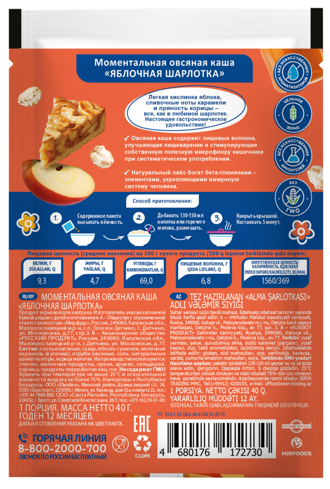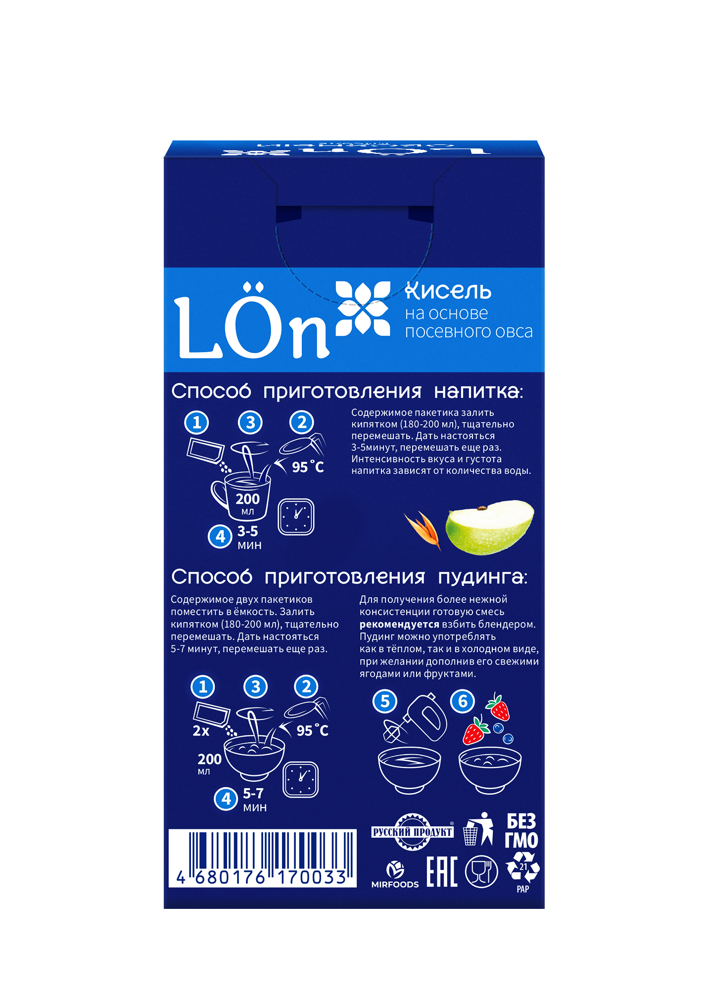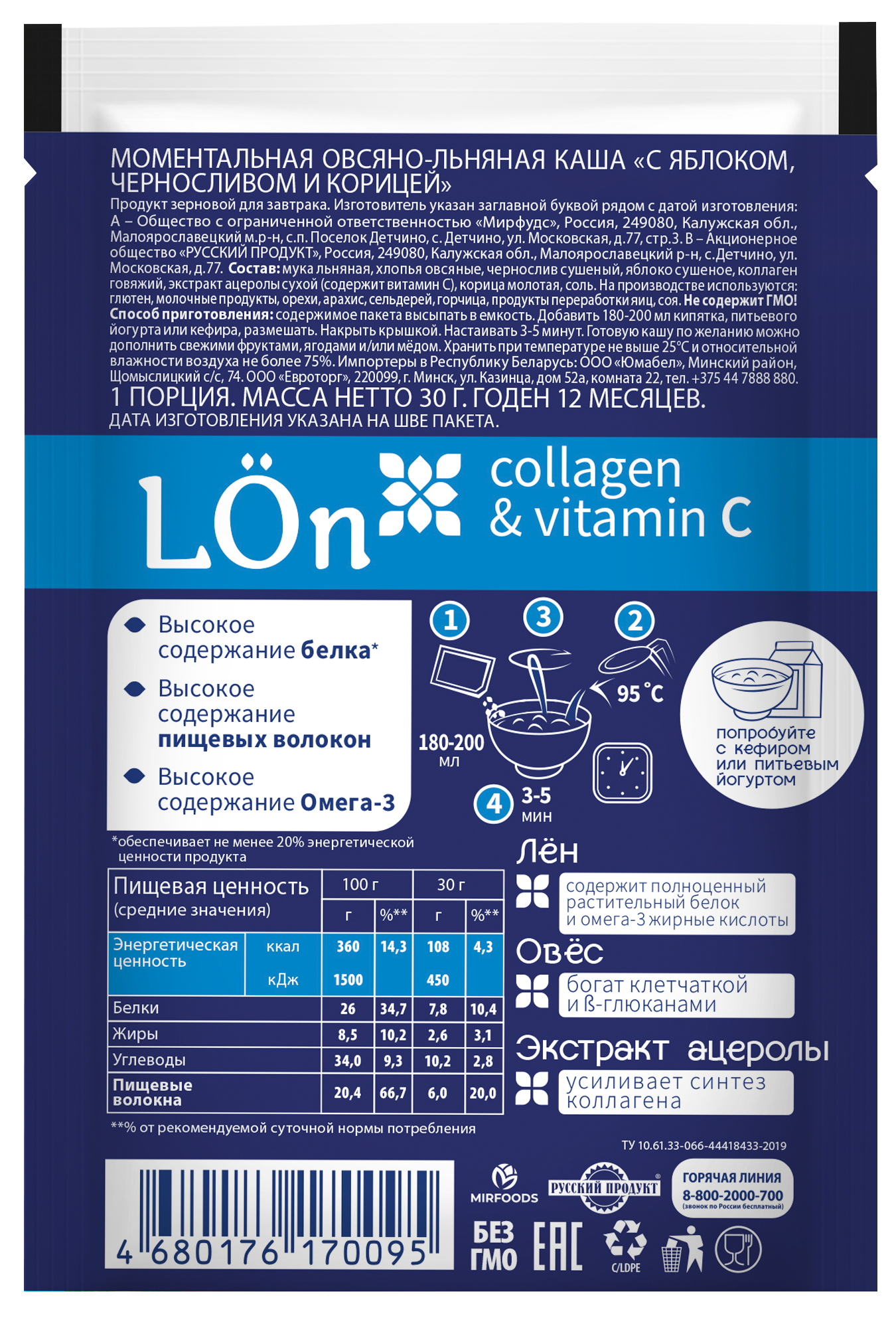 | Lon | Бакалея | Каши моментальные Lon | Овсяно-льняная каша момент "С яблоком, черносливом и корицей... | 2700284 | Пакет |  4680176170095 | 30 | 0,00017 | 100 | 12 | 145 | 01.02.2025 |  | 10 |  | Содержимое пакета высыпать в ёмкость. Добавить 180-200 мл ки... | Мука льняная, хлопья овсяные, чернослив сушеный, яблоко суше... | 3D Лицевая Оборотная Групповая уп | 360.0 | 26 | 8.5 | 34 | 12 |  | Хранить при температуре не выше 25°С и относительной влажнос... | 20 | шоу-бокс |  4680176170101 | 0,6 | 0,735 | 0,00434 | 107 | 265 | 153 | Слой | 660 | 33 | 6600 | 330 | 10 | 33 ш/б х 10 слоев | 1690 | ООО Мирфудс | 249080, Россия, Калужская обл, Малоярославецкий р-н, Детчино... | ЕАЭС N RU Д-RU.РА05.В.74003/25 | 07.07.2025 - 31.07.2027 | соответствует требованиям ТУ10.61.33-066-44418433-2019 | Скачать | 1904908000 | 10.61.33.110 |