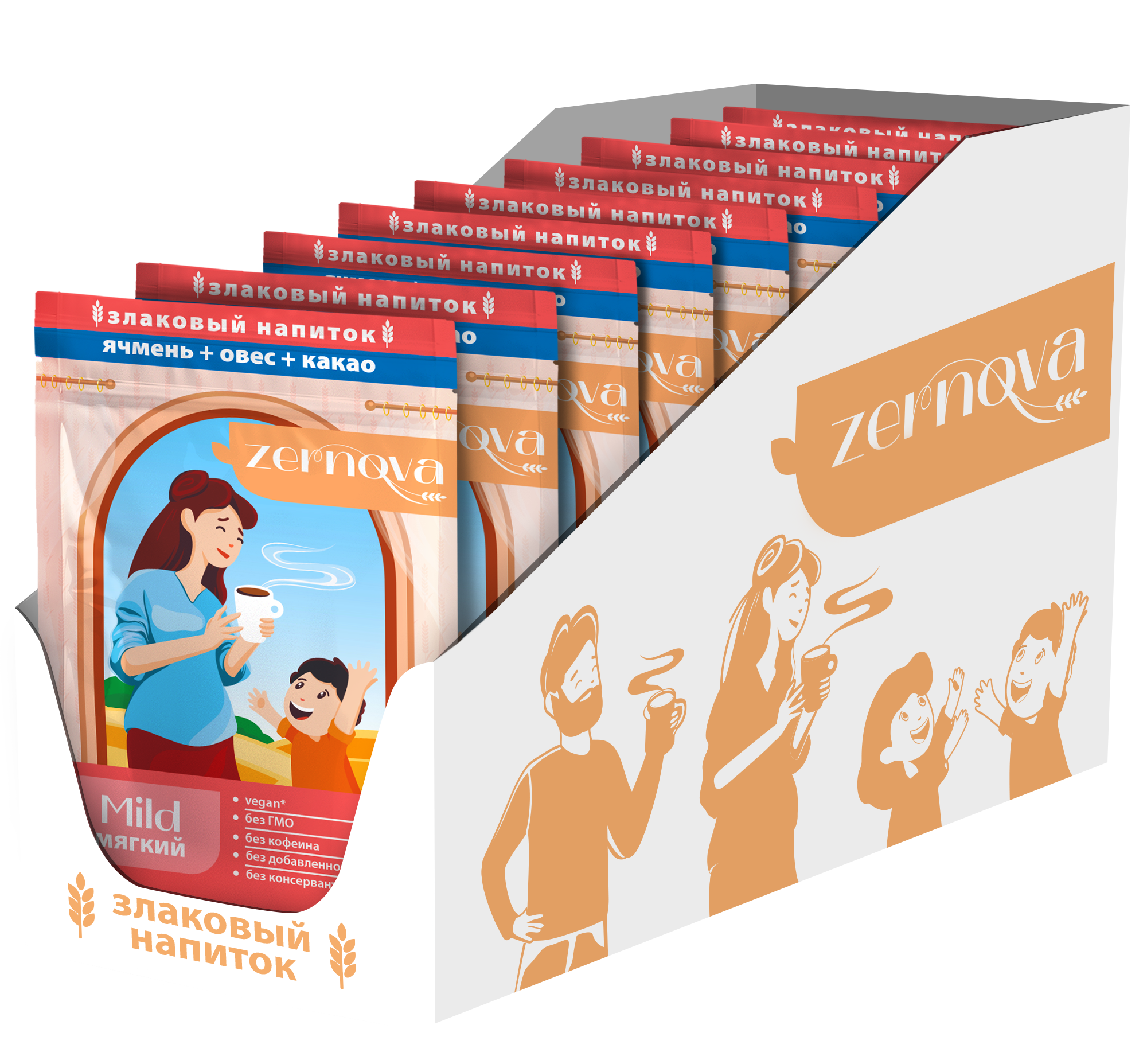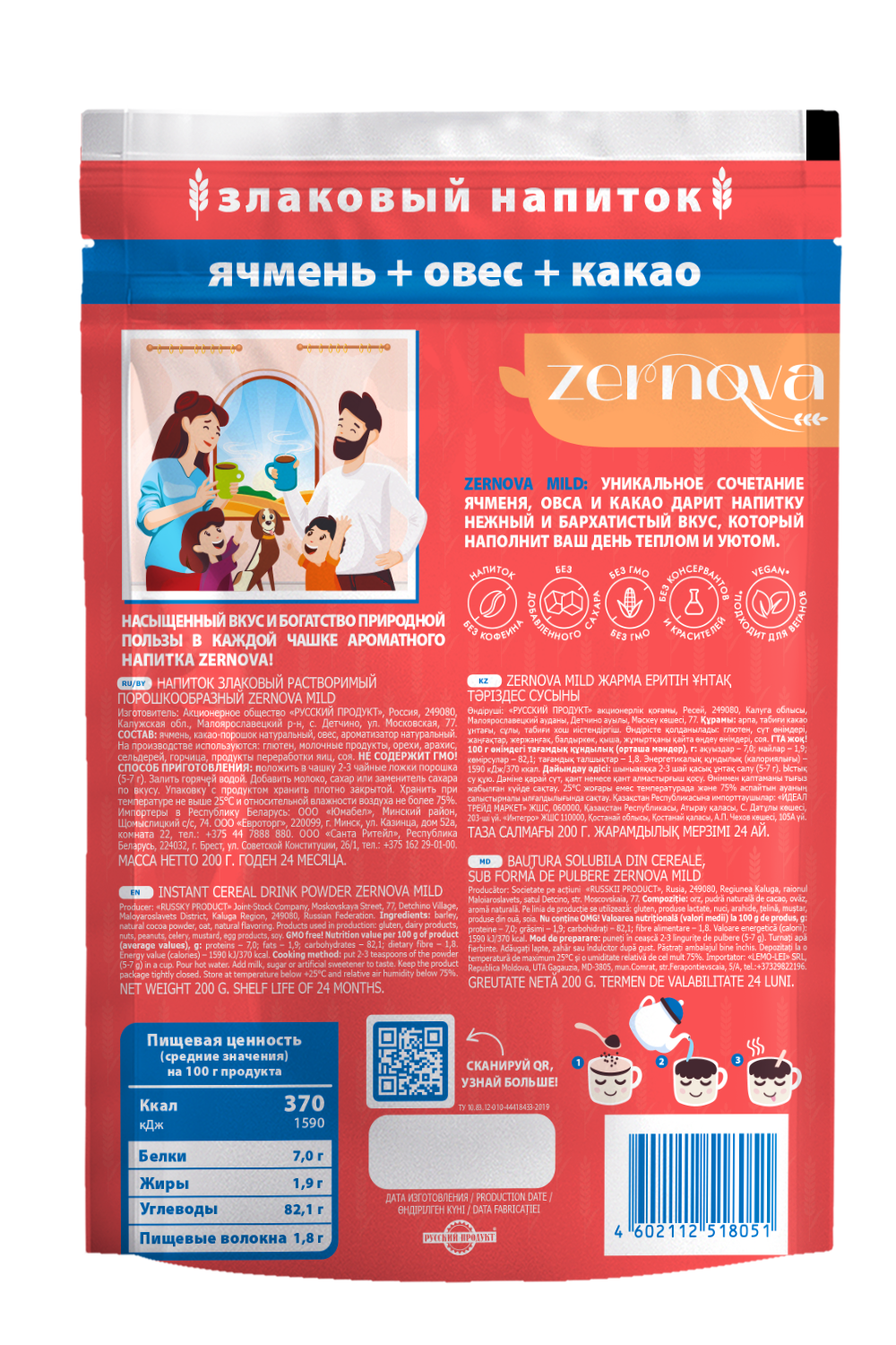 | Zernova | Напитки | Злаковые напитки Zernova | Напиток злаковый раств. порош. Zernova Mild 200 г 9 уп в шоу... | 2127011 | стоячий пакет |  4602112518051 | 200 | 0,00173 | 160 | 45 | 240 |  |  | 20 | ZERNOVA MILD - УНИКАЛЬНОЕ СОЧЕТАНИЕ ЯЧМЕНЯ, ОВСА И КАКАО ДАР... | 	Положить в чашку 2-3 чайные ложки порошка (5-7 г).