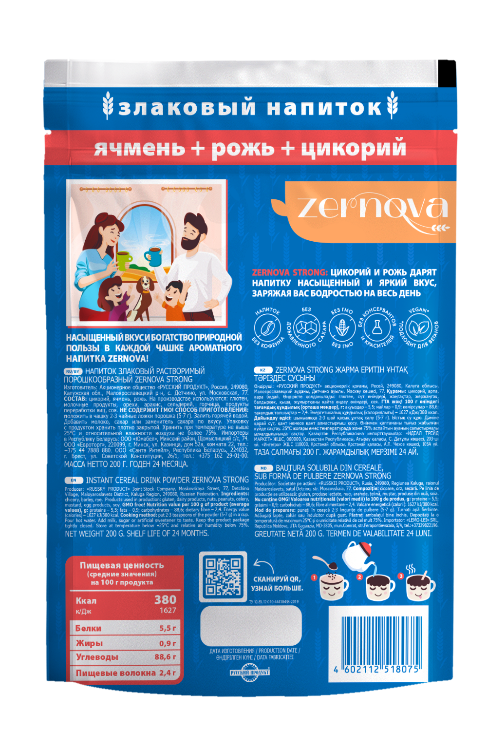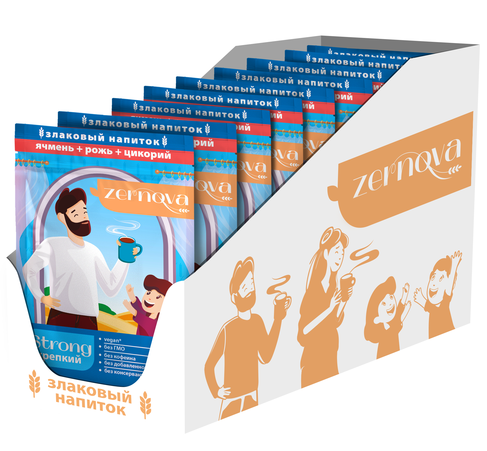 | Zernova | Напитки | Злаковые напитки Zernova | Напиток злаковый раств. порош. Zernova Strong 200 г 9 уп в ш... | 2127012 | стоячий пакет |  4602112518075 | 200 | 0,00173 | 160 | 45 | 240 |  |  | 20 | ZERNOVA STRONG - ЦИКОРИЙ И РОЖЬ ДАРЯТ НАПИТКУ НАСЫЩЕННЫЙ И Я... | 	Положить в чашку 2-3 чайные ложки порошка (5-7 г).